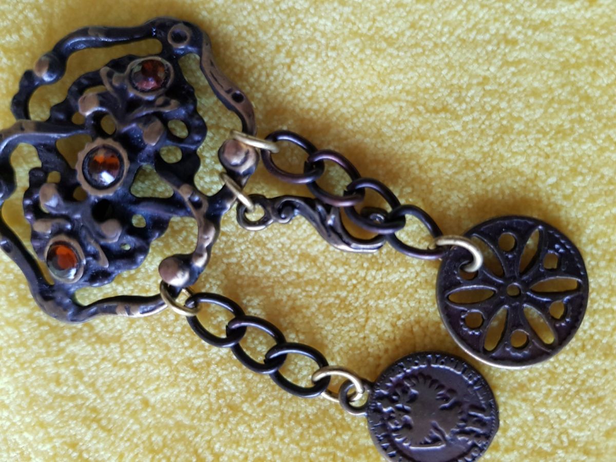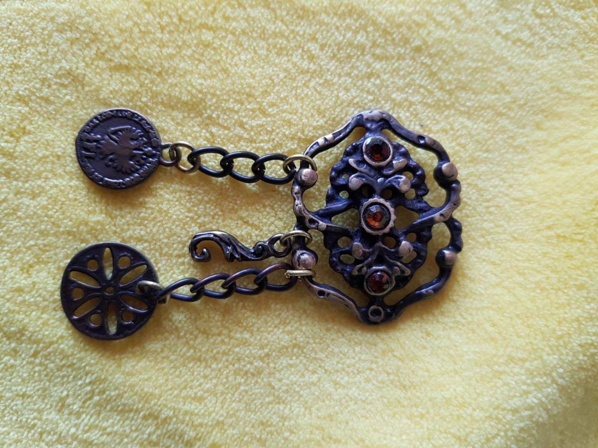 Broche style ancien. ornée de petites perles orange. fermée par épingle