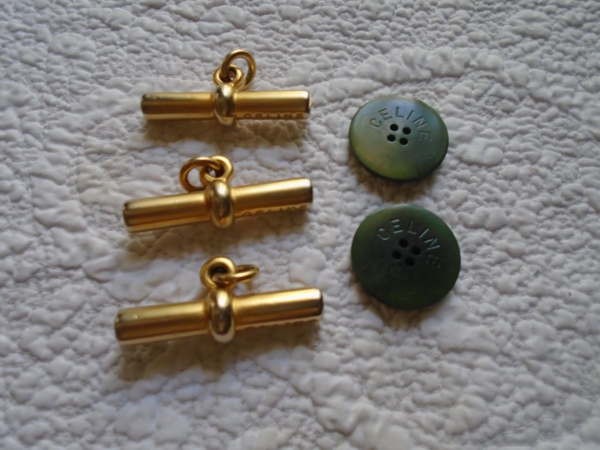 3 boutons brandebourg gravés Céline, 2 boutons en corne verte gravés Céline