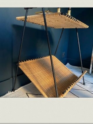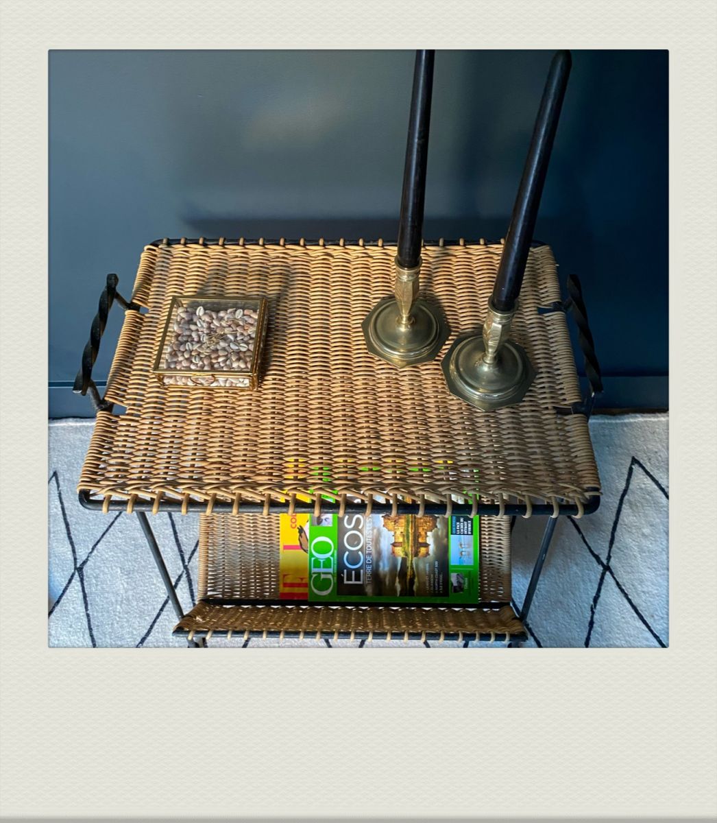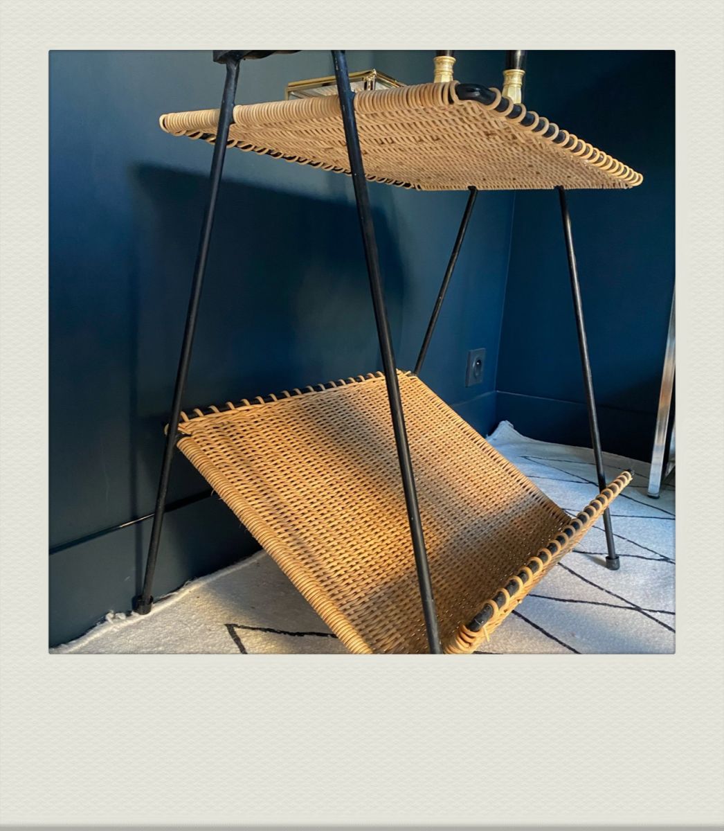 Faite de rotin et de fer forgé, j’ai simplement renouvelé les embouts des pieds qui étaient « cuits » par le temps.Quelques marques du temps, il faut dire que cette jolie chose polyvalente a au moins 60 ans!