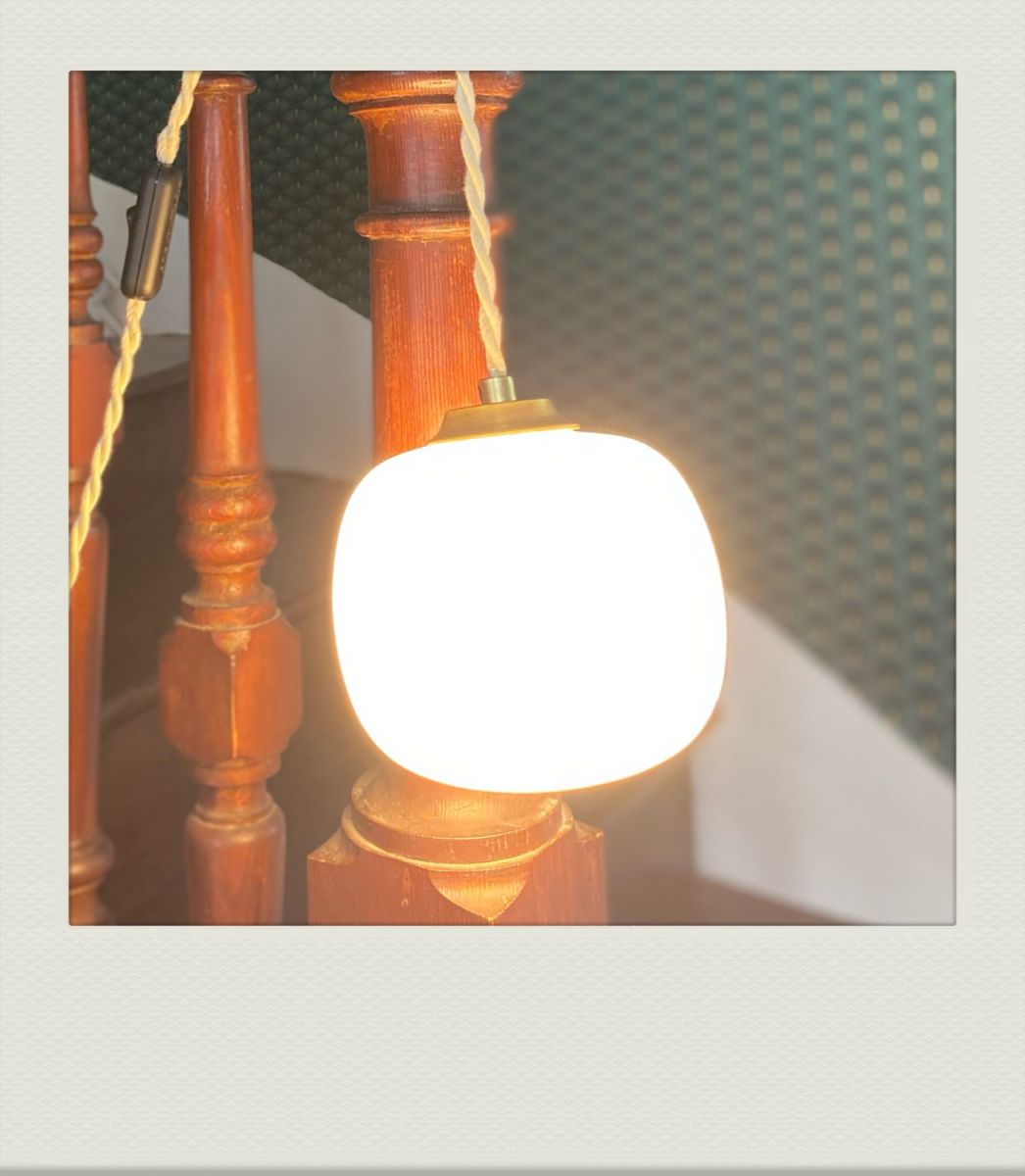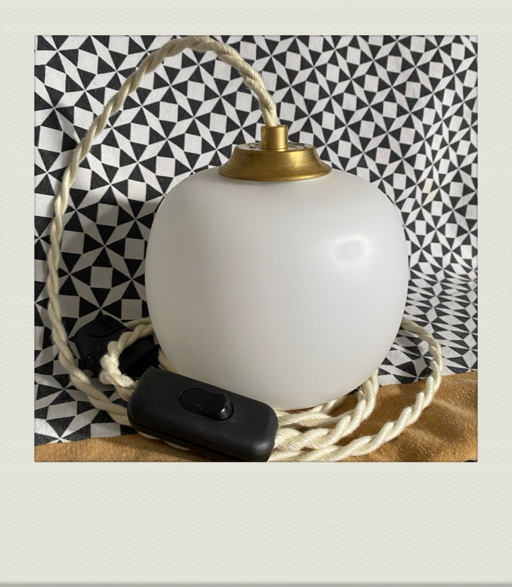 Petit globe rond opaque, légèrement irisé de près, cordon torsadé couleur crème.