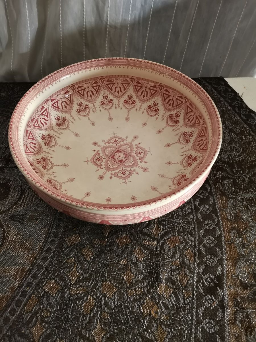 Belle cuvette de service de toilette céramique émaillée. Modèle Calcutta, Sarreguemines. Estampillé. Décor indien soutenu sur fond rouge clair. Bel état de conservation, légères traces d'usage. Des embrasures et fêlures présents voir photo.