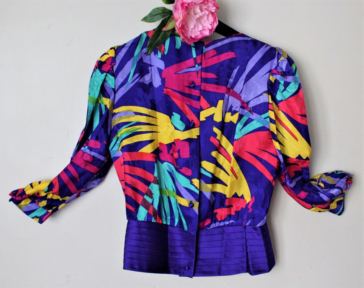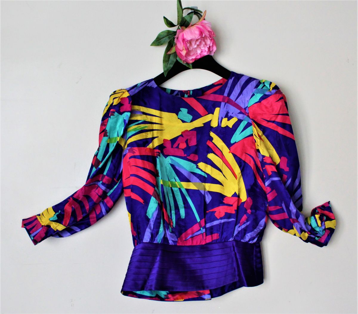 Haut en soie Vintage 36/38 violet rose turquoise jaune