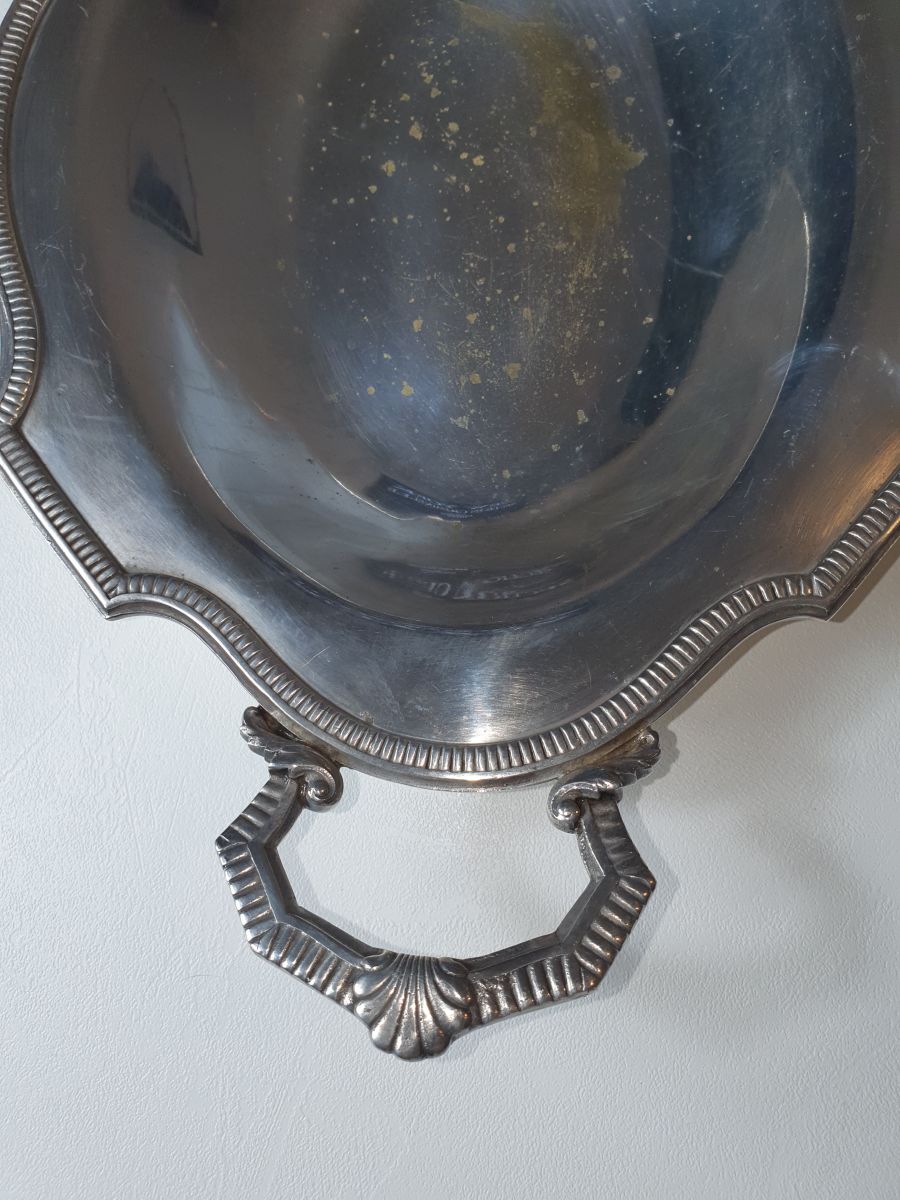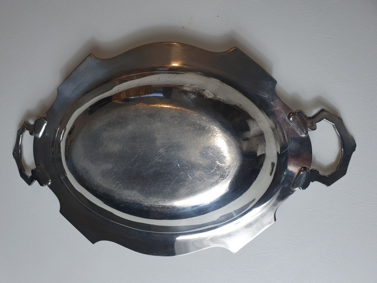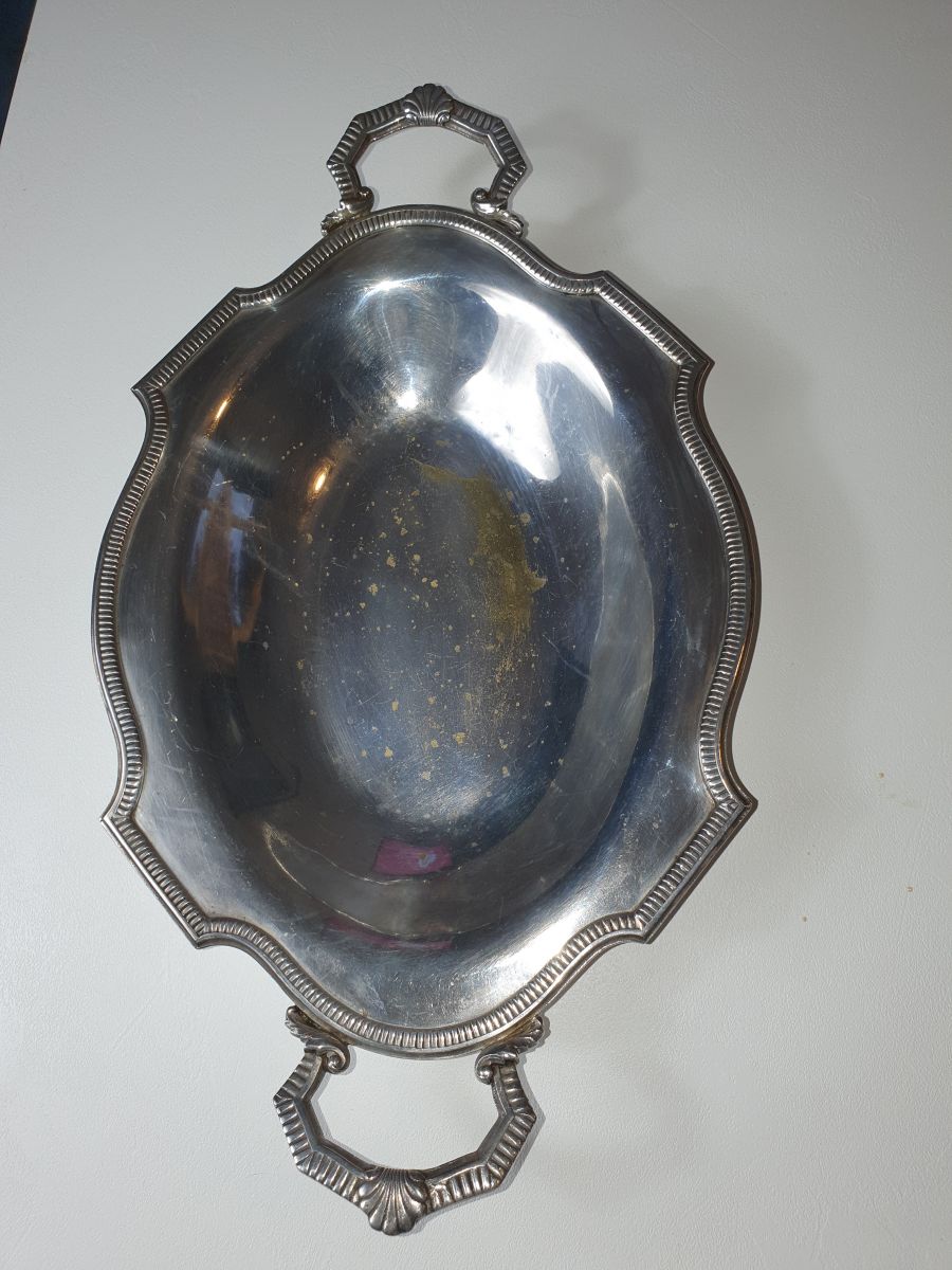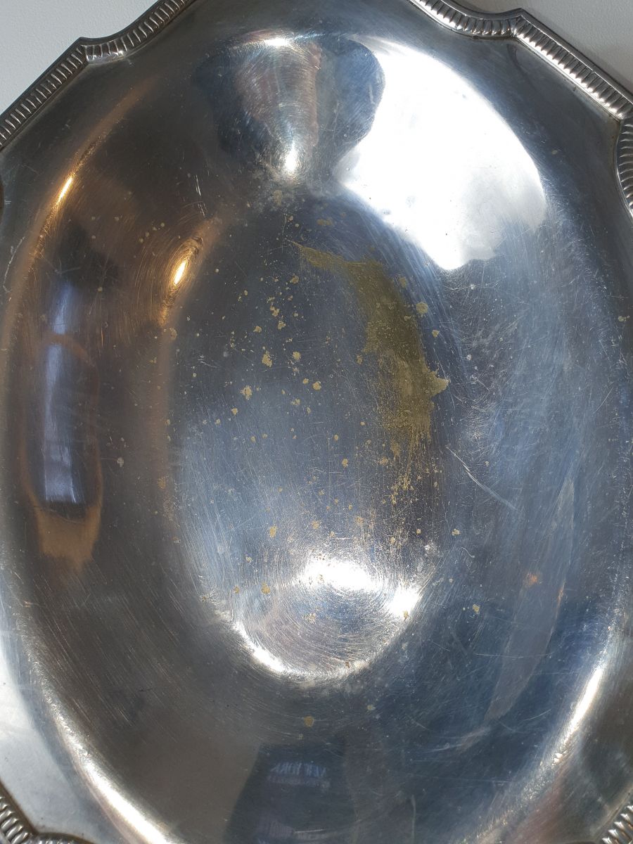 Légumier / plat en métal argenté qui a déjà bien servi. Apres grand nettoyage, j'ai découvert les traces jaunes...
