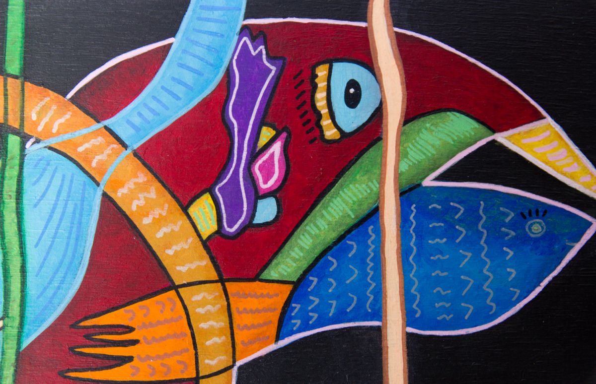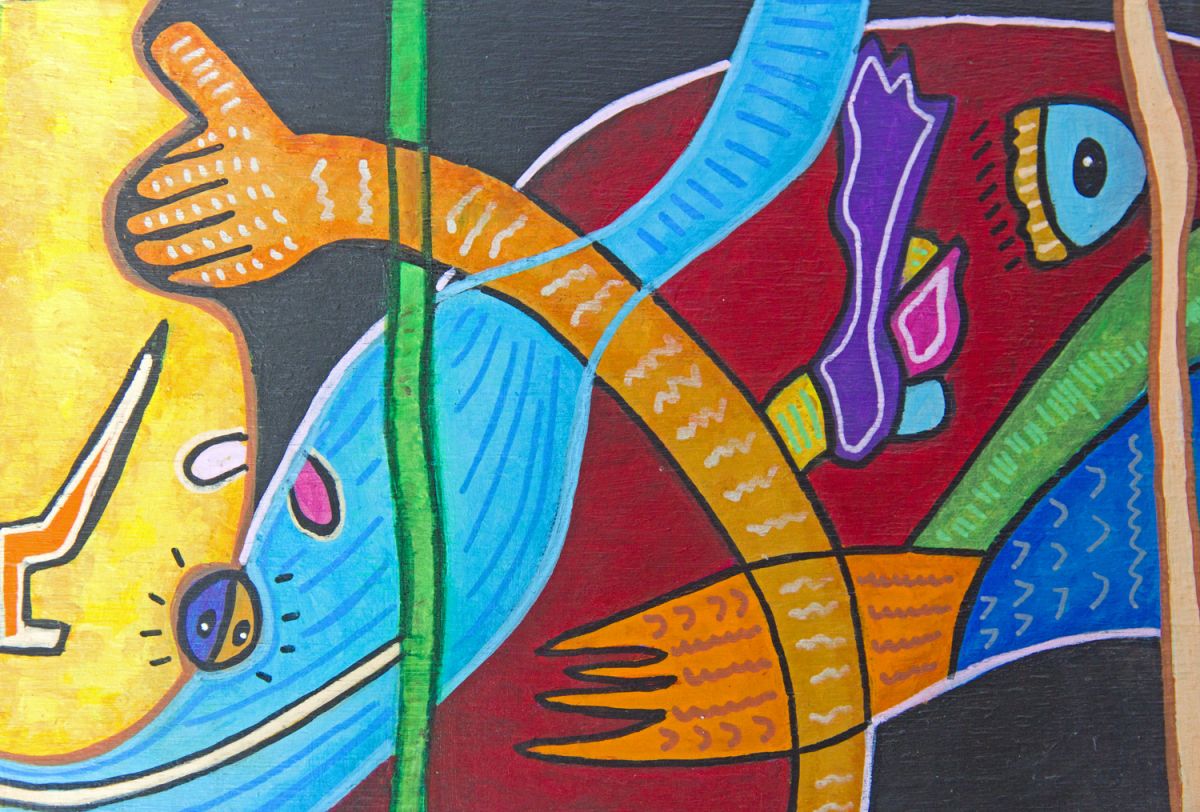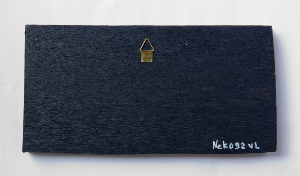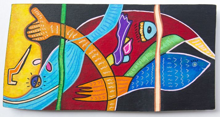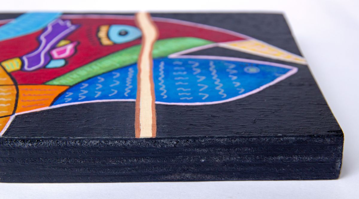 Peinture sur bois de récupération laissé dans son format d'origine, découpe pas parfaitement droite.