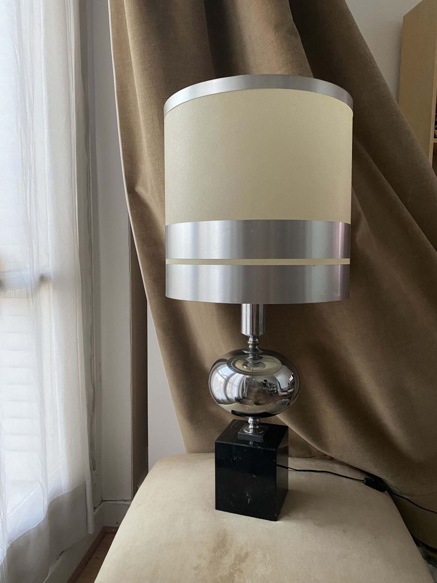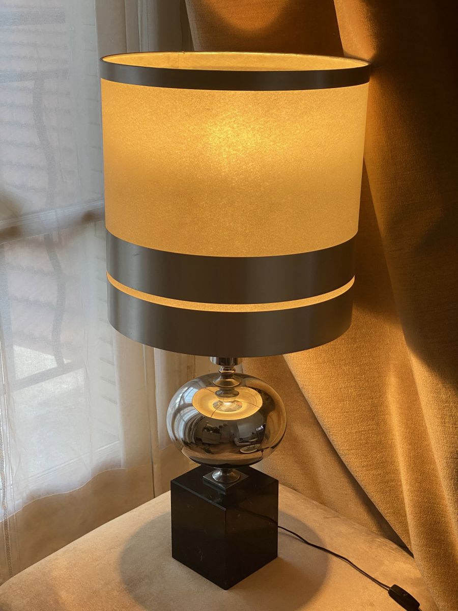 Lampe vintage en métal et en marbre de Philippe Barbier dans les années 70. En parfait état avec des abat-jour propres... Elle a été nettoyée. Bon état général. Très lourde 16 kg. Diamètre sphère metal: 27 cm. Hauteur: 75. Diametre total: 35cm. Le base en marbre: h13cm X l10cm.