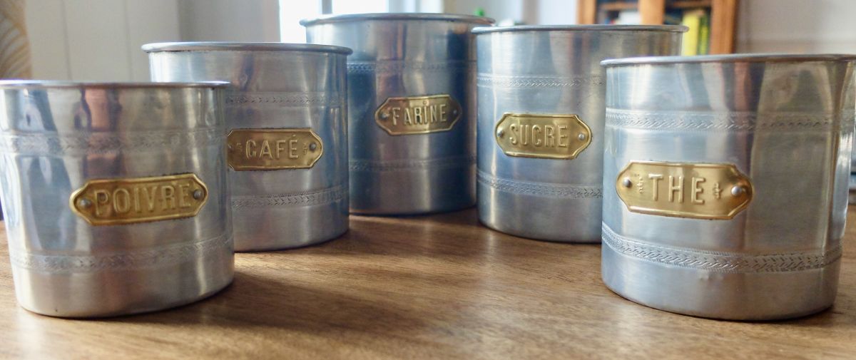 Série de 5 pots à épices en fer blanc, vintage, environ années 40-50. Un petit décor travaillé dans le métal, avec une étiquette en laiton.