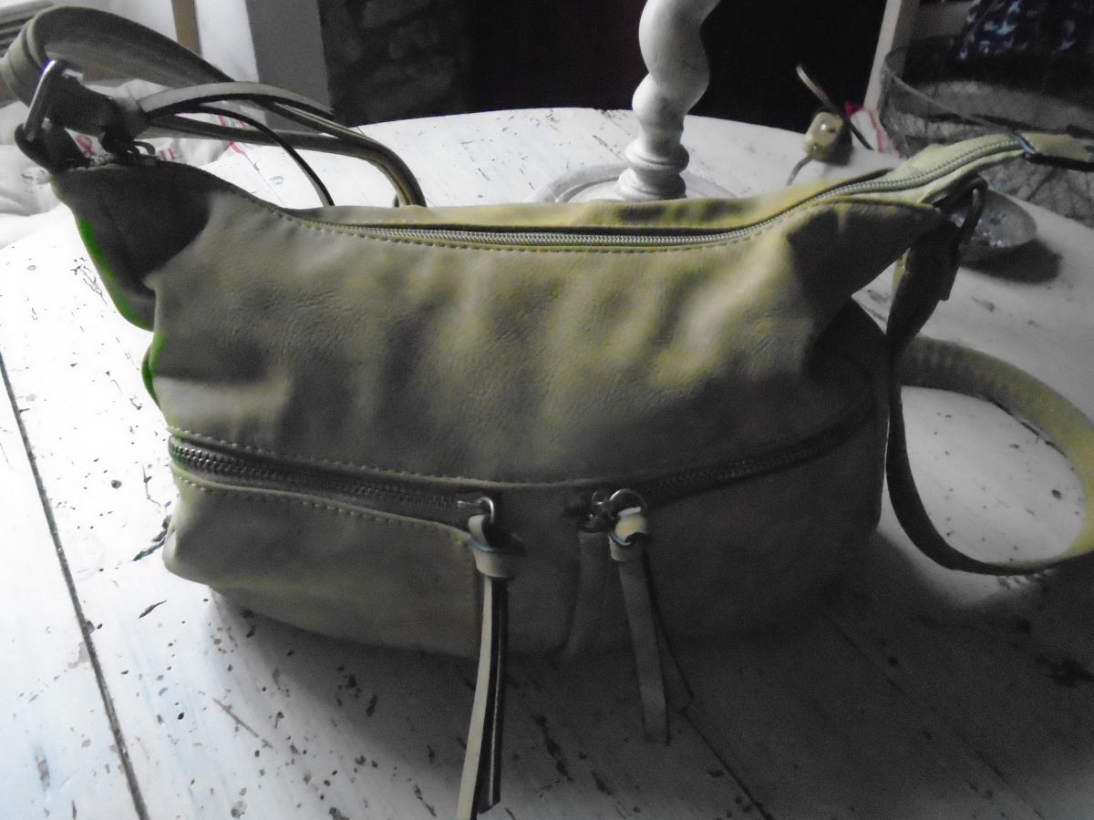 Sac façon daim beige kaki, intérieur en tissu très bon état, poches zippées devant et au dos, bandoulière réglable