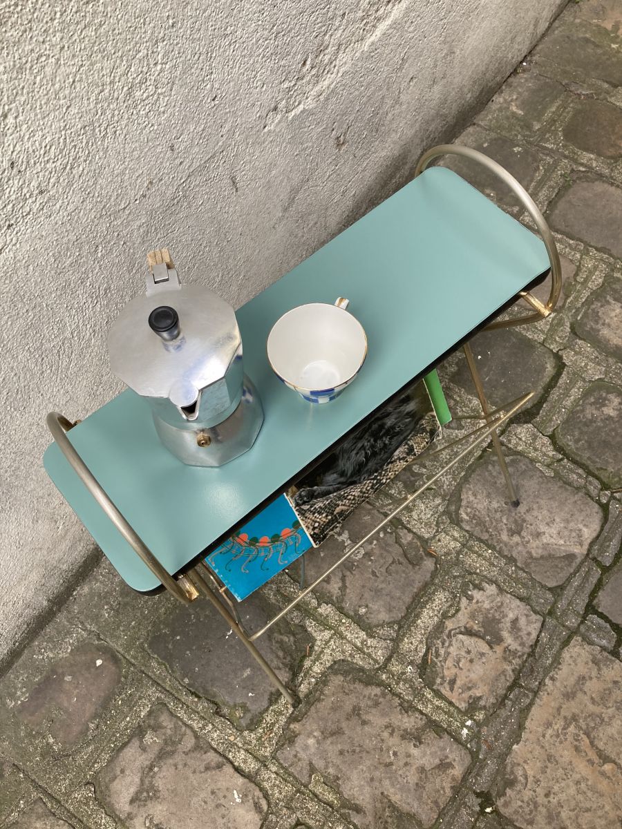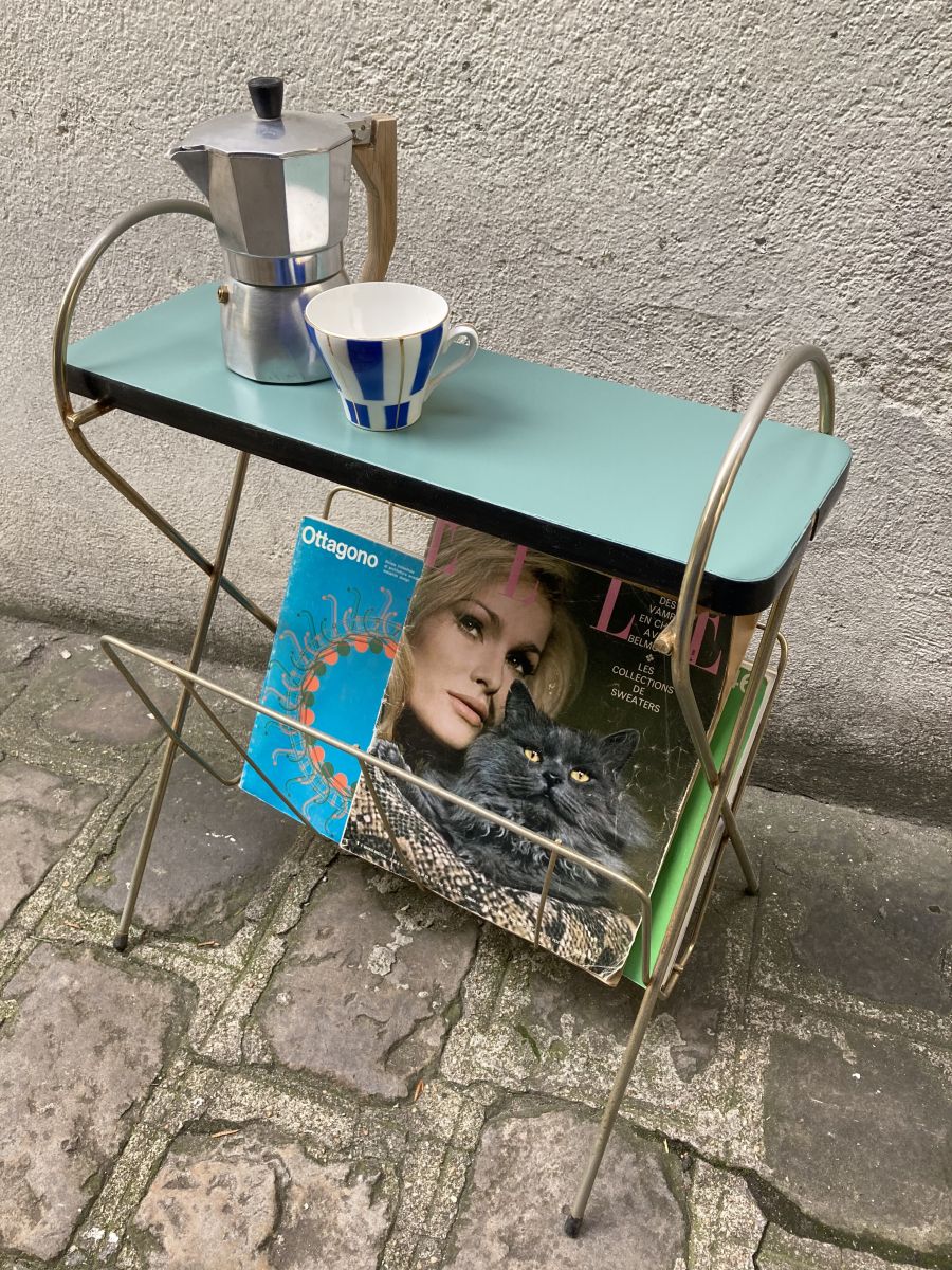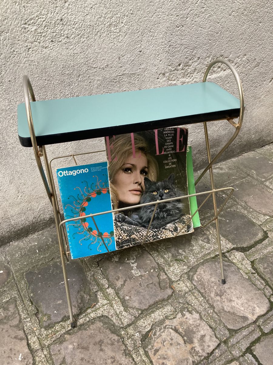 En métal doré (dorure un peu passée à certains endroits mais lui donne une jolie patine) et tablette en formica avec gaine en plastique noire.