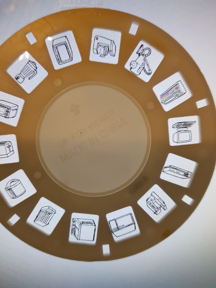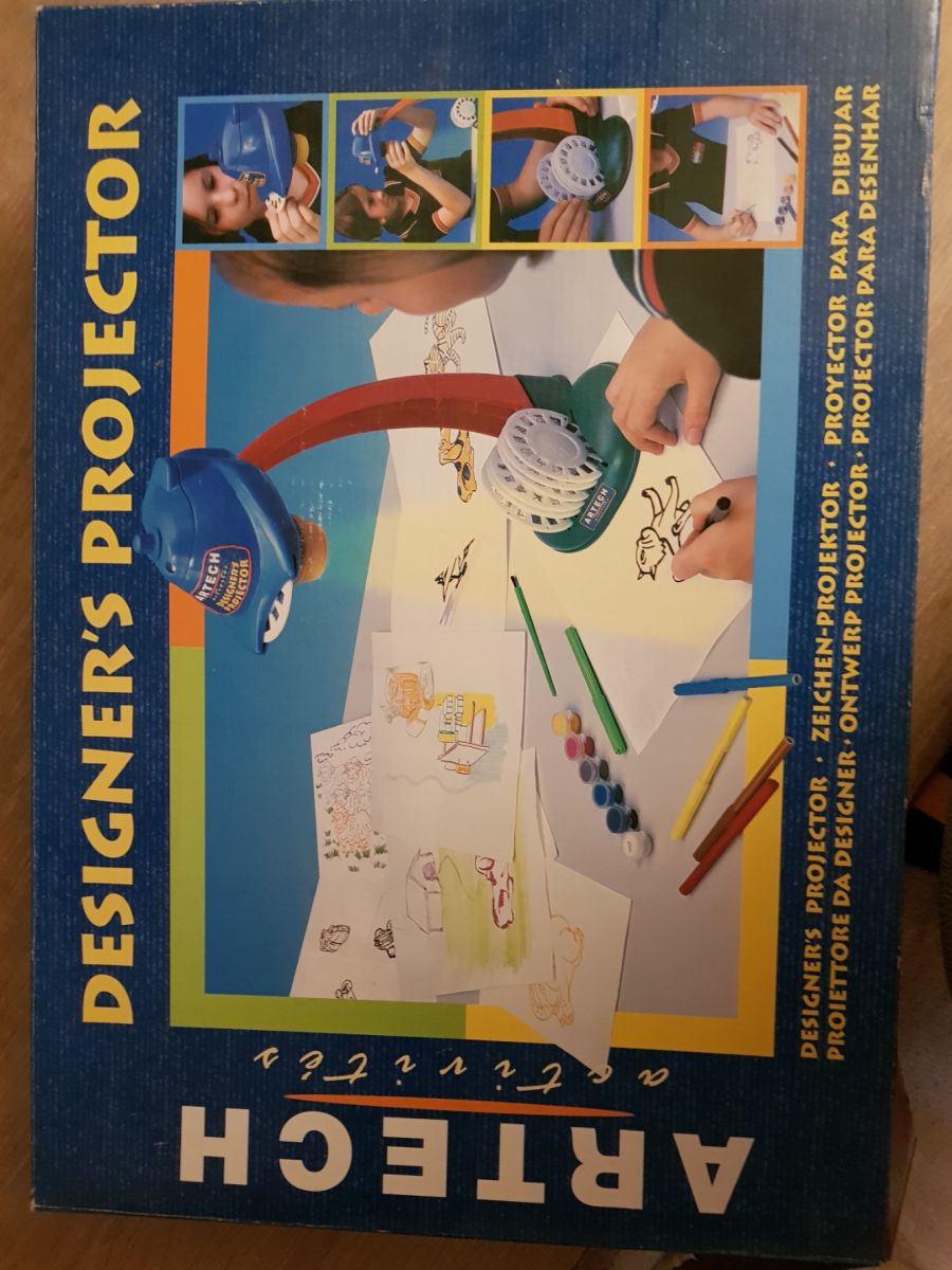 le principe du projecteur (Dans la partie bleue on insère un disque qui projette un dessin à l'aide de la lumière et l'on repasse avec des feutres ou des crayons sur le contour. Des heures d'amusement.