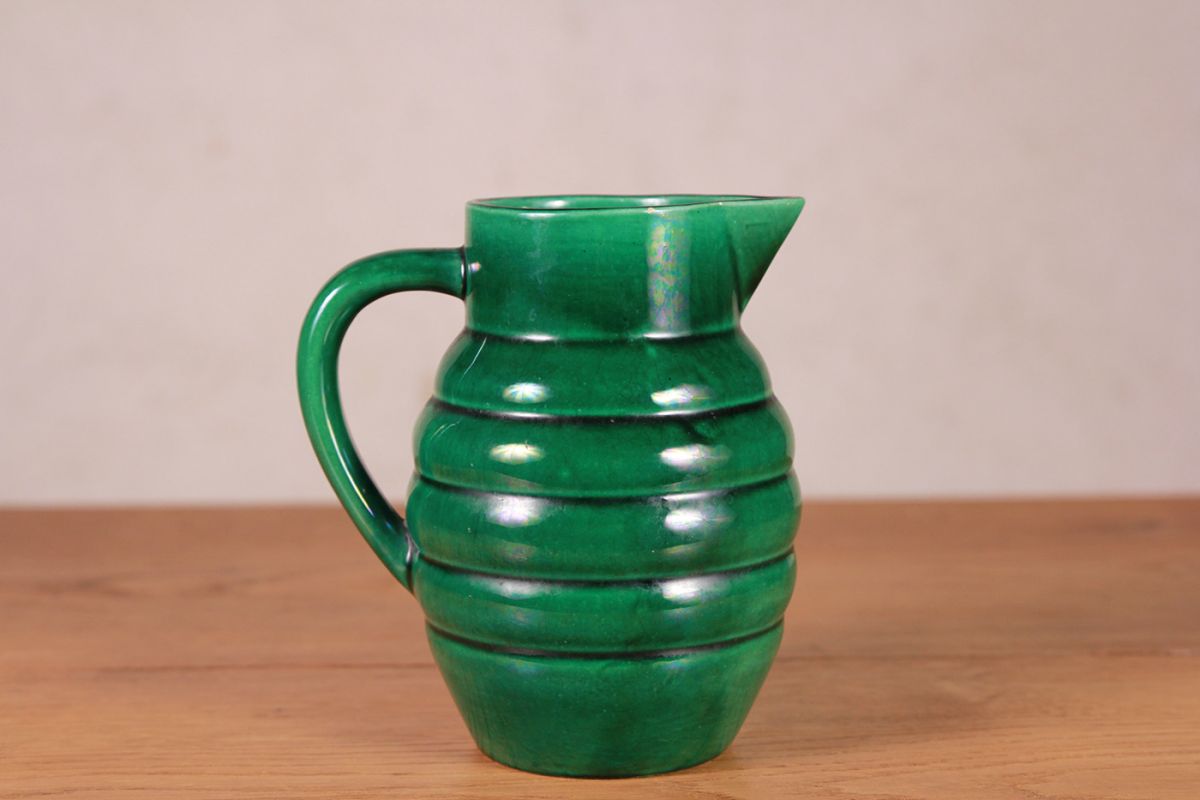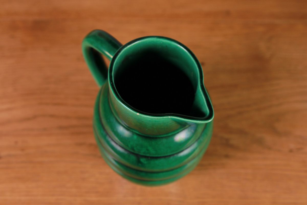 Carafe ancienne en céramique avec email vert en parfait état, signée. Pichet, pot, cruche ancienne.