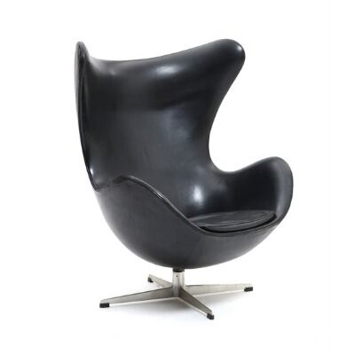 Arne Jacobsen: « The Egg Chair ». Fabriqué par Fritz Hansen. Description : Petit fauteuil avec base et tige en aluminium profilé, coque et coussin lâche recouverts de cuir patiné noir. Modèle 3317. Conçu en 1958. Fabriqué et marqué avec l’étiquette par Fritz Hansen en 1964. Littérature: Carsten Thau et Kjeld Vindum, “Arne Jacobsen”, 1998, p. 144 et 432-433, 438-439, 467, 471-472. Noritsugu Oda, “Danish Chairs”, 1999, p. 60