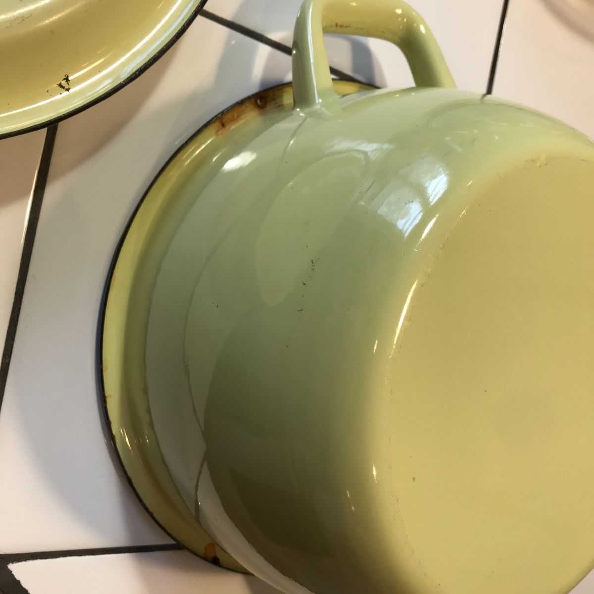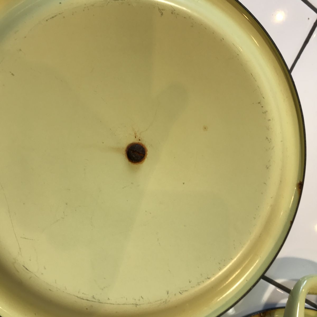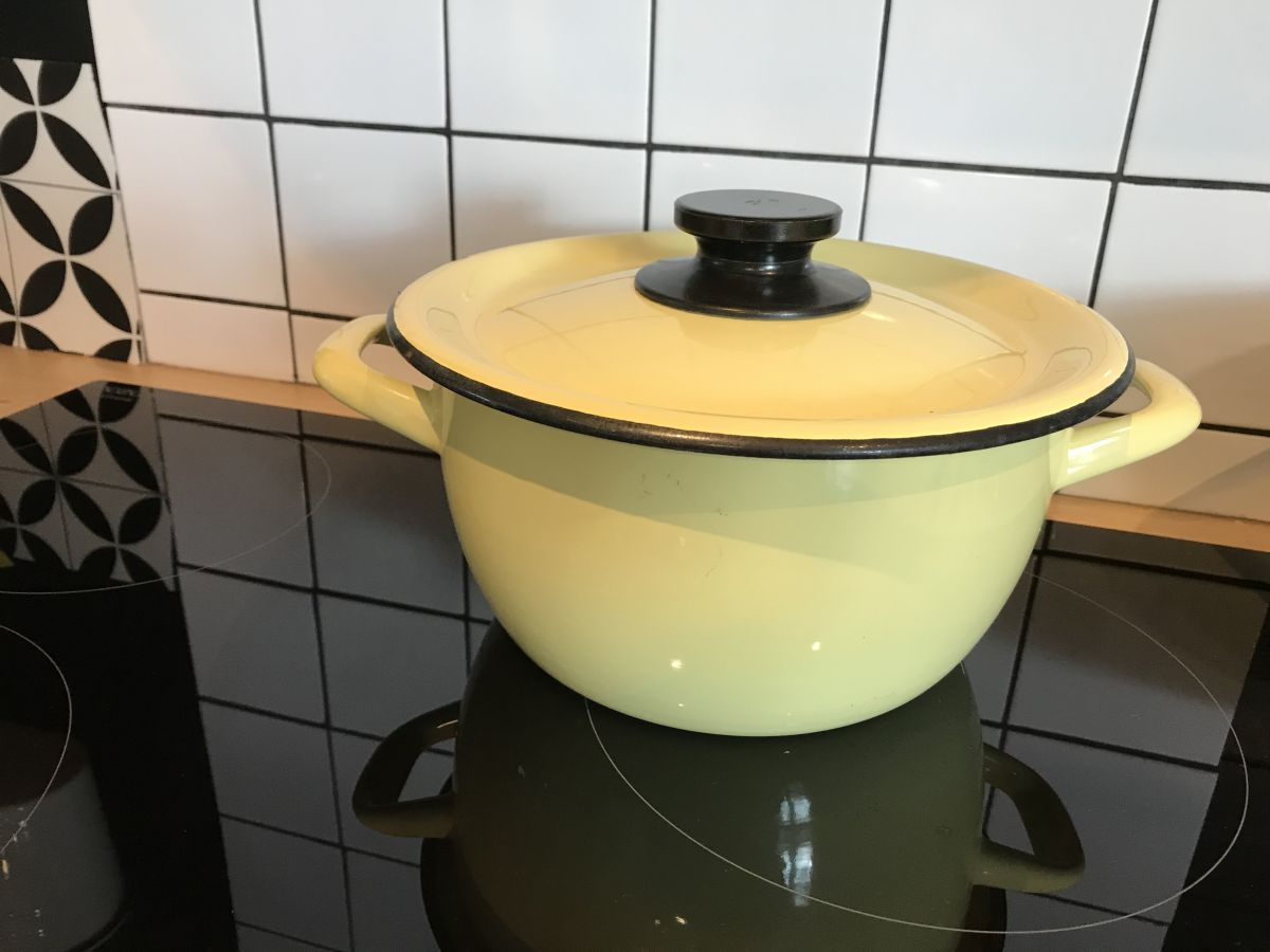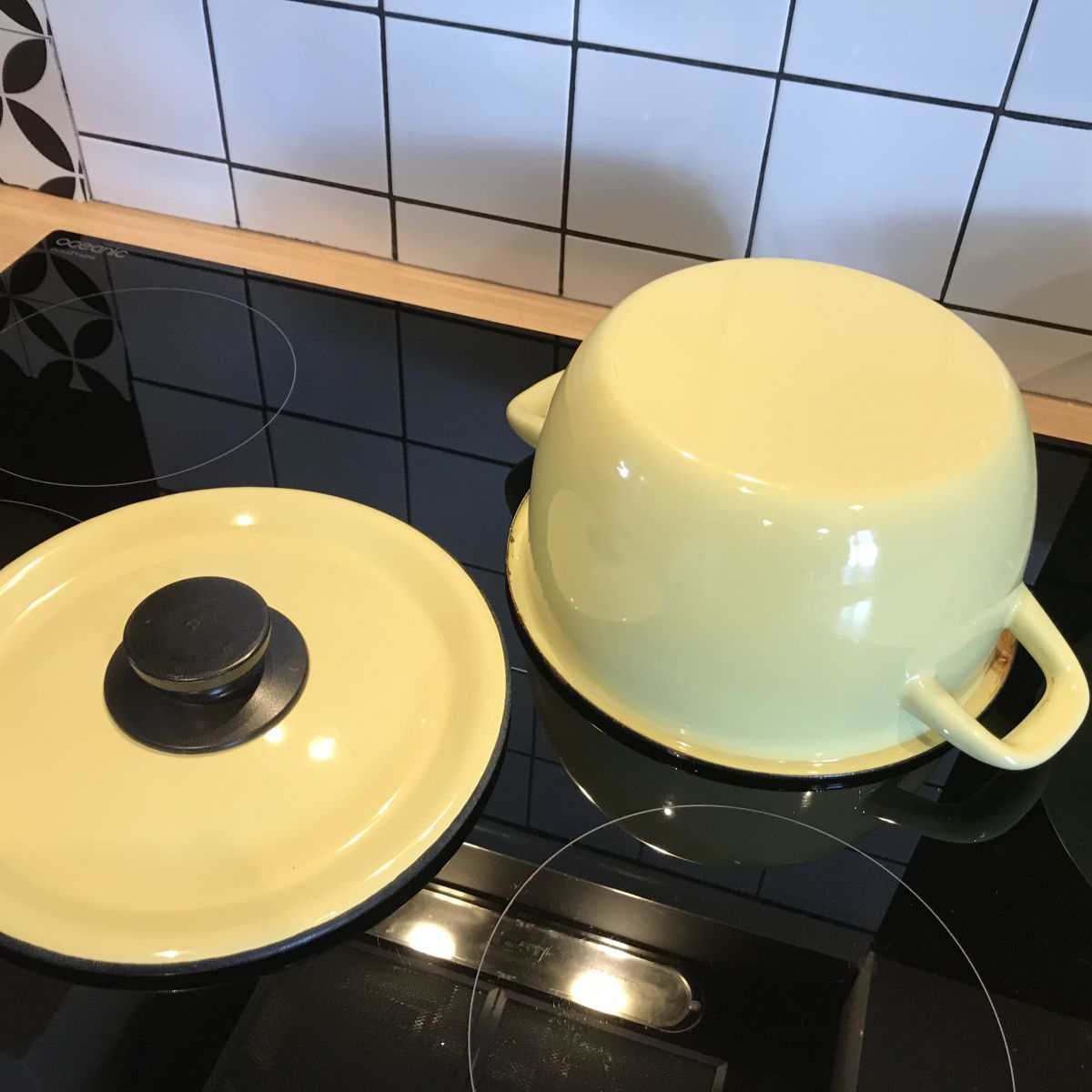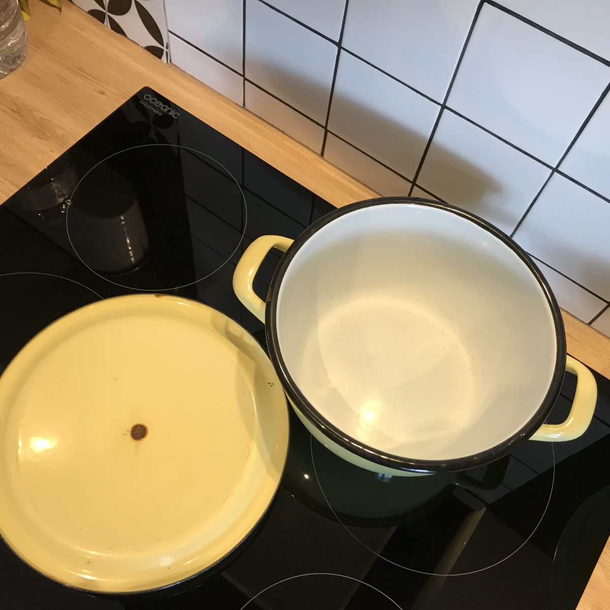 Faitout/cocotte émaillé jaune dans un état relativement correct mais il y a quelques points de rouille sur la vis de fixation du couvercle (mais celui ci tient très bien) , quelques traces de rouille aussi sous le rebord de la cocotte.