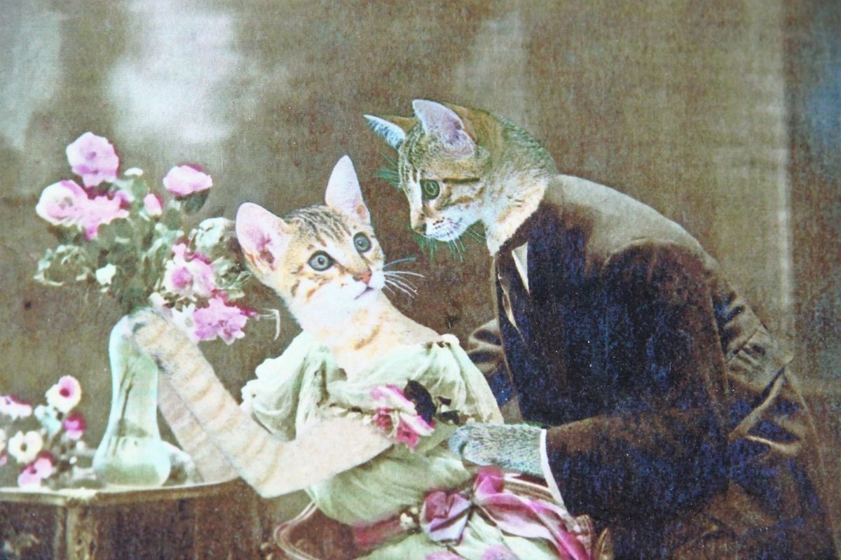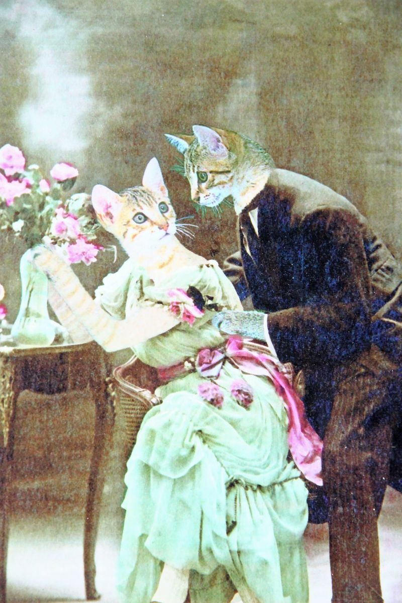 Reproduction sur carton entoilé d'une ancienne carte postale des années 1900, j'ai mis des chats à la place des humains d'origine, montage photographique.