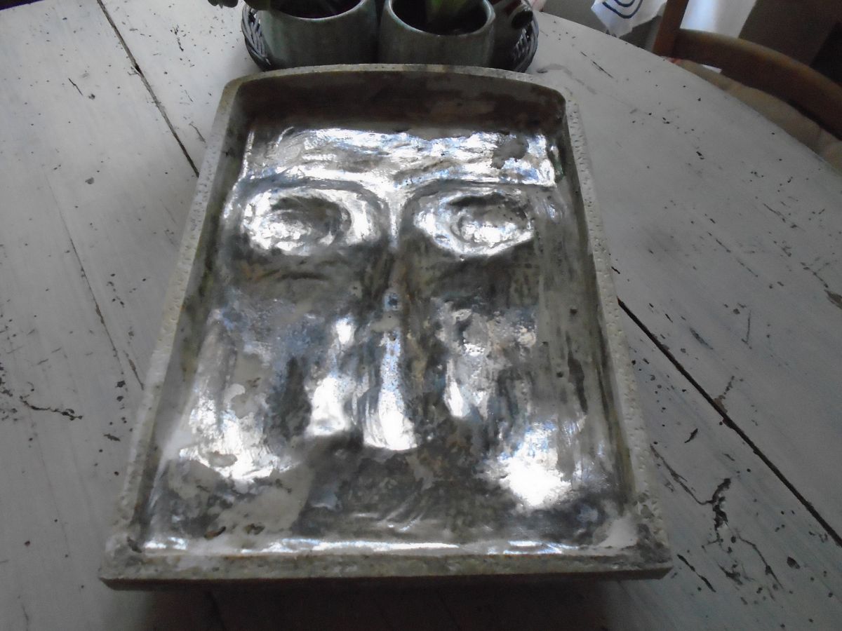 Moulage tête de bouddha en plâtre doré, fêlure d'origine sur le visage