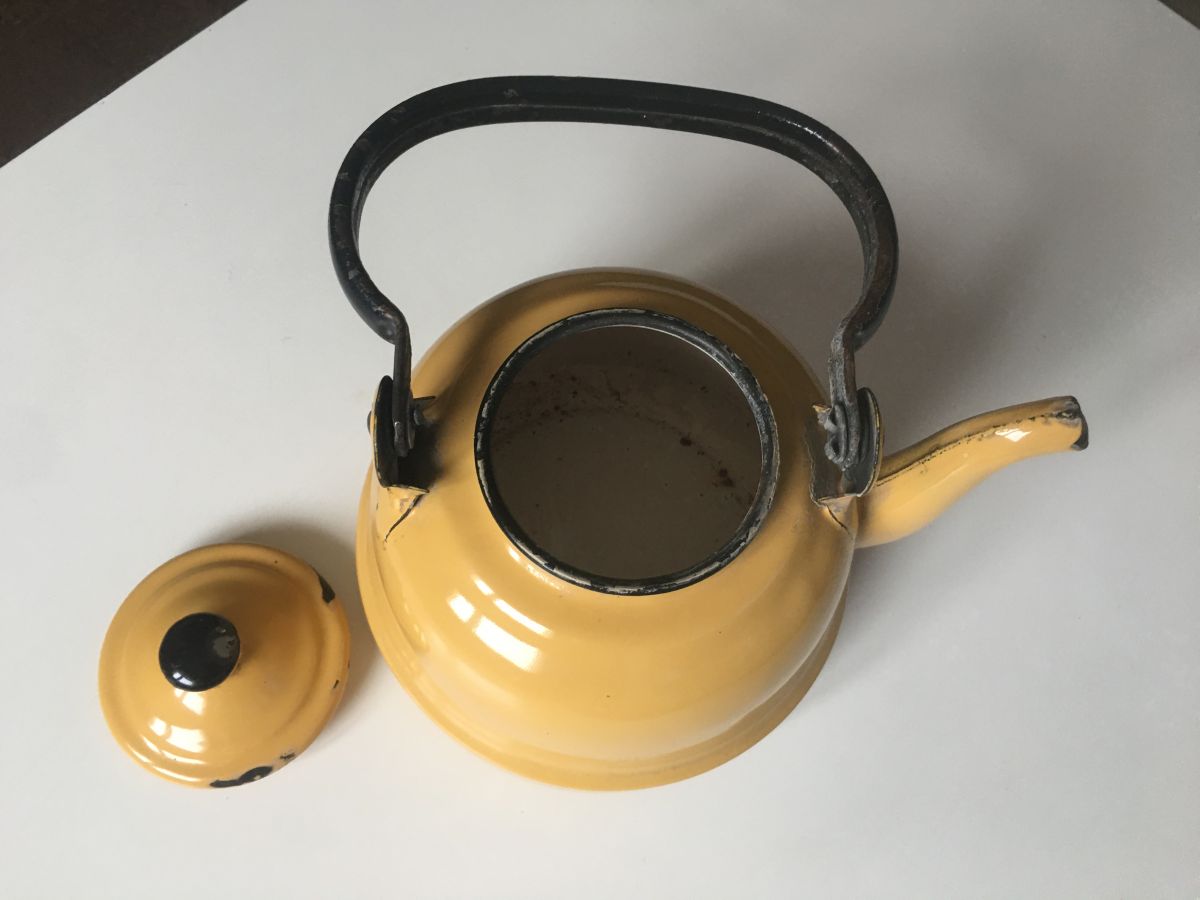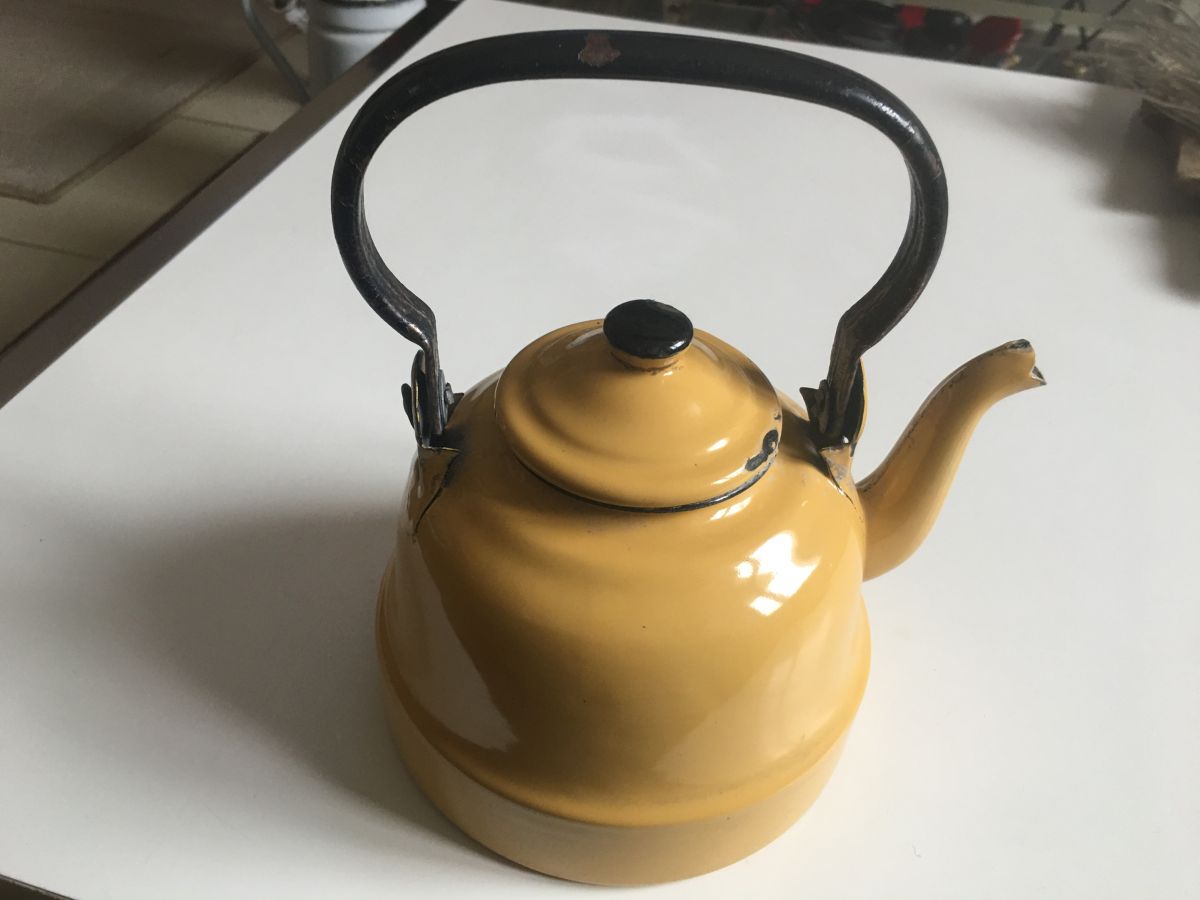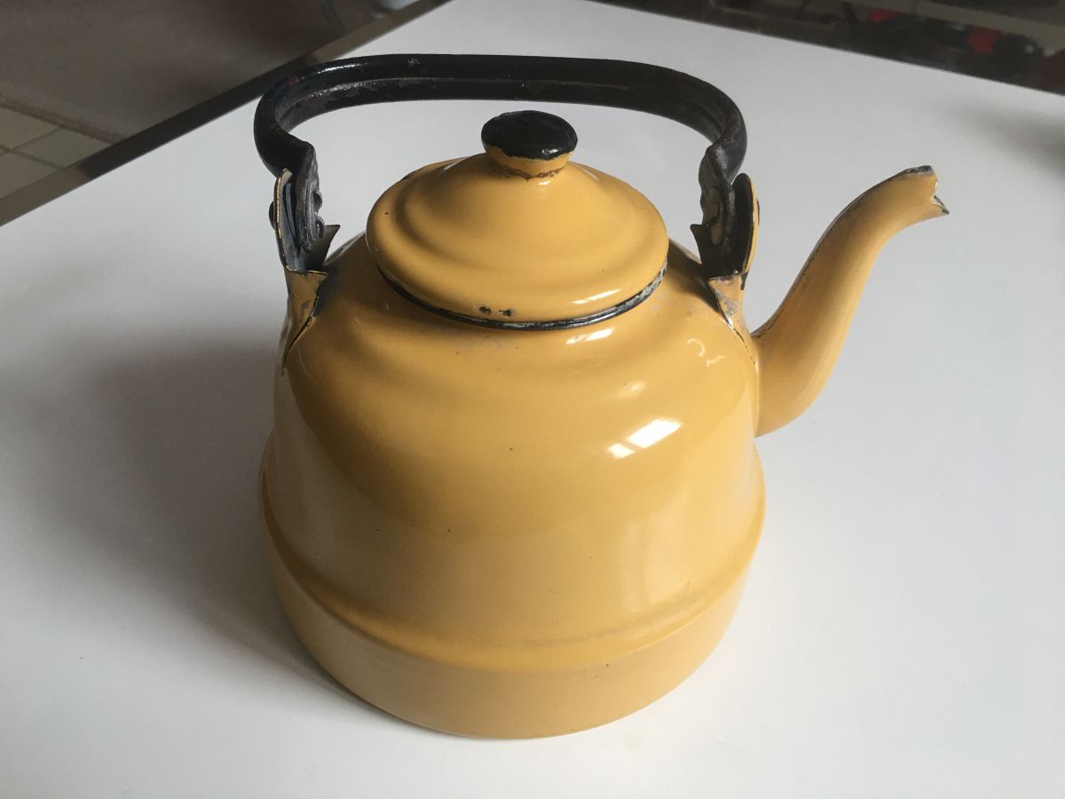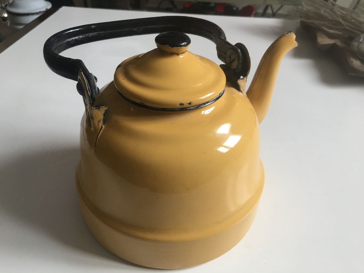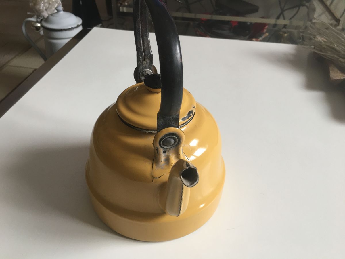 Bouilloire en tôle émaillée jaune des années 50, quelques points de rouille lui conférant tout son charme (voir photos), hauteur 13cm, diamètre 13cm, bon état général.