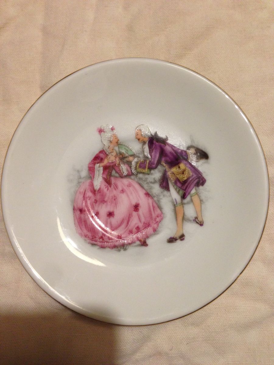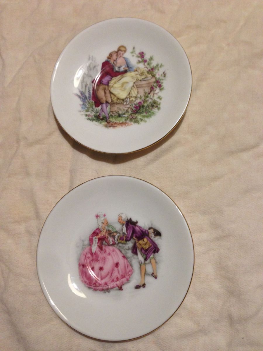 Petites et charmantes assiettes décoratives en porcelaine de Limoges représentant des scènes galantes sous Louis XV.