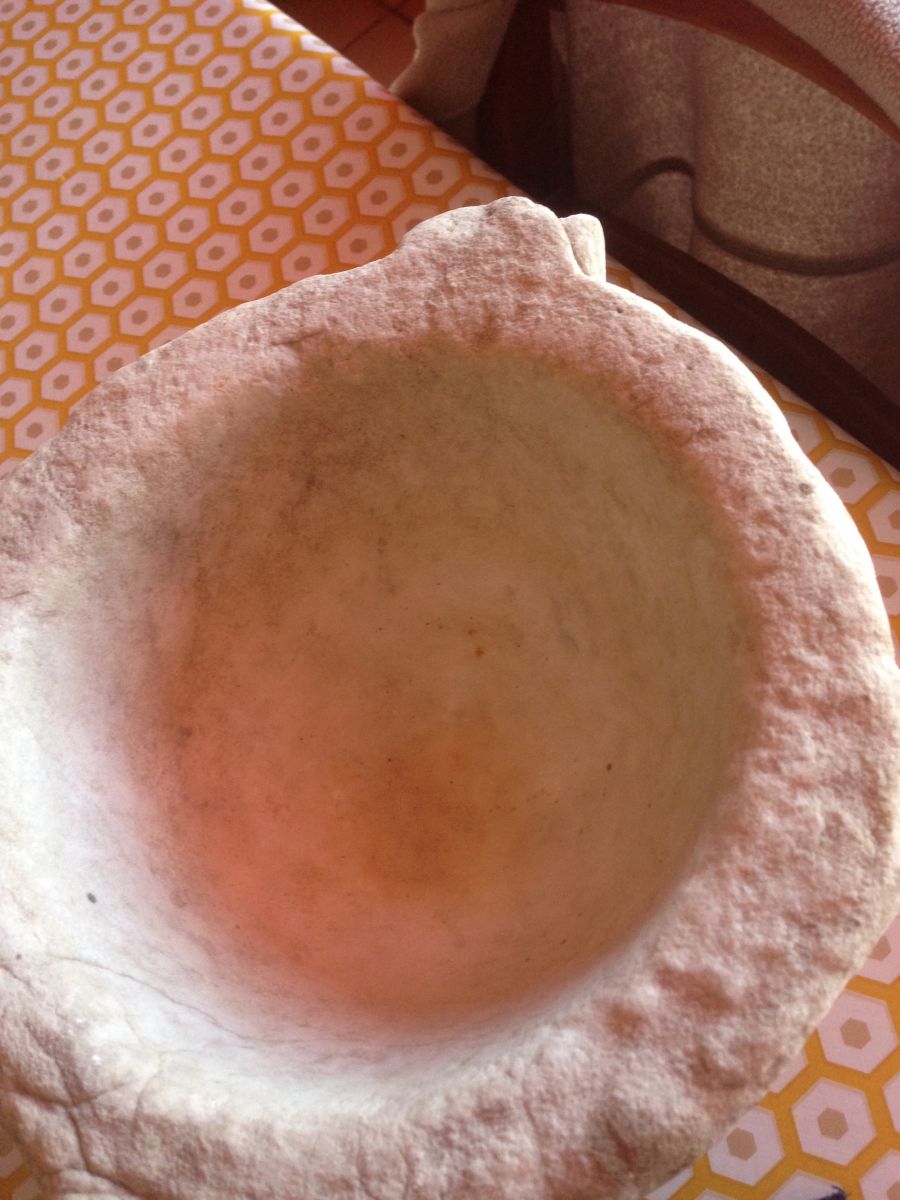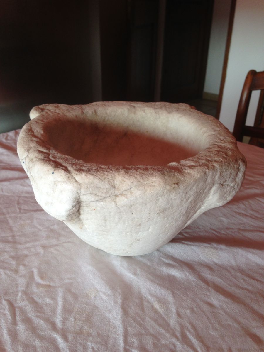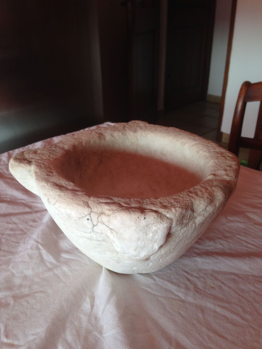 Ancien mortier de grandes dimensions en pierre claire. Peut être utilisé comme vide poches ou cache pot...
