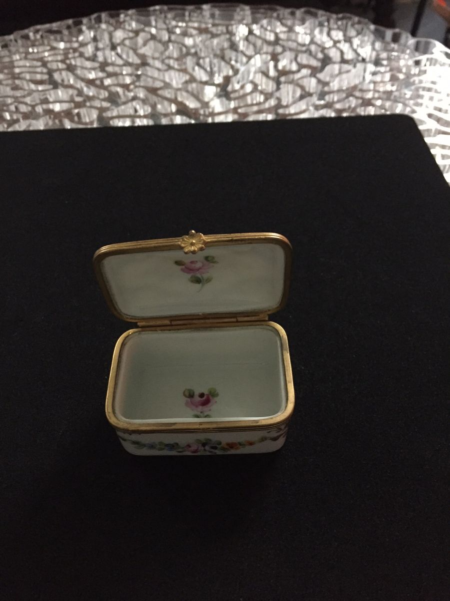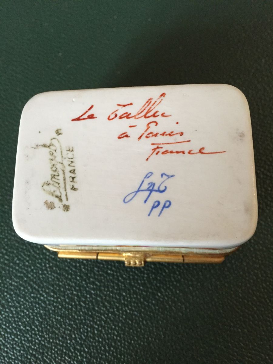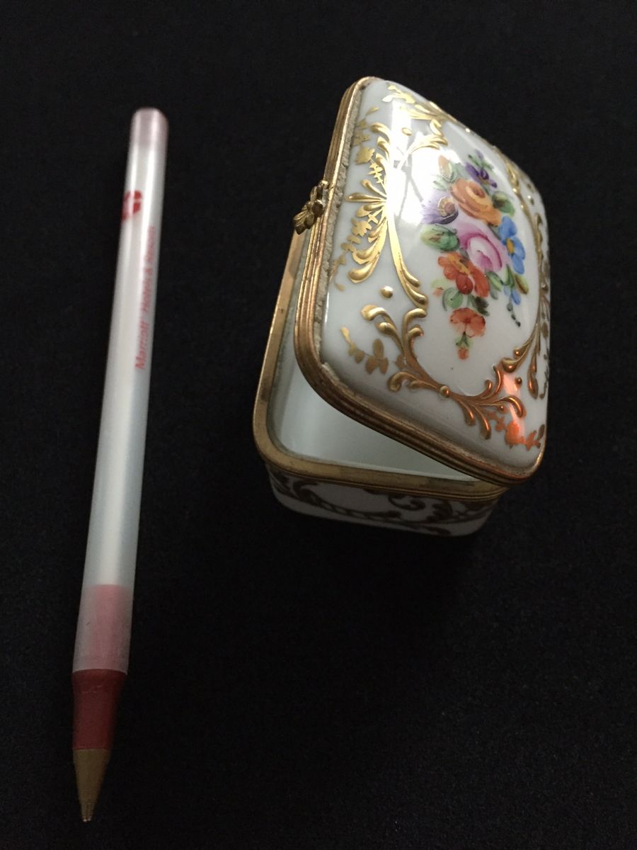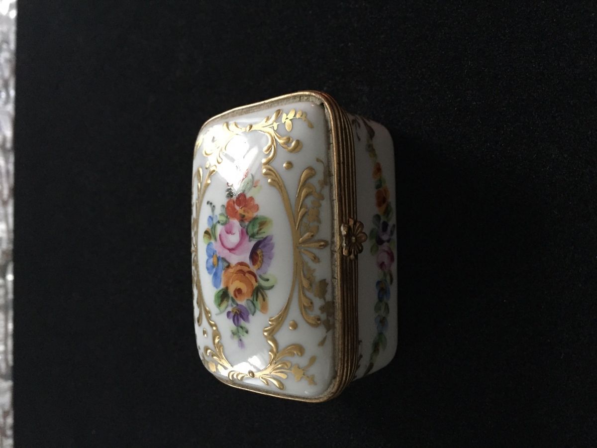 Jolie petite boîte ancienne en porcelaine de Limoges peinte à la main avec modif fleurs et peinture or en relief. Signé par Le Tallec Paris. En très bon état.