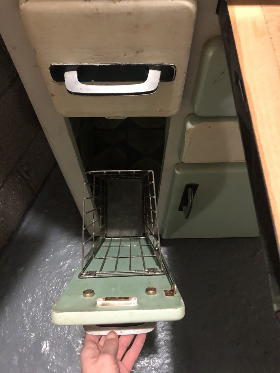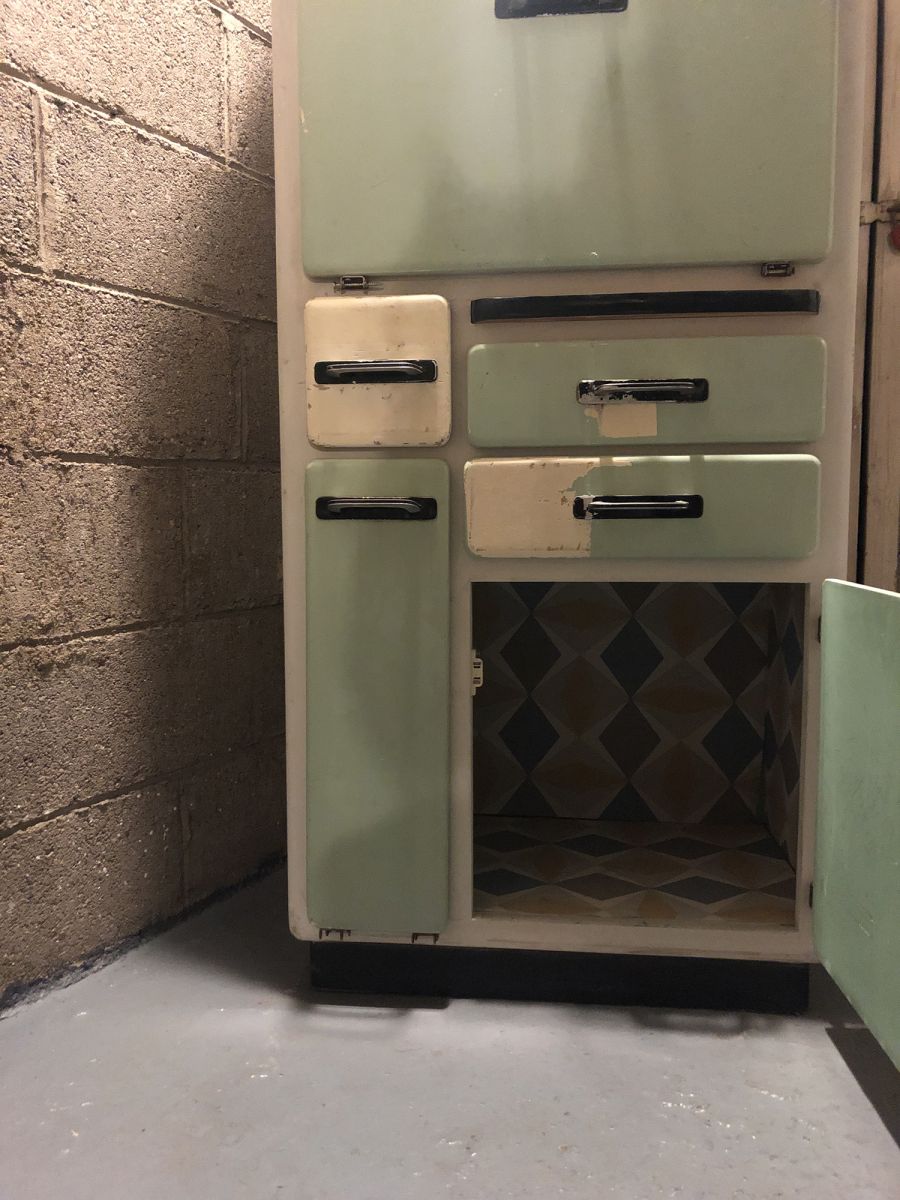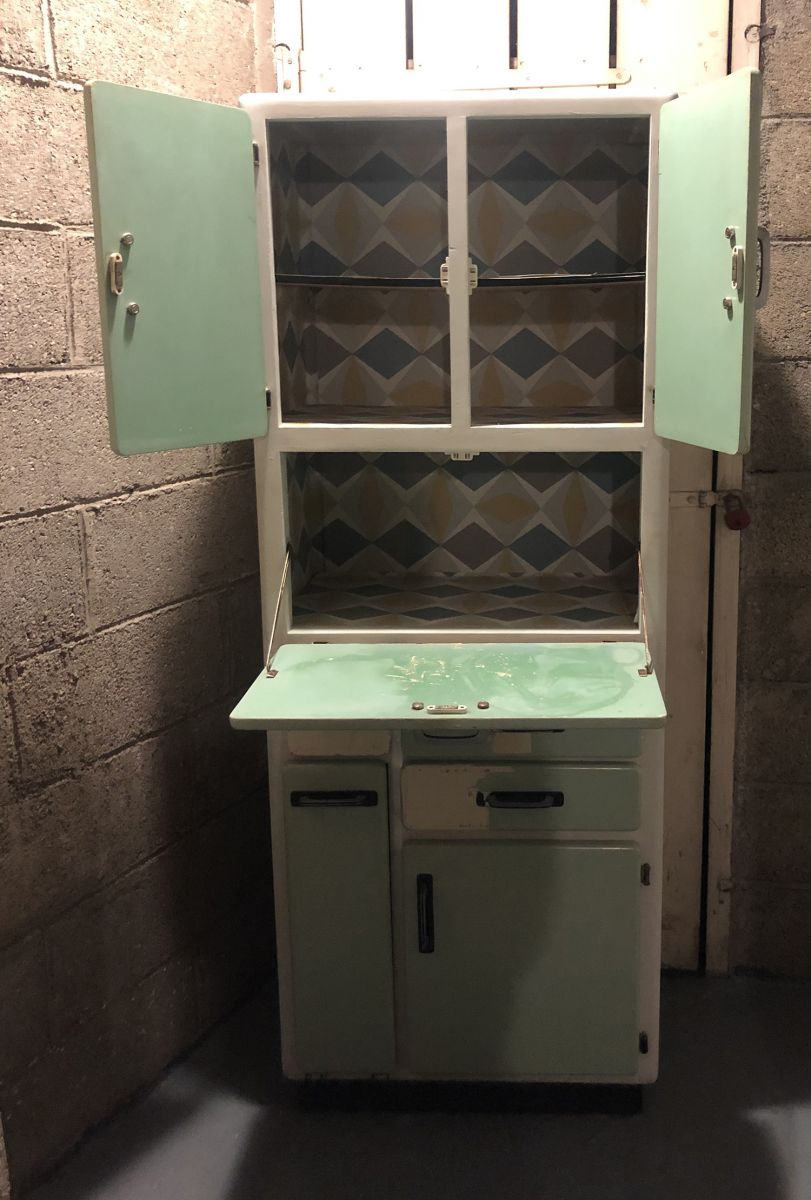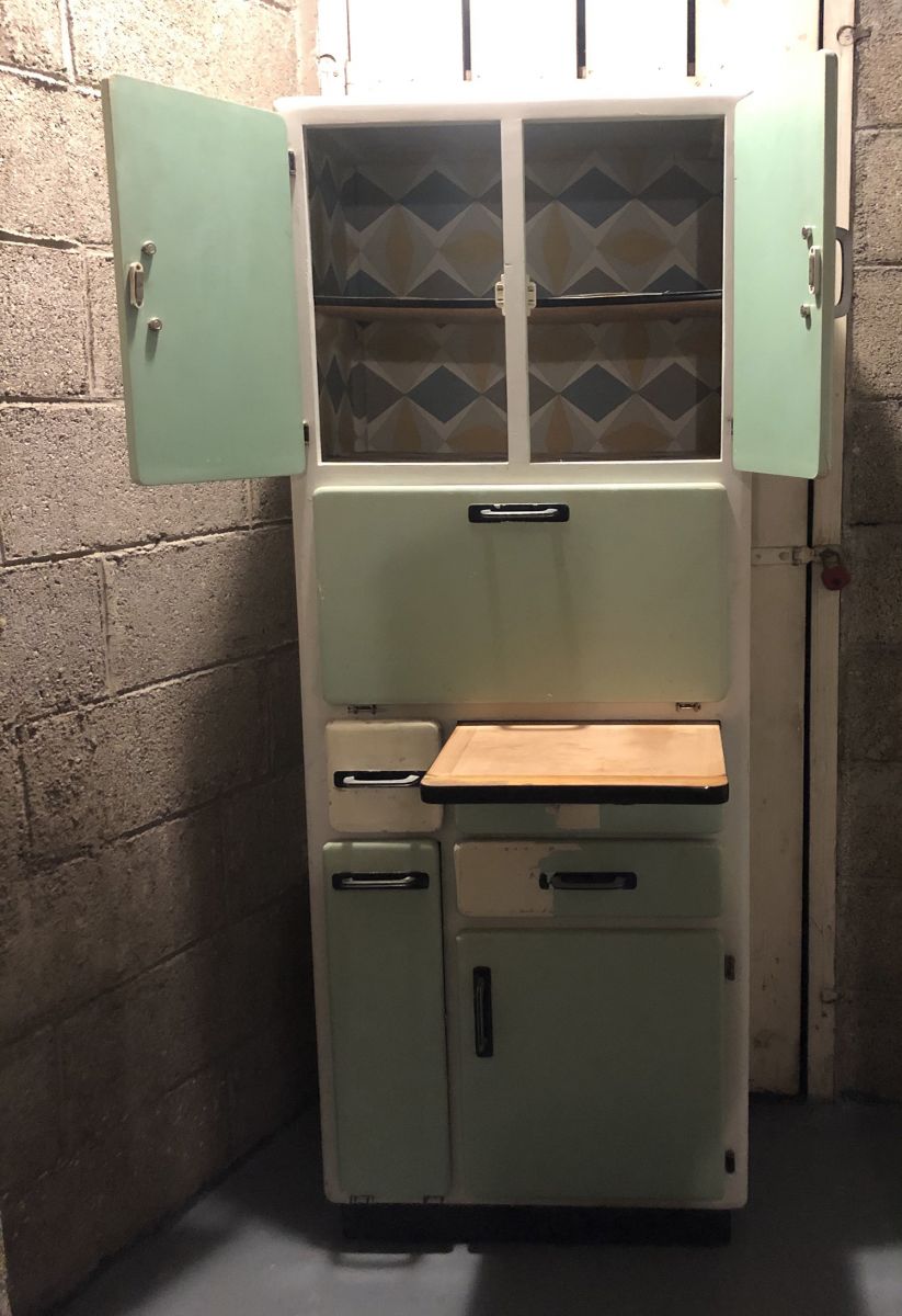 Le buffet Mado est un meuble de cuisine des années 40 ou 50. Celui-ci est à restaurer (peintures, ponçage) mais il est en bon état. Il a été revisité (peint en gris clair mat sur les côtés + intérieur papier-peint), les portières sont à mon avis à poncer (comme on peut le voir sur les tiroirs, là où cela a déjà été poncé, le vert d'eau est passé blanchâtre). Tous les rangements sont en bois d’origine à l’intérieur de chaque porte dont 1 avec huche à pain.