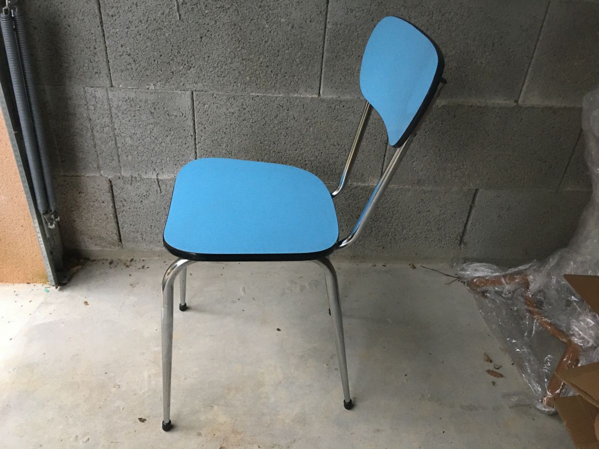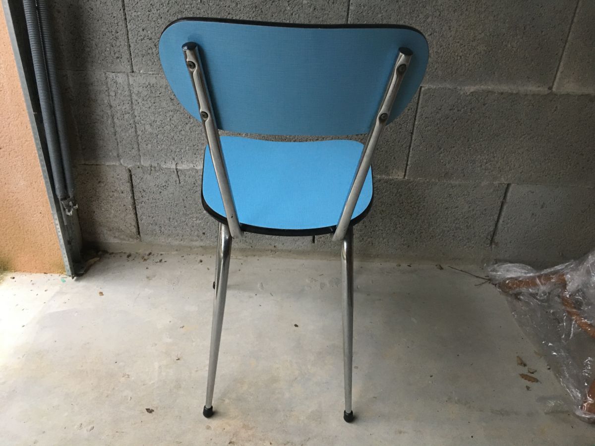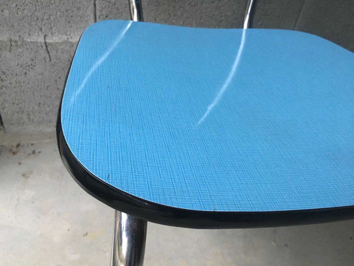 Chaise en formica bleu des années 60, entièrement nettoyée, hauteur totale 77cm, hauteur assise 45cm, assise 33x33cm, bon état.