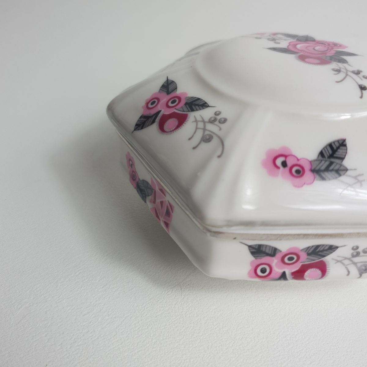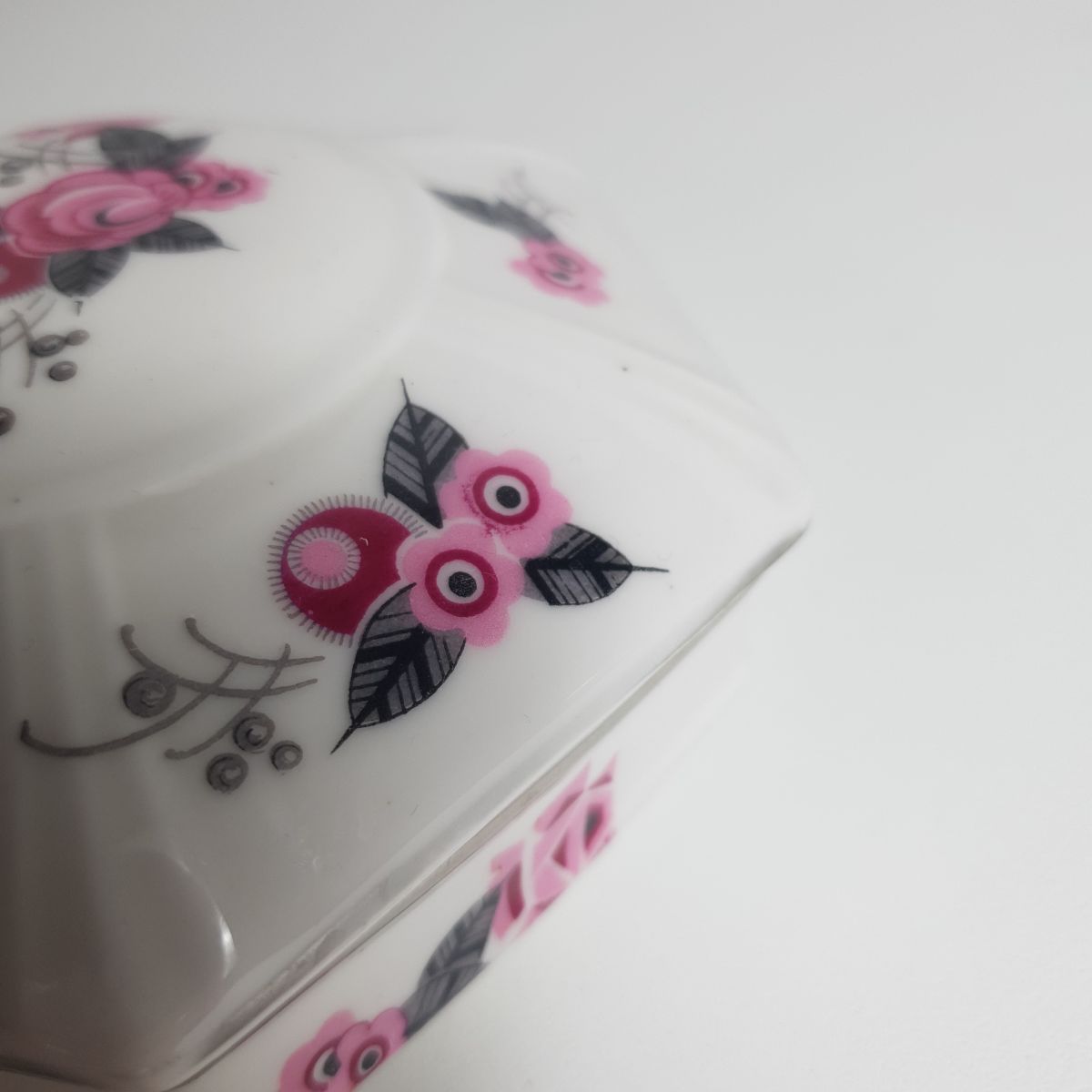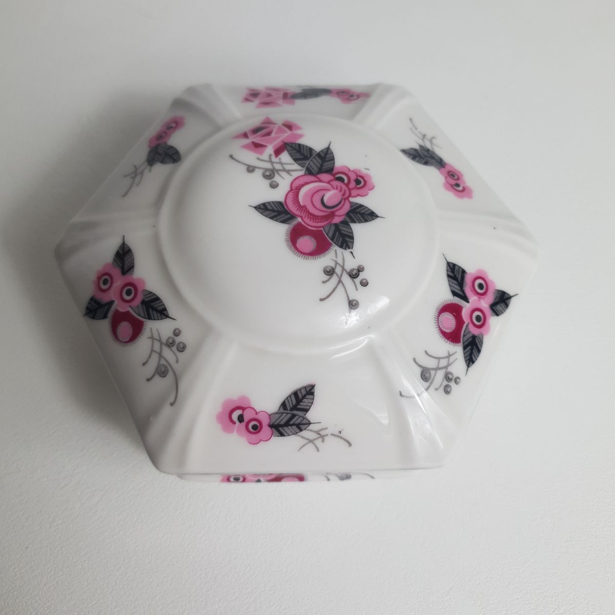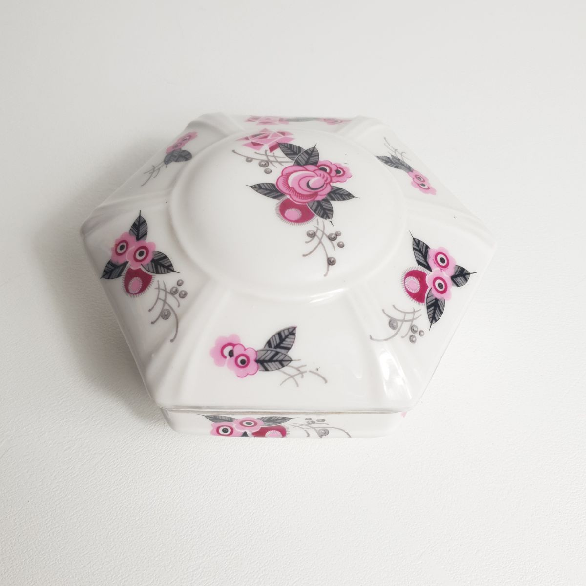 Forme hexagonale. Motifs roses et fleurs stylisées.