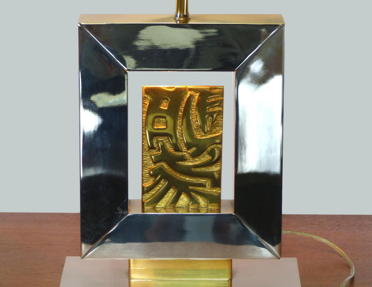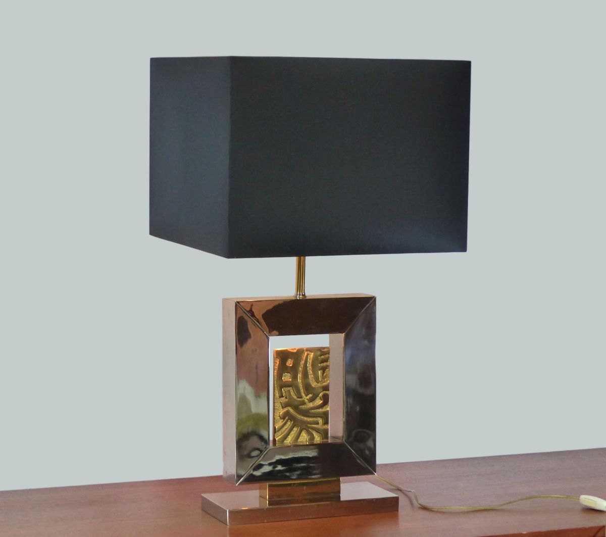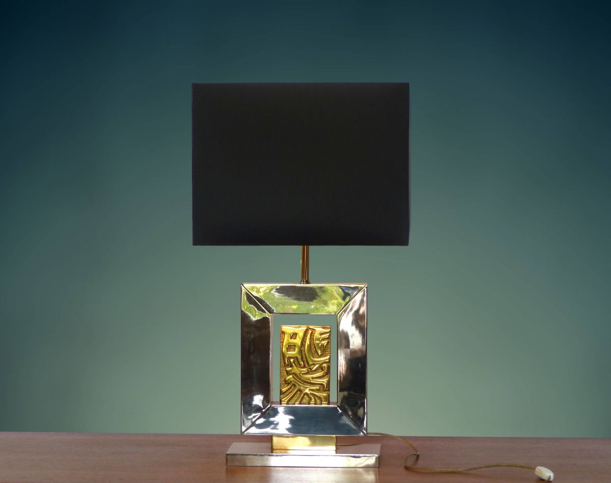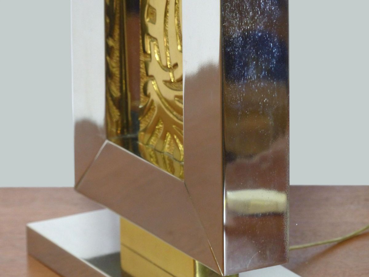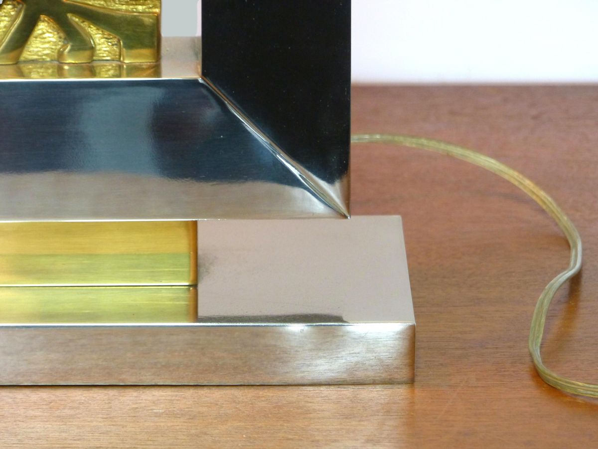 Lampe de table en acier brossé nickelé reposant sur une base rectangulaire. Elle enserre une plaque en bronze doré à décor de motifs géométriques.