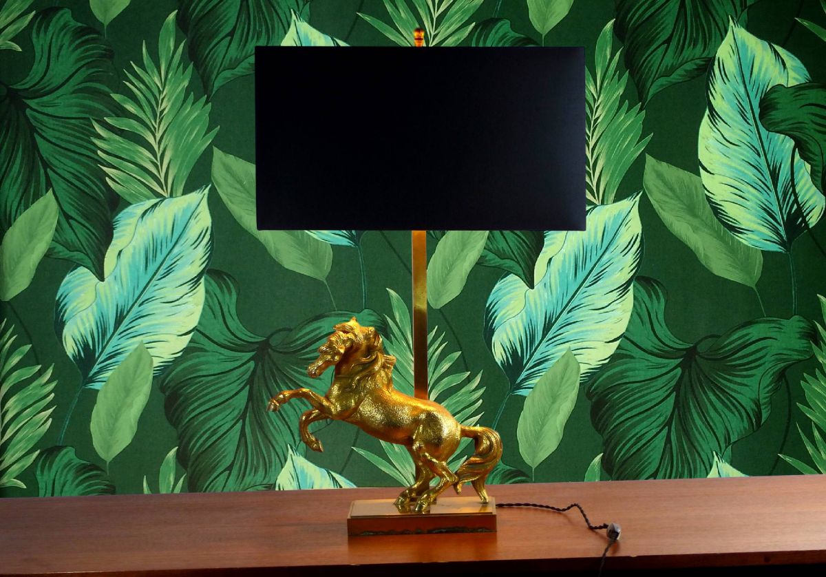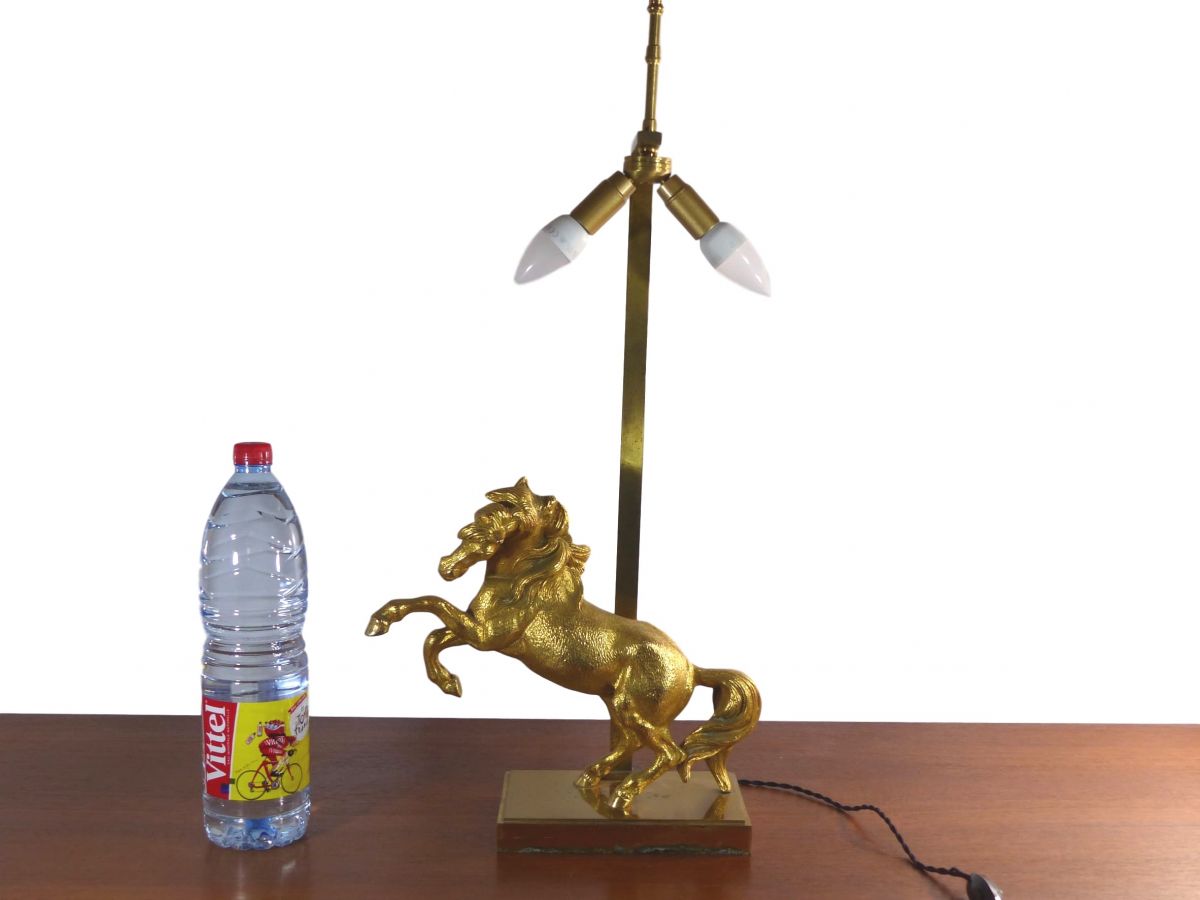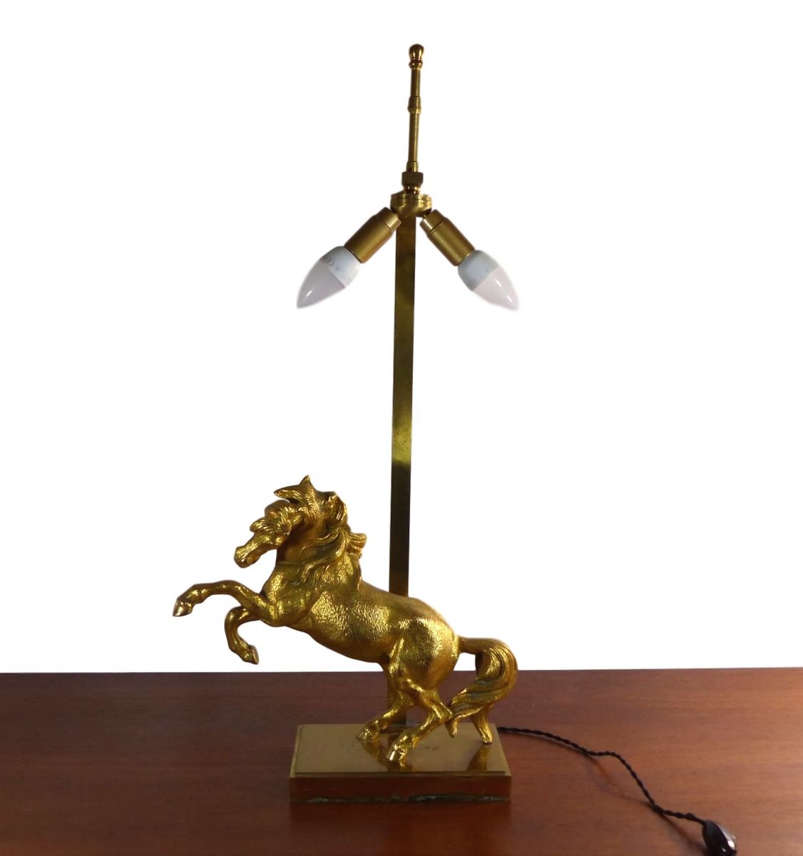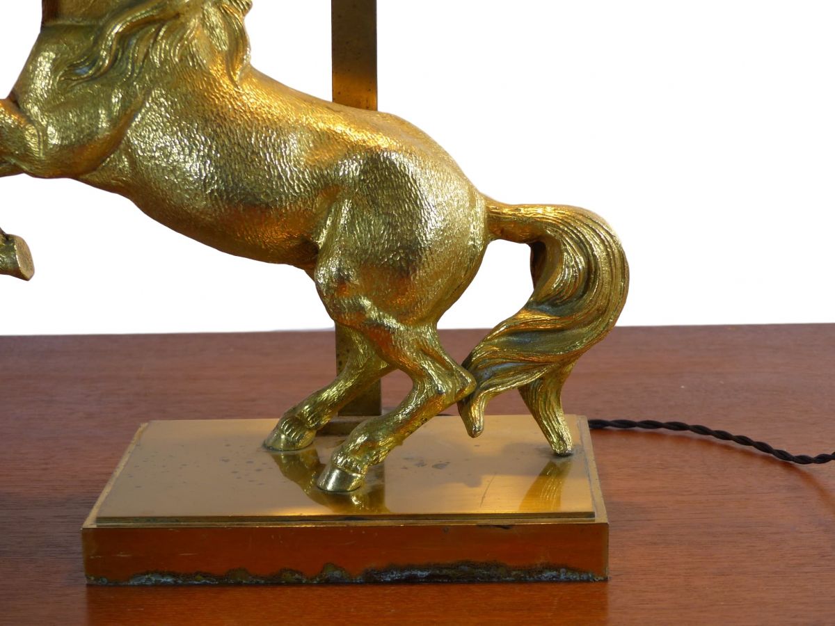 Elégante grande lampe de table Hollywood regency, avec cheval cabré en bronze doré et base en laiton.