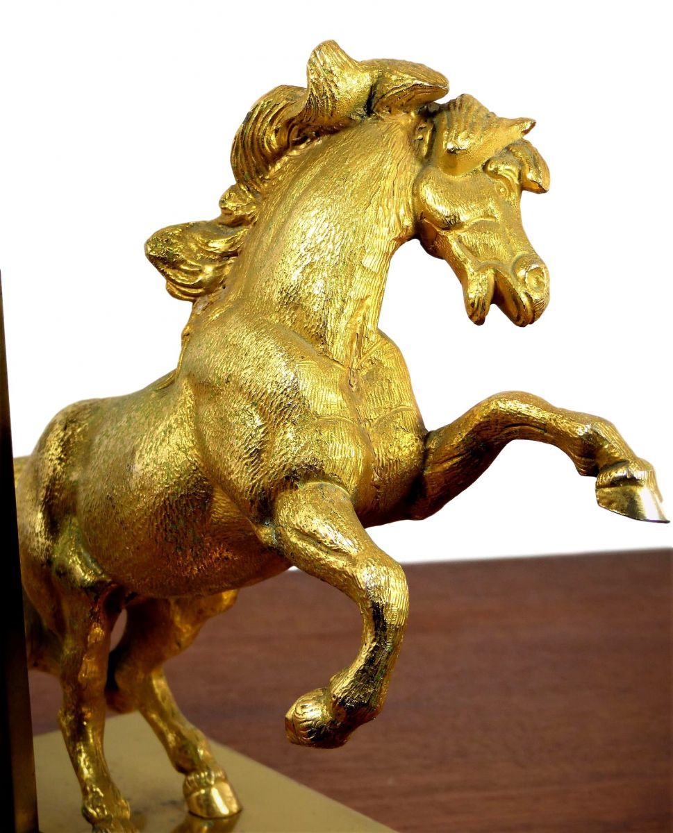Elegant Hollywood regency large table lamp, with nose-up horse in gilded bronze and base in brass.
