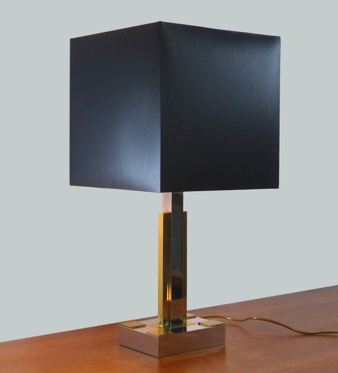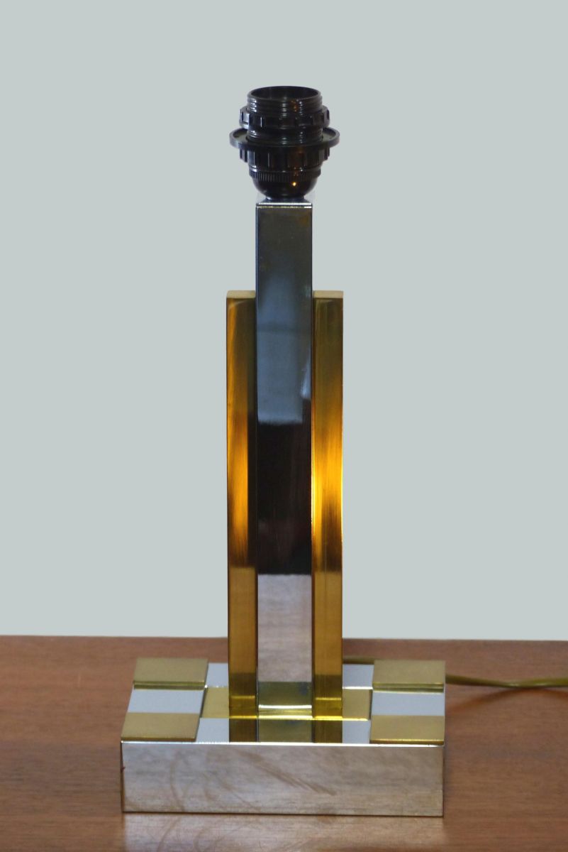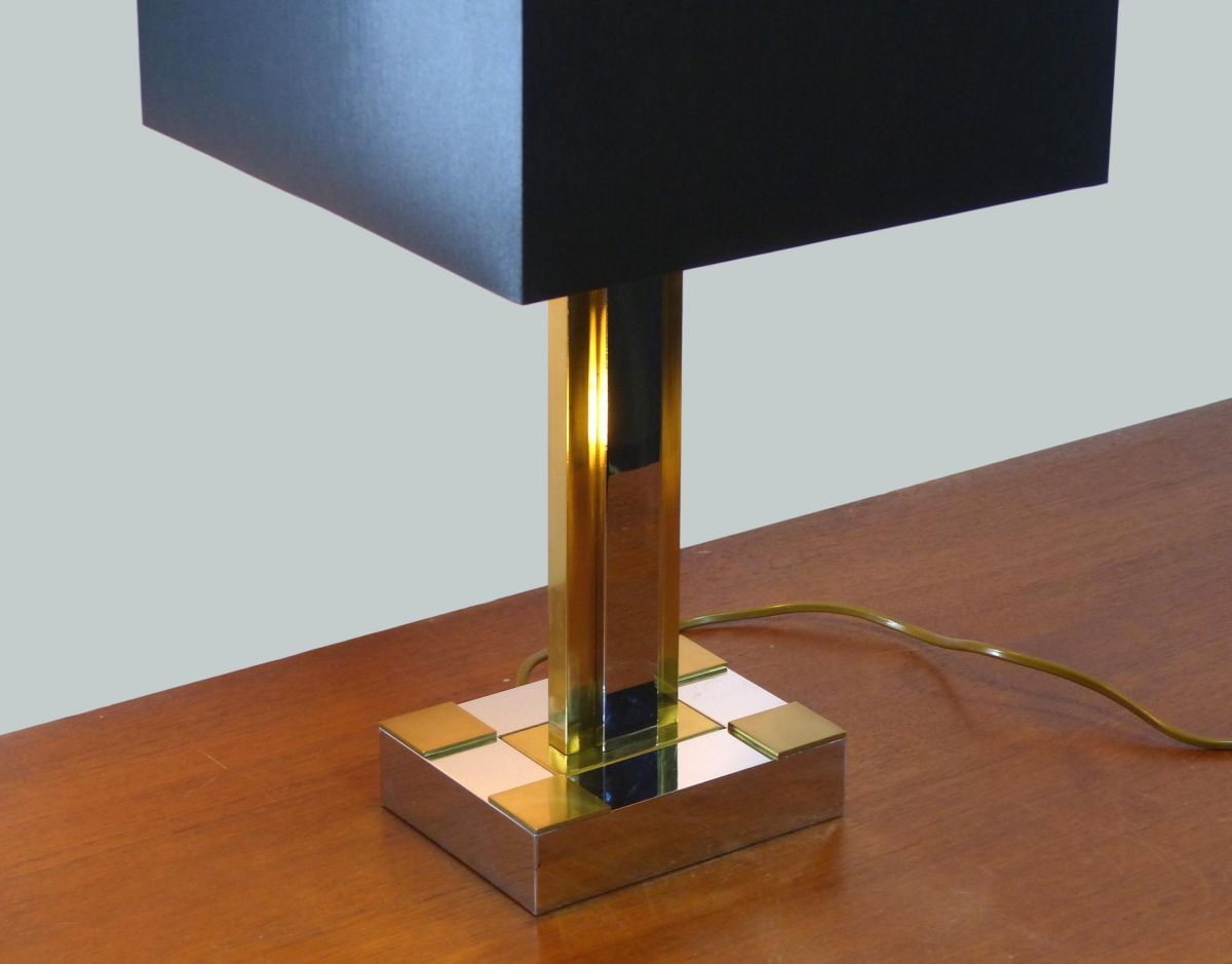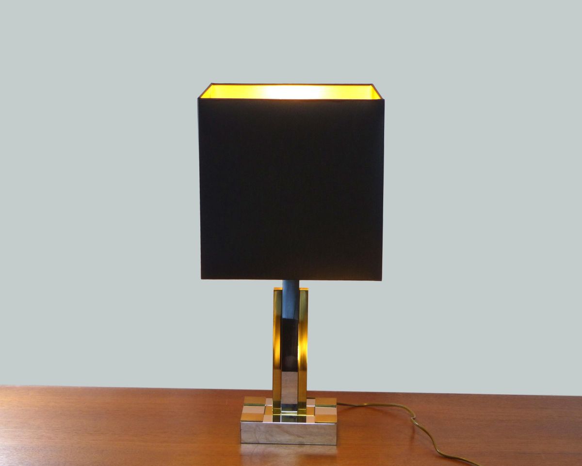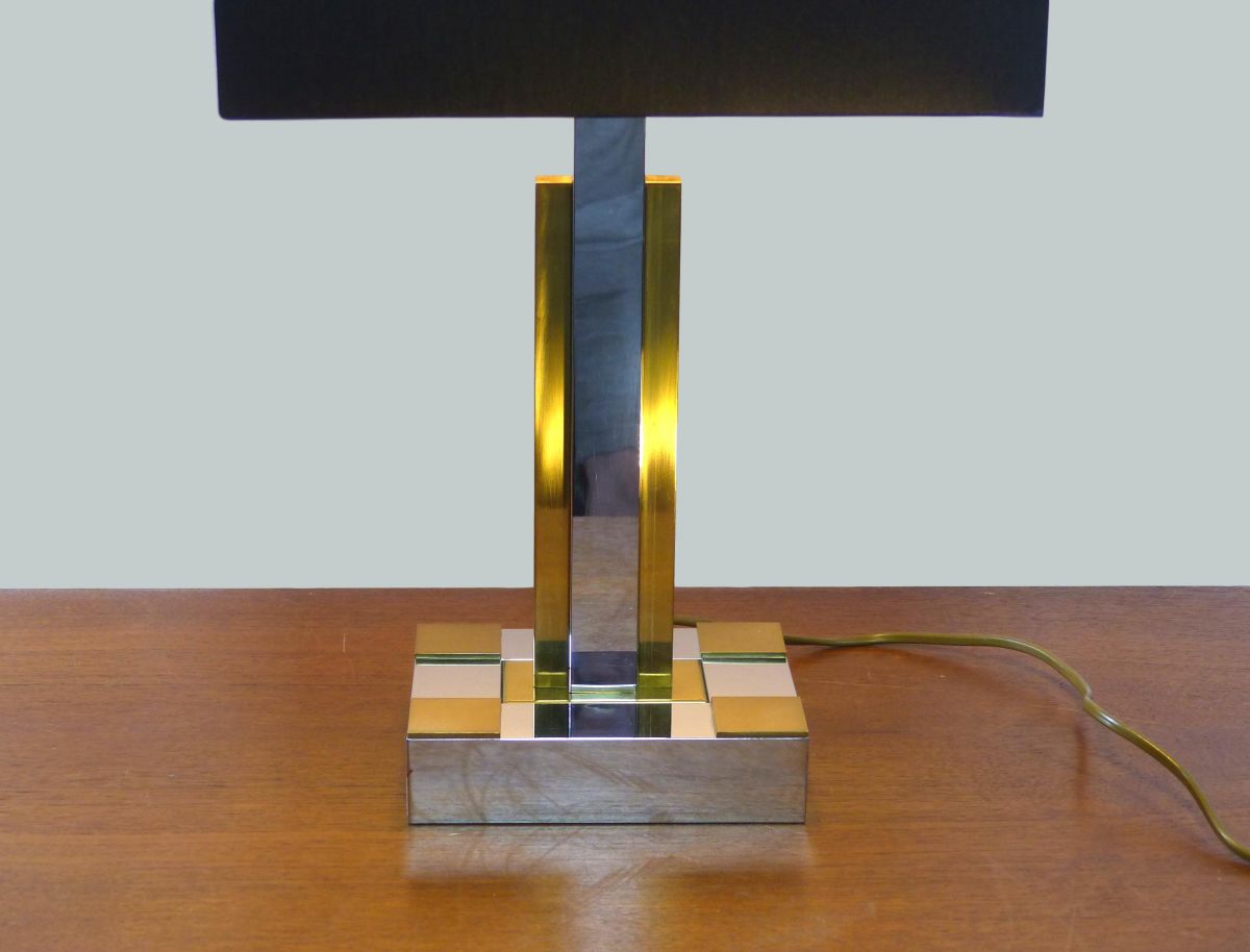 Lampe de bureau Hollywood regency dans le style de Willy Rizzo ou Roméo Rega, en métal chromé et laiton doré.