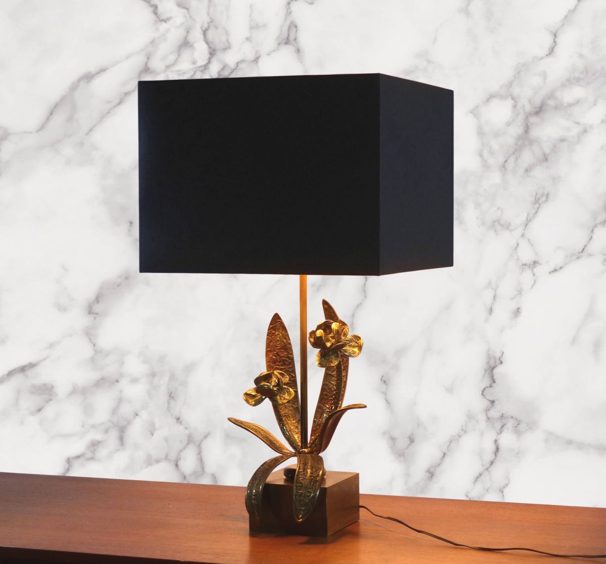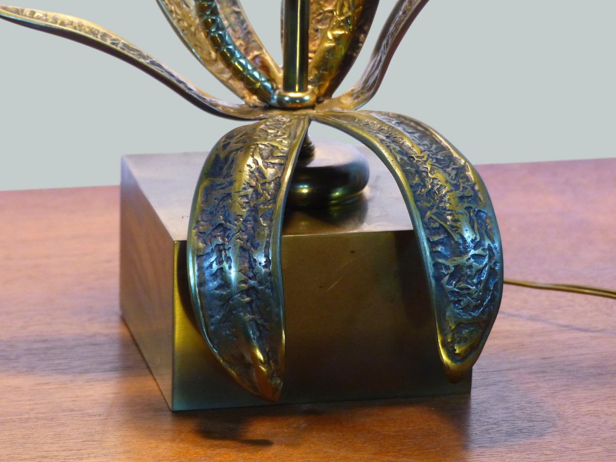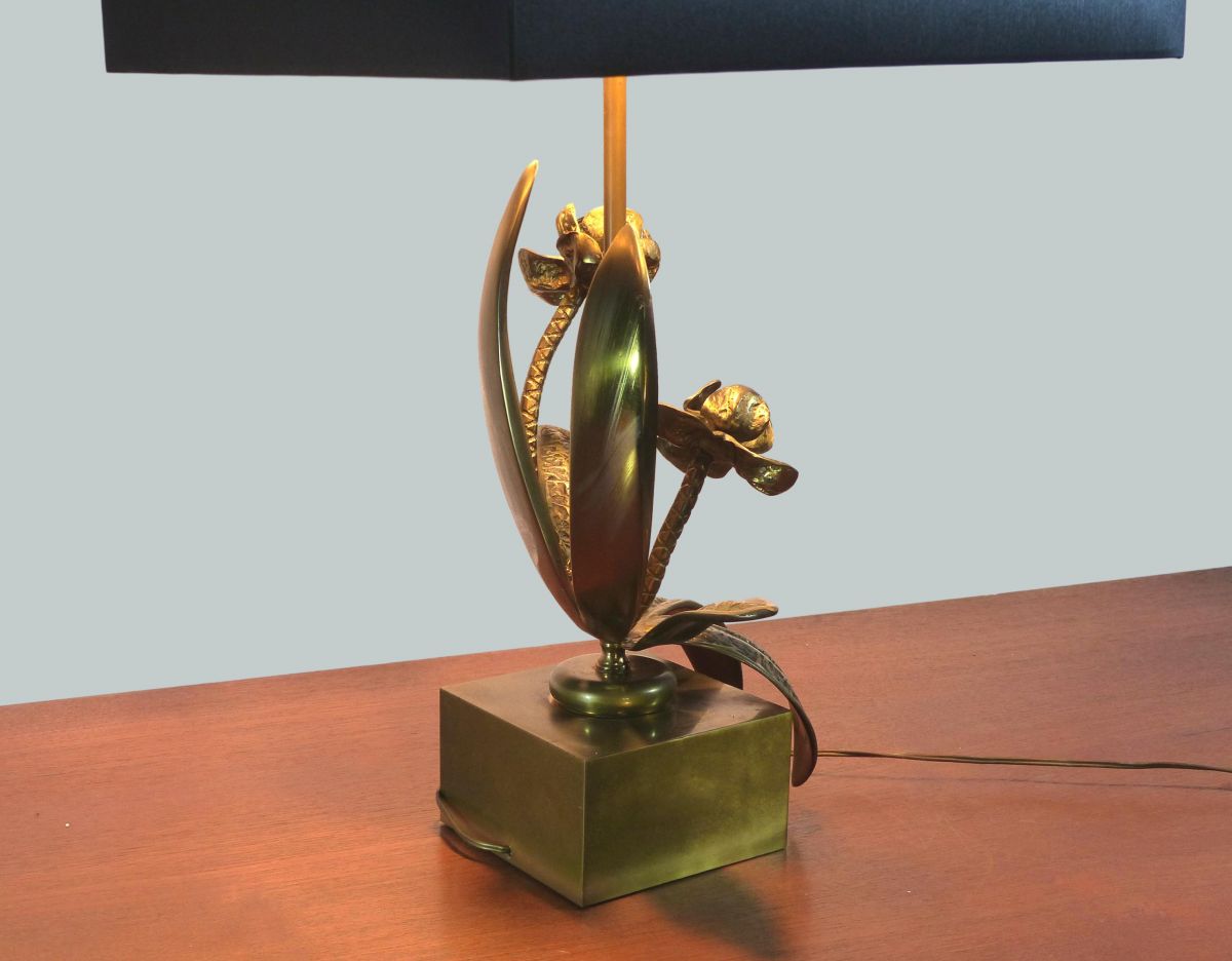 Grande lampe de table en bronze et laiton patinés au sujet de fleurs exotiques stylisées.
