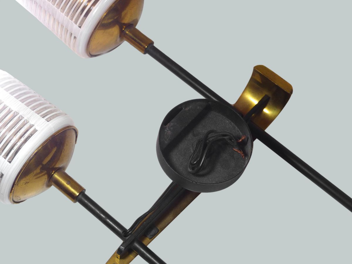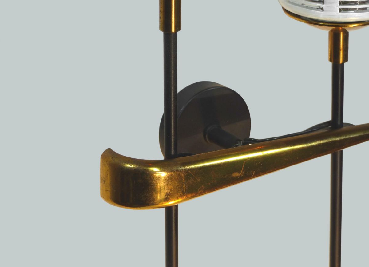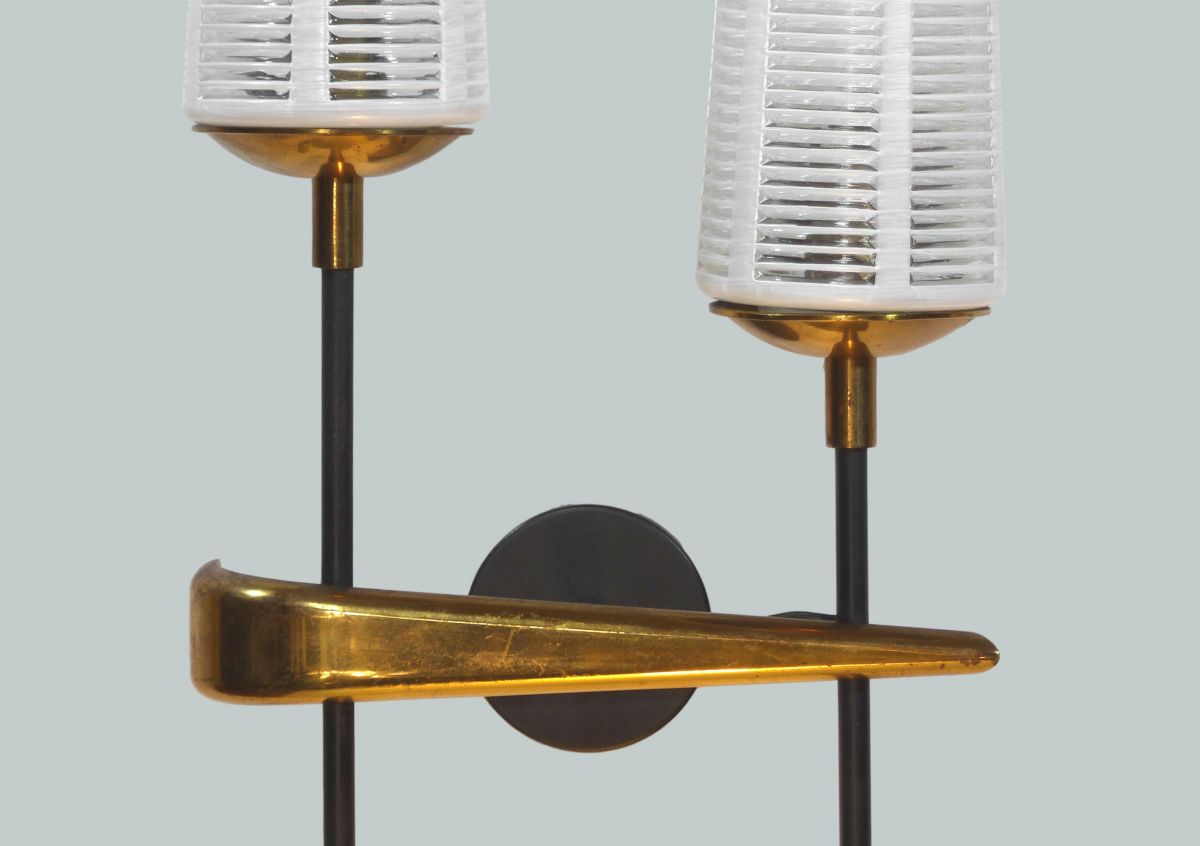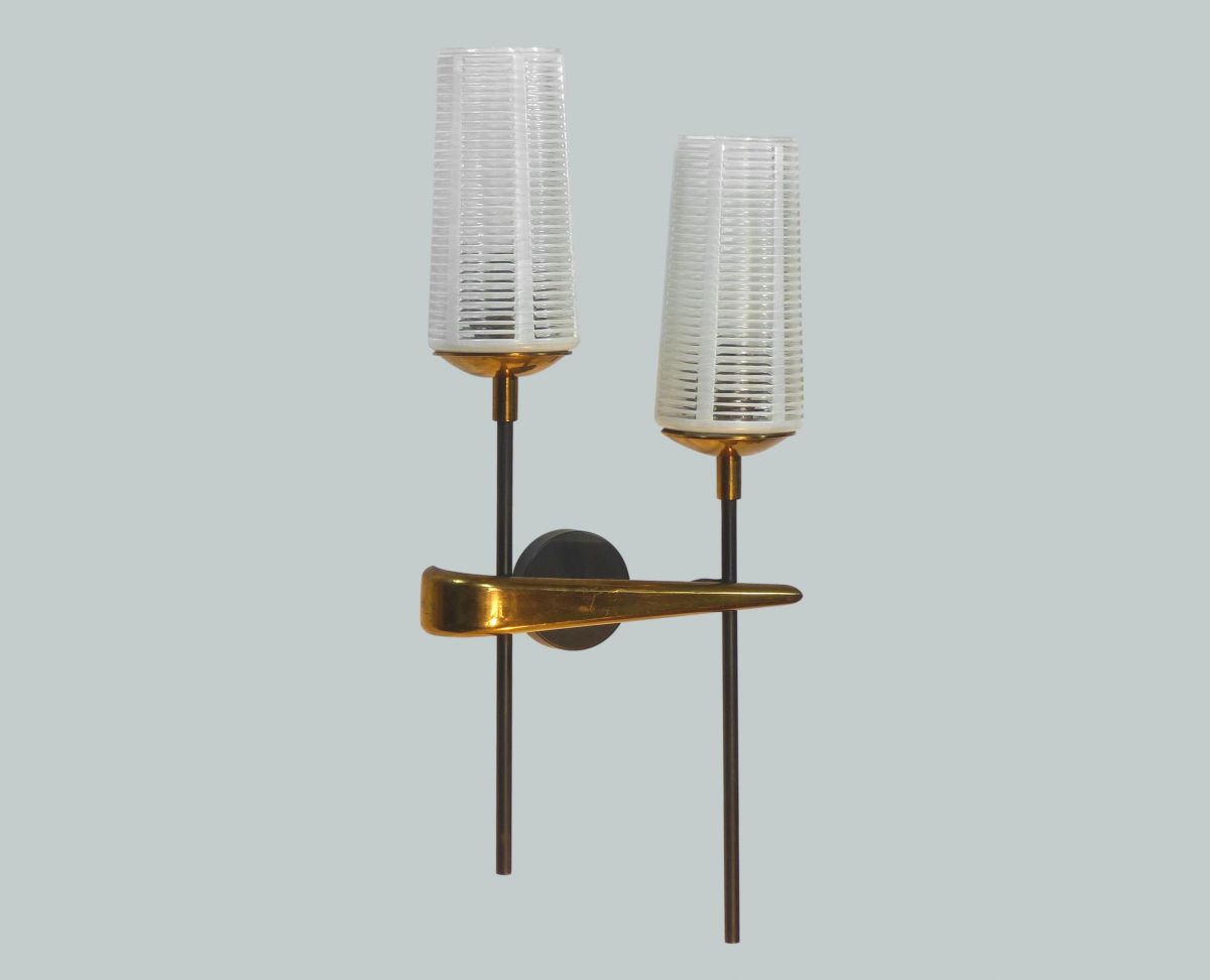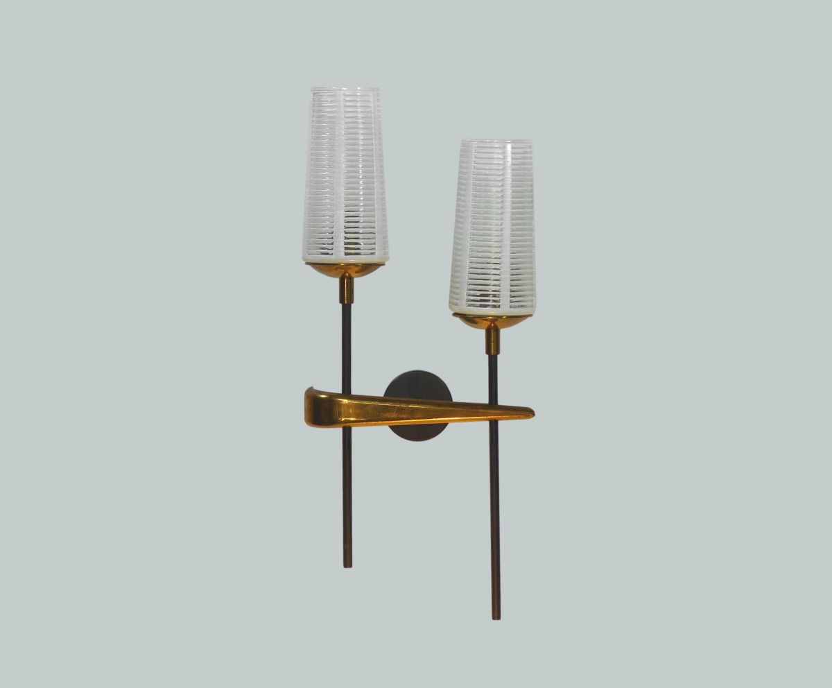 Attribuée à la maison Arlus, applique murale en fer laqué noir, épais bronze de forme boomerang et laiton doré, tulipes en verre moulé.