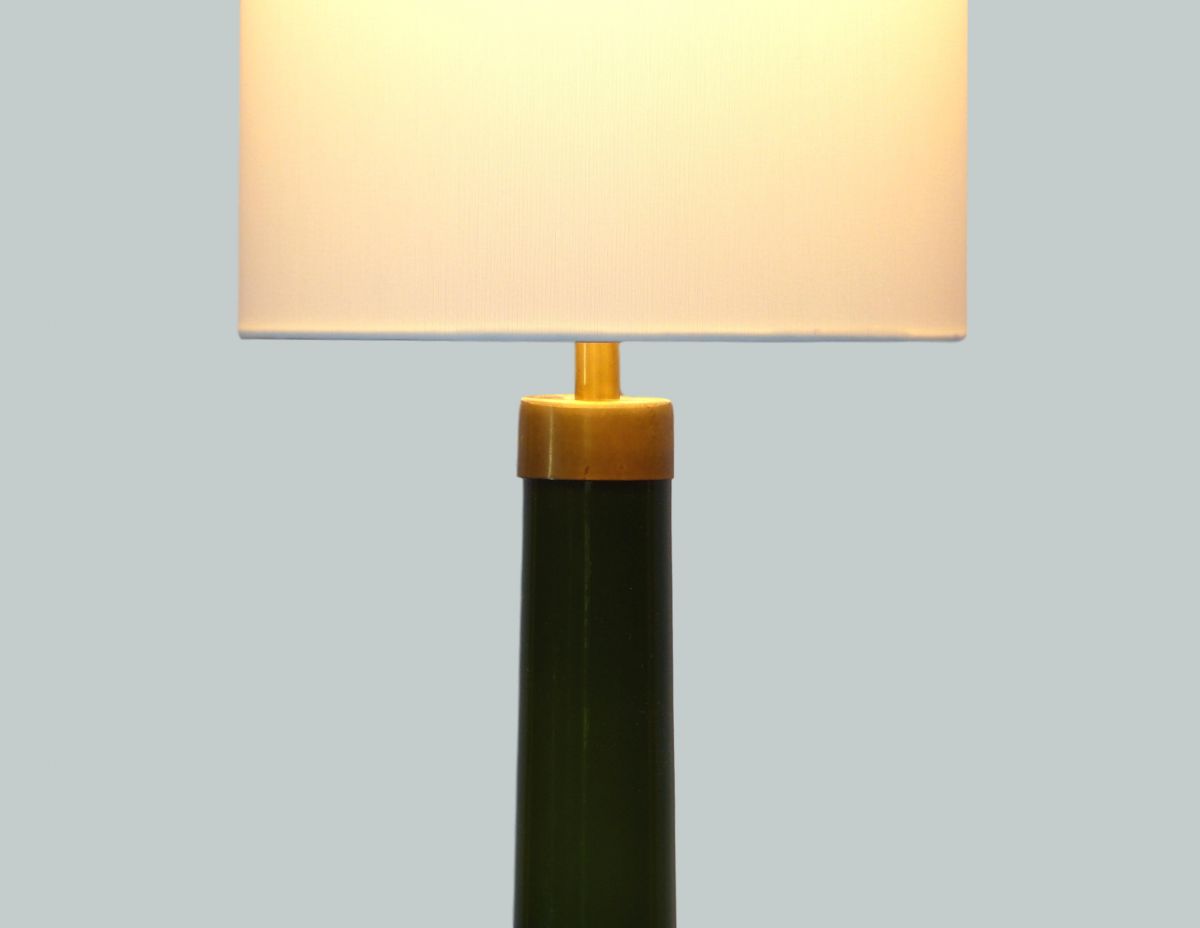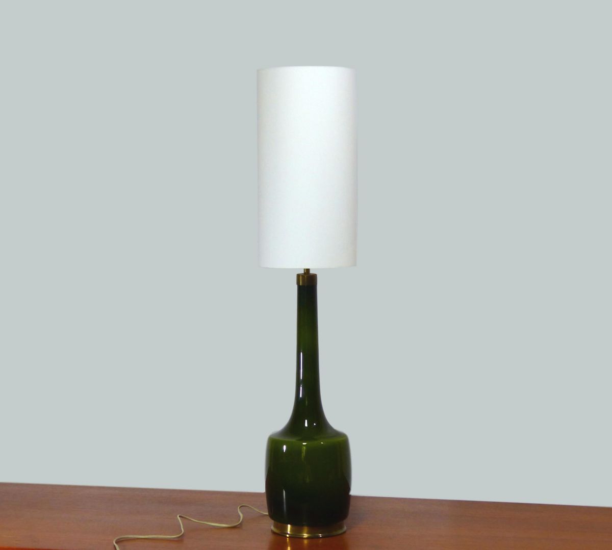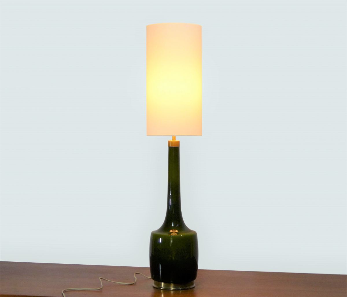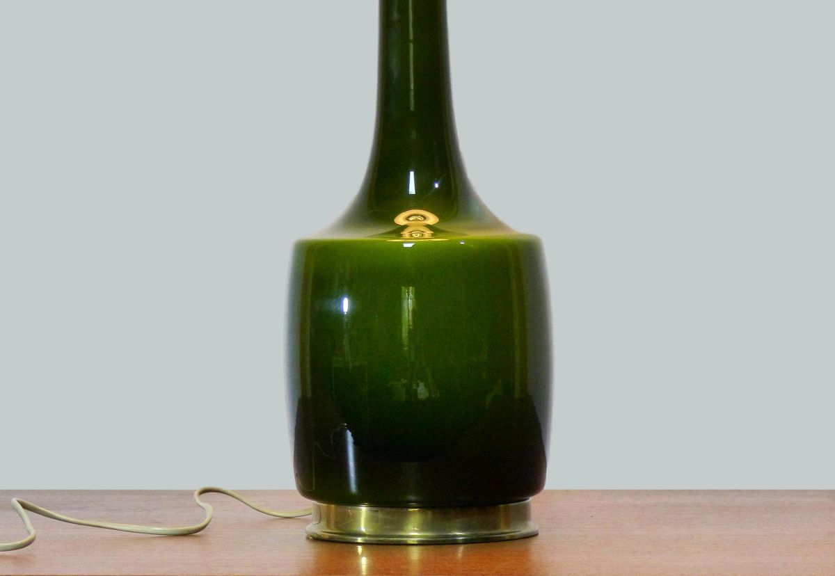 Lampe en verre, vert olive, talon et col en laiton Svend Aage Holm Sorensen.