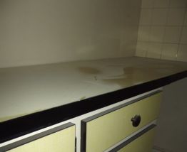 Le meuble ne nécessite pas de restauration importante (voire aucune, hormis la présence de la tâche sur le plan de travail qui peut tout simplement être surmonté d'un nouveau plan de travail à votre goût sans travaux importants, ou facilement remplacé).