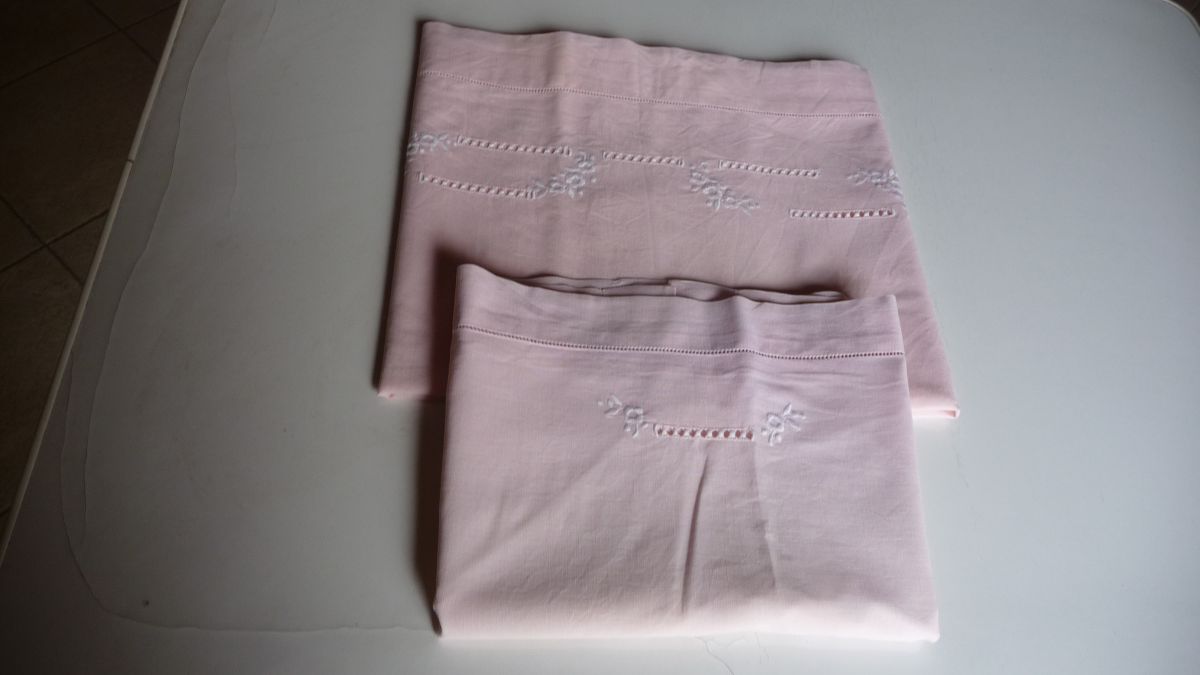 drap de lit d'enfant en coton rose, broderie blanche et jours fait manuellement, avec taie d'oreiller assortie 50 x 40 cm.