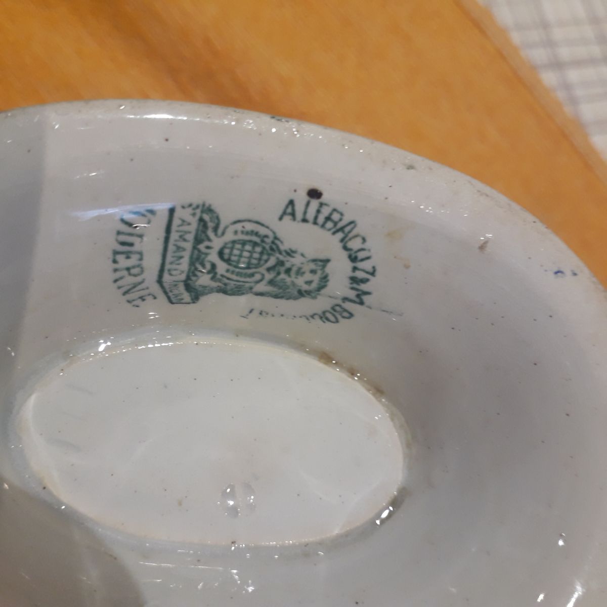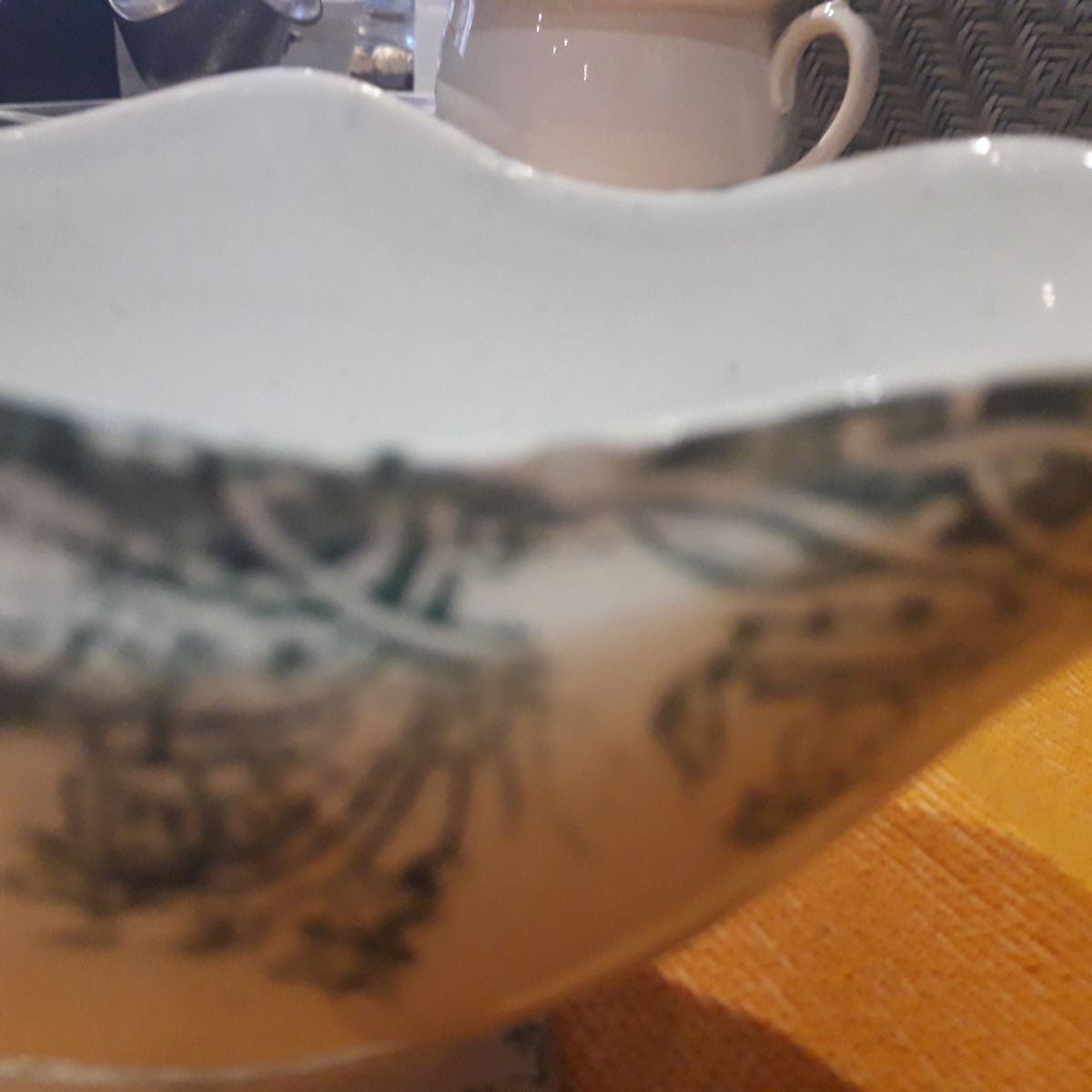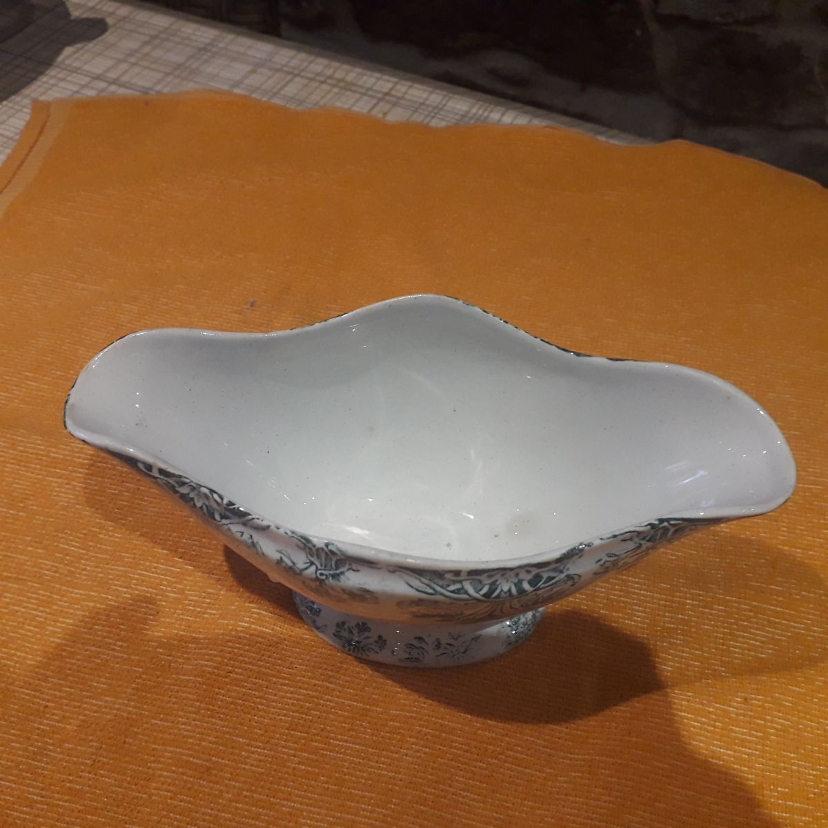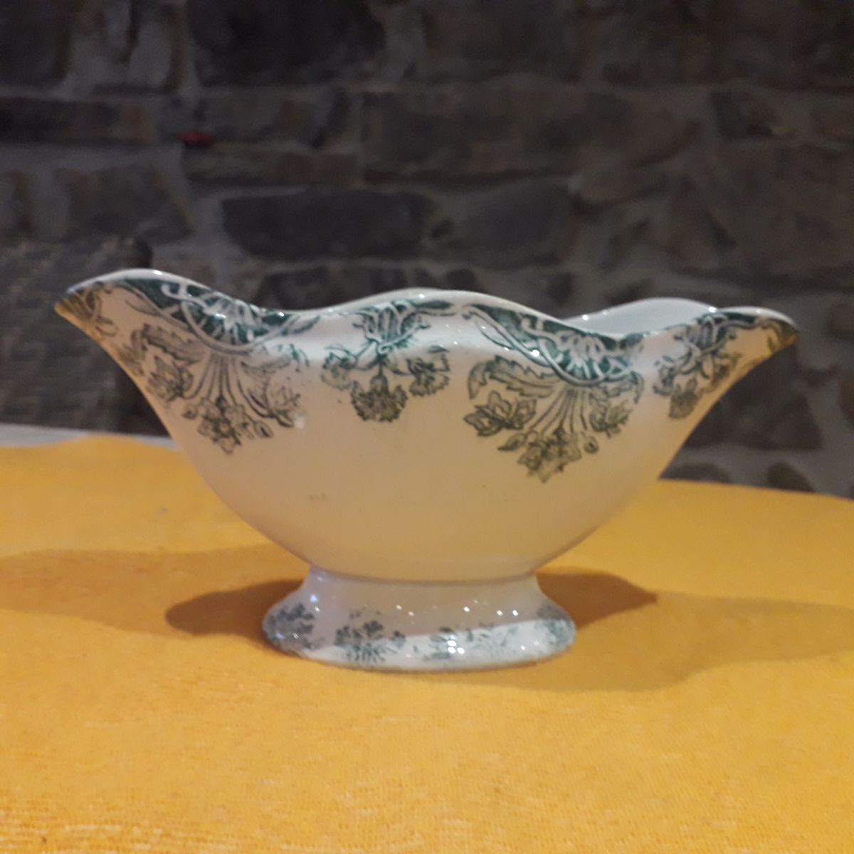 Très jolie saucière estampillée "Saint Amand moderne alebacqz persan". Légèrement ébréchée sur un côté (voir photo), très bon état vu son grand âge! longueur: 21 cm, hauteur: 10 cm