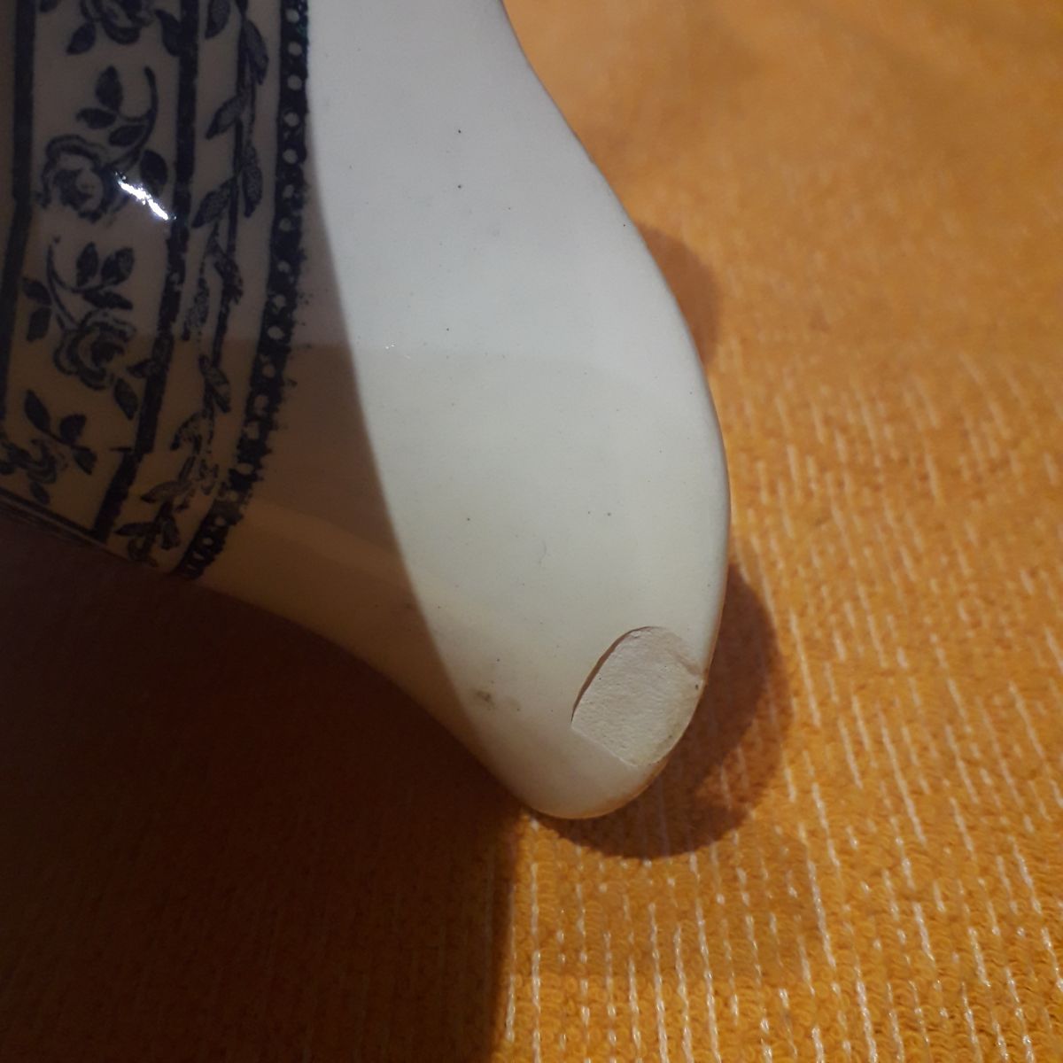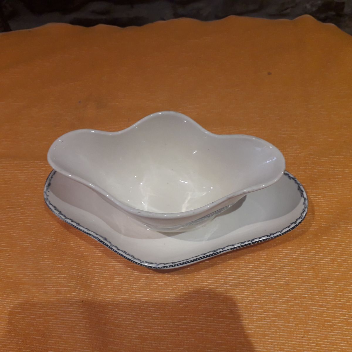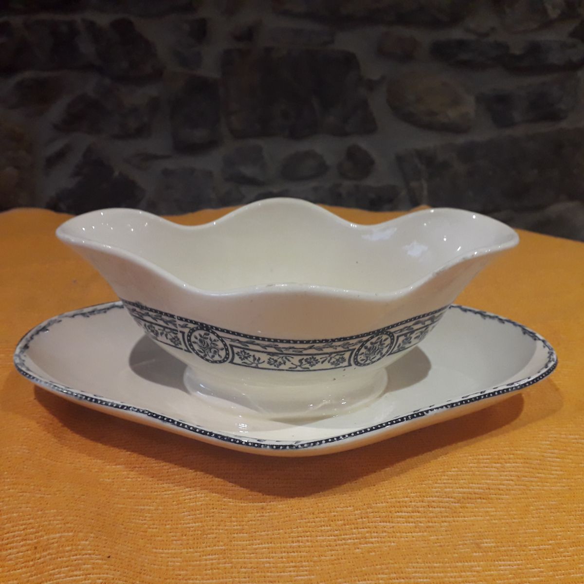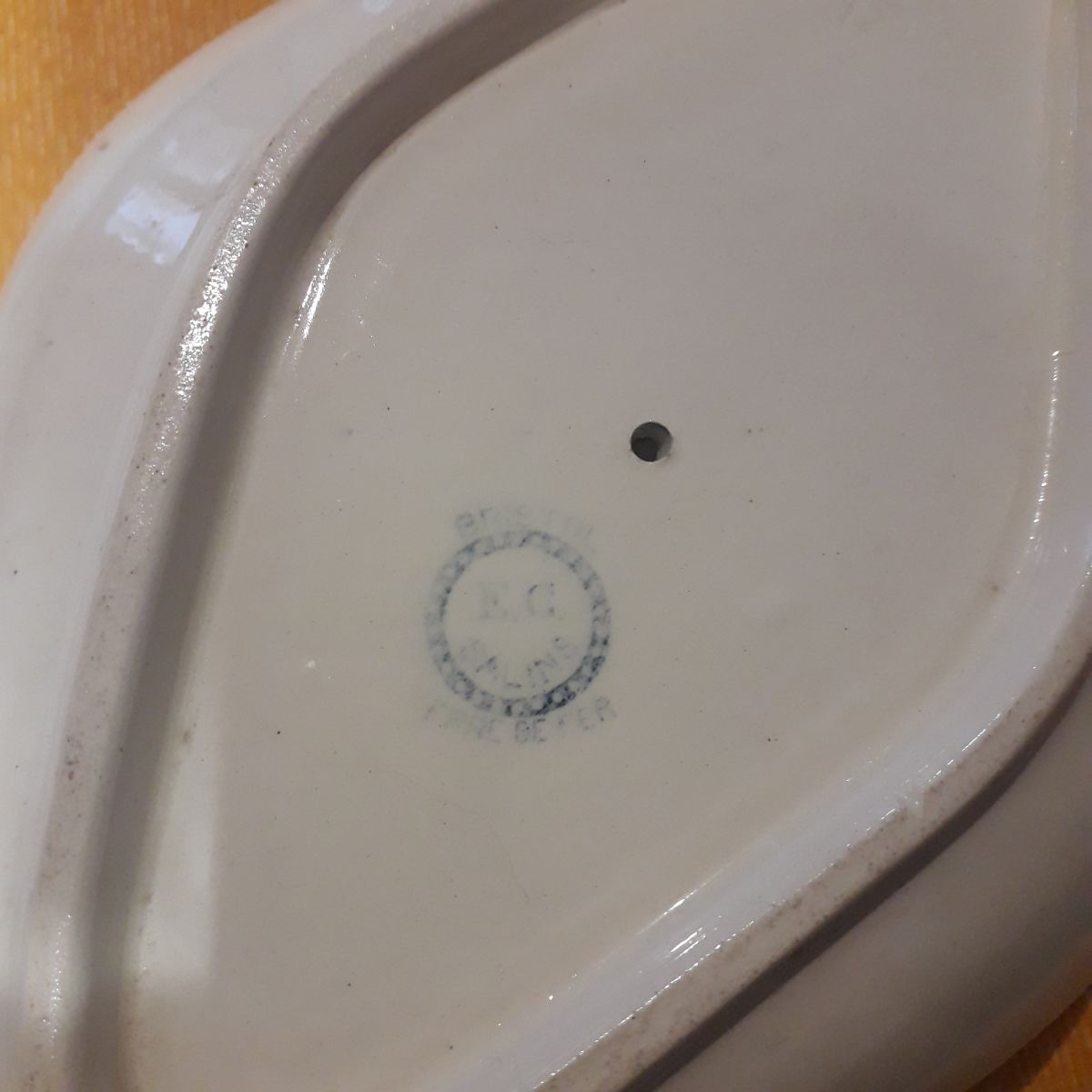 Saucière de Bristol, avec son liseré à fleurs et son dessous accroché. Dimension totale: 27x17 cm. Légèrement ébréchée sur le dessous du bec