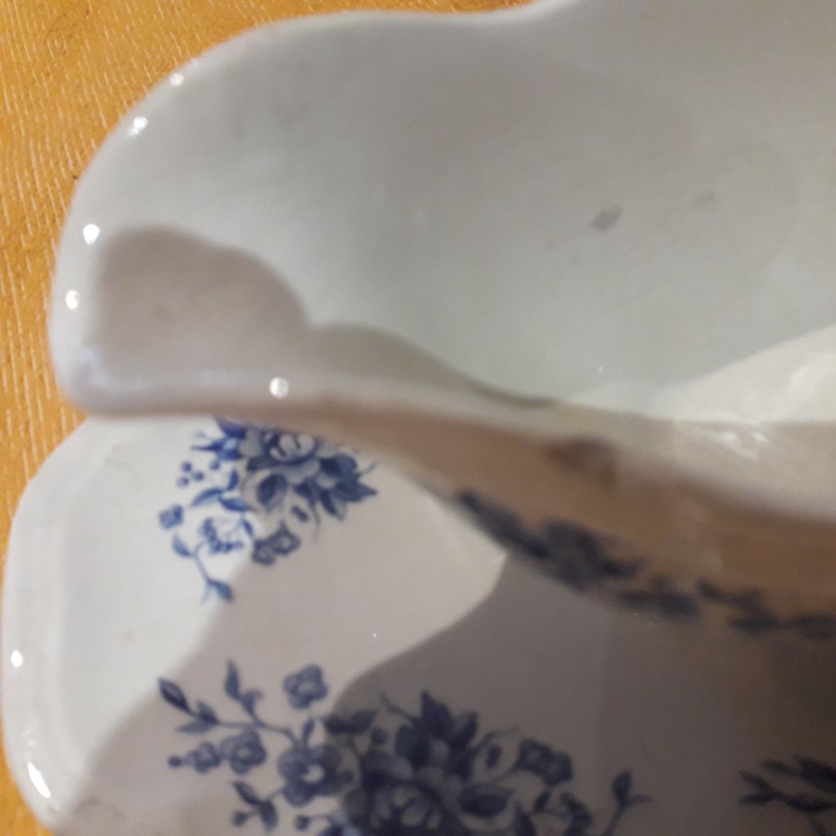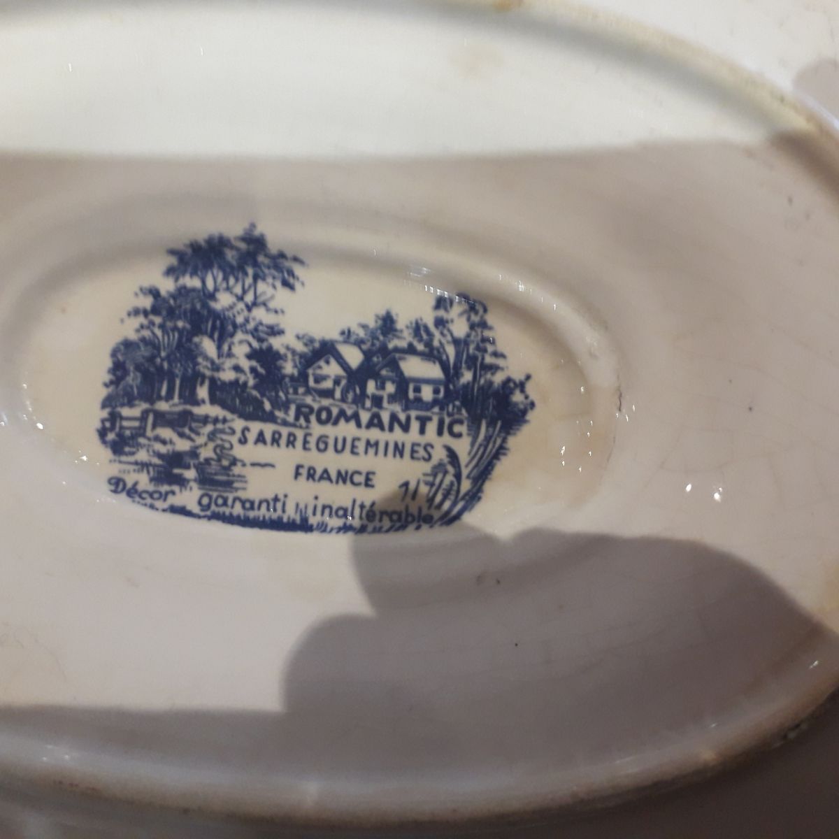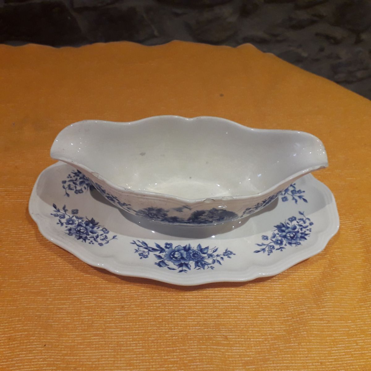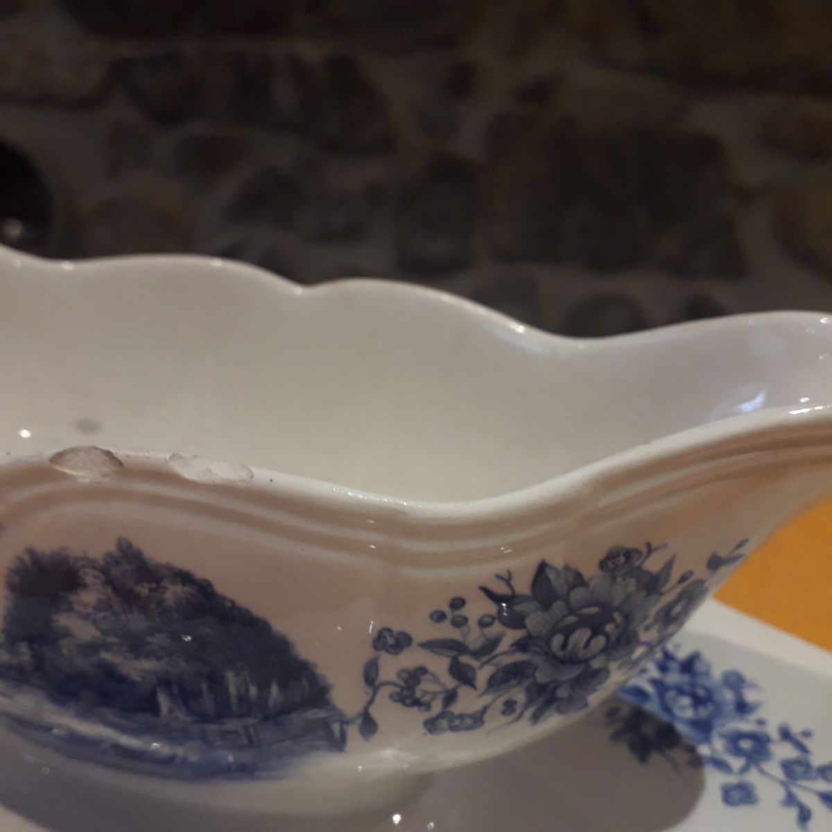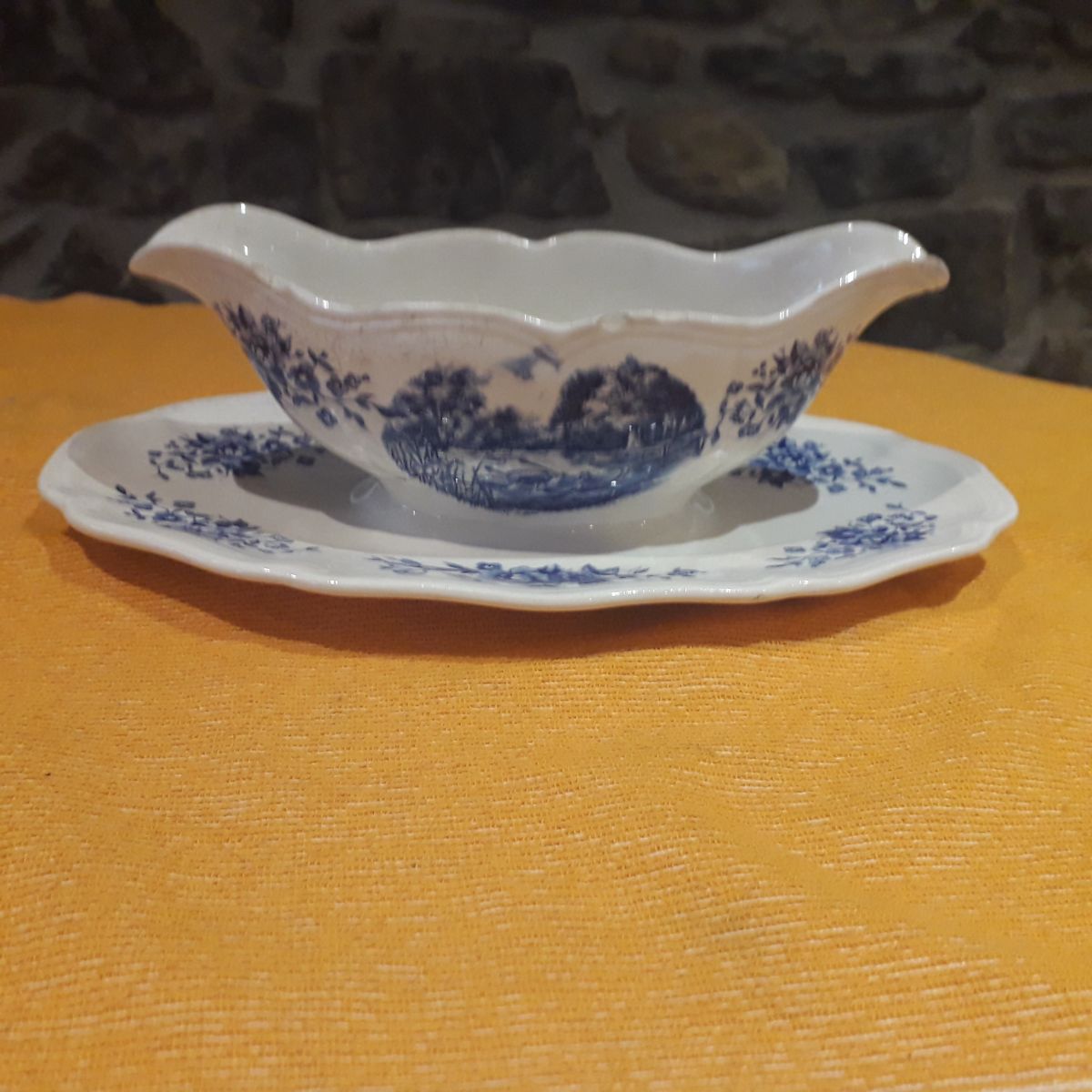 Jolie saucière ancienne en porcelaine avec son dessous accroché. Style romantique. Ébréchée à plusieurs endroits en raison de son grand âge! Motif fleurs et bord de rivière avec barque.