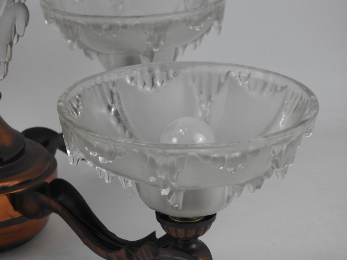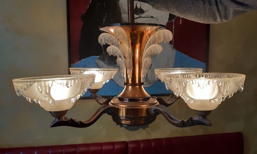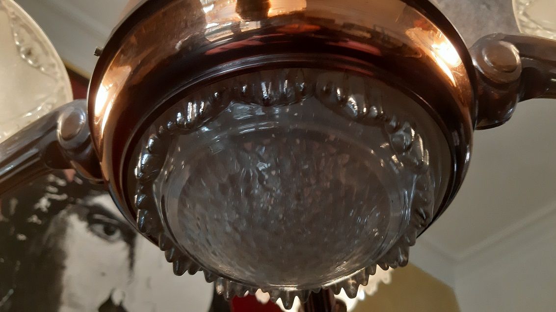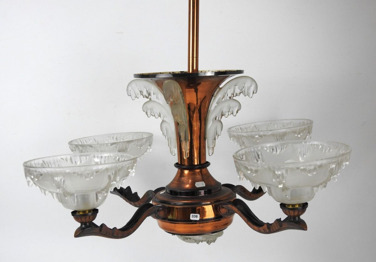 Lustre Ezan en cuivre à 4 bras de lumière, les tulipes en verre moulé, signé. H 55 Diam 60