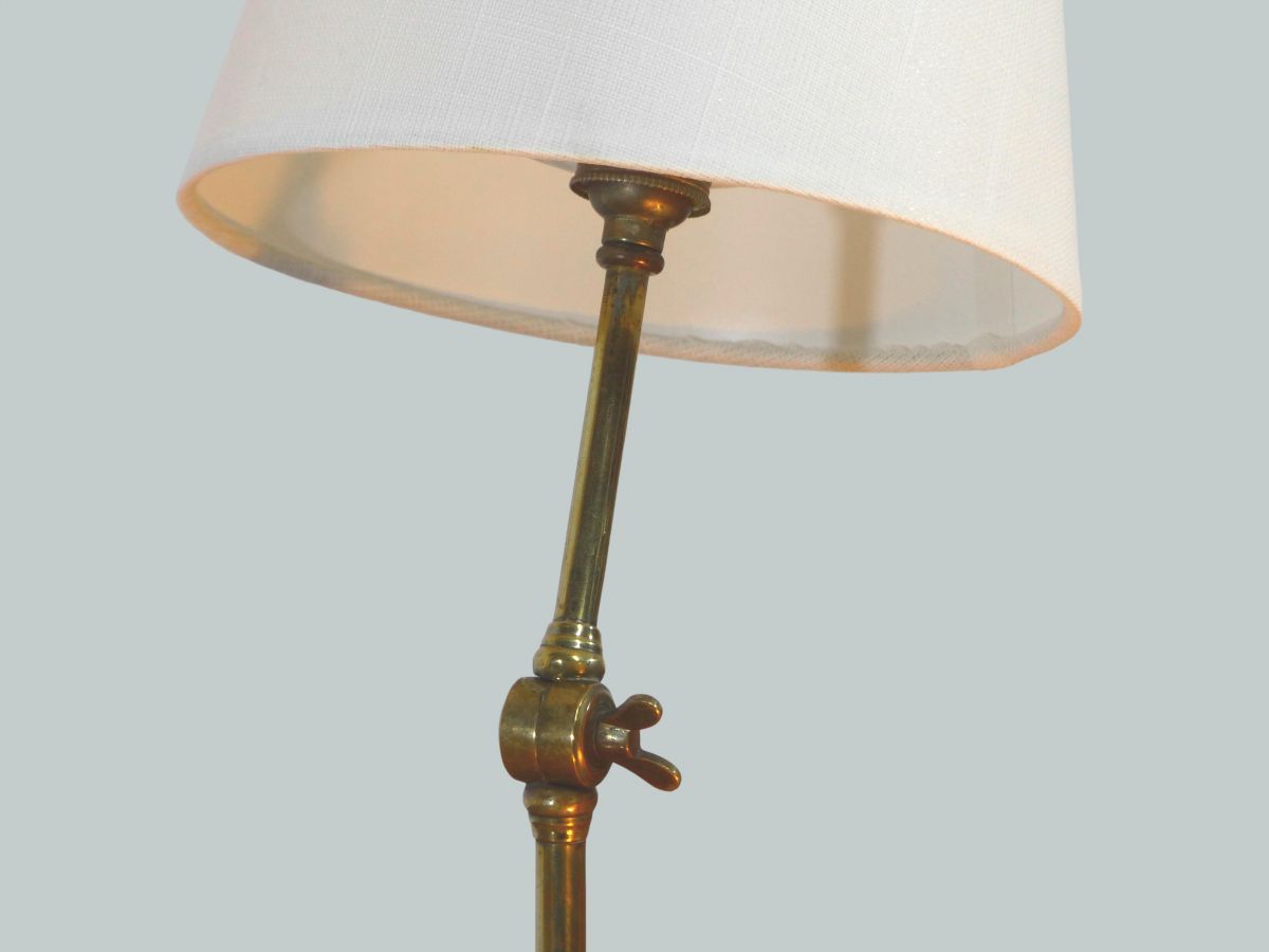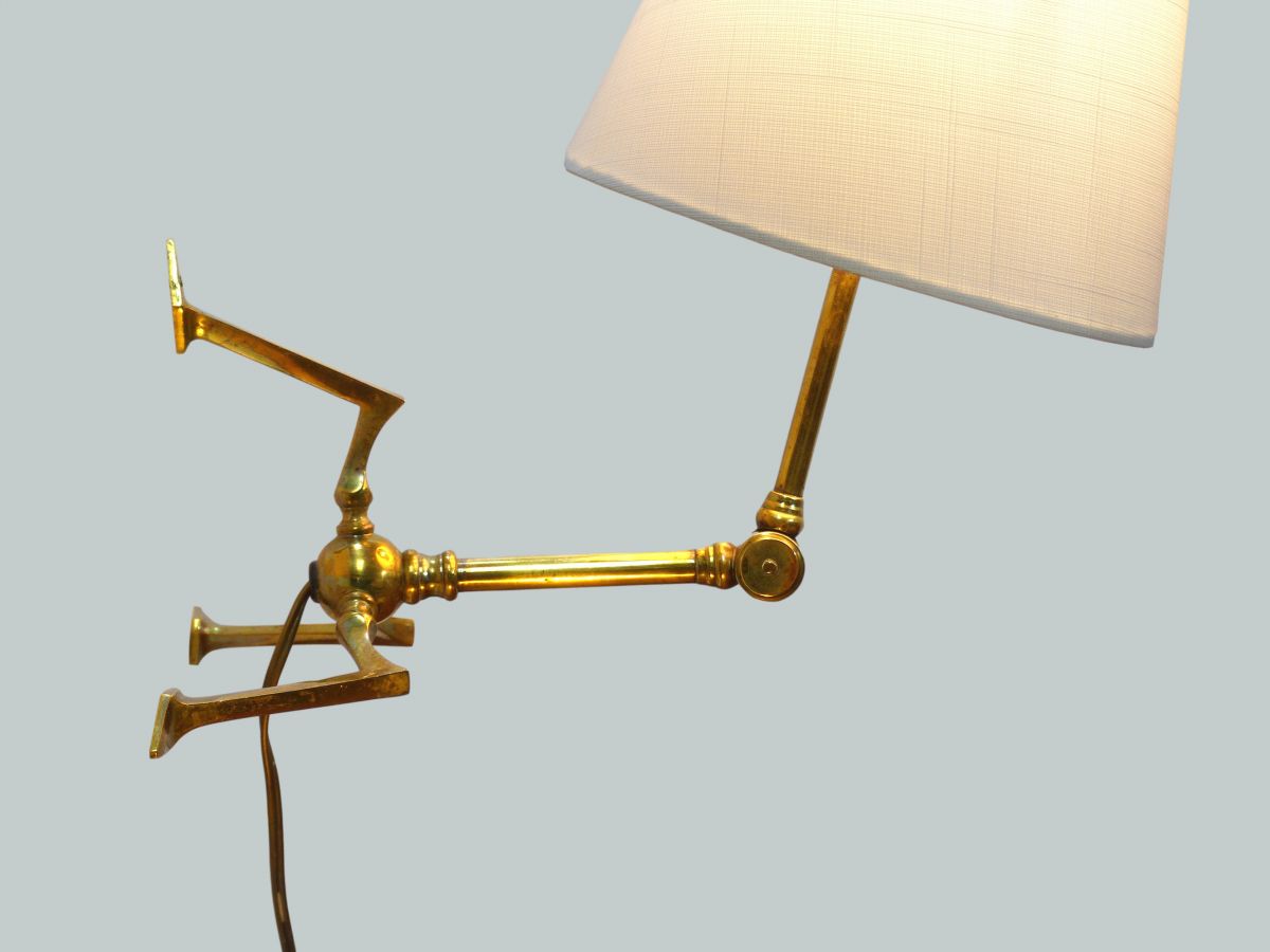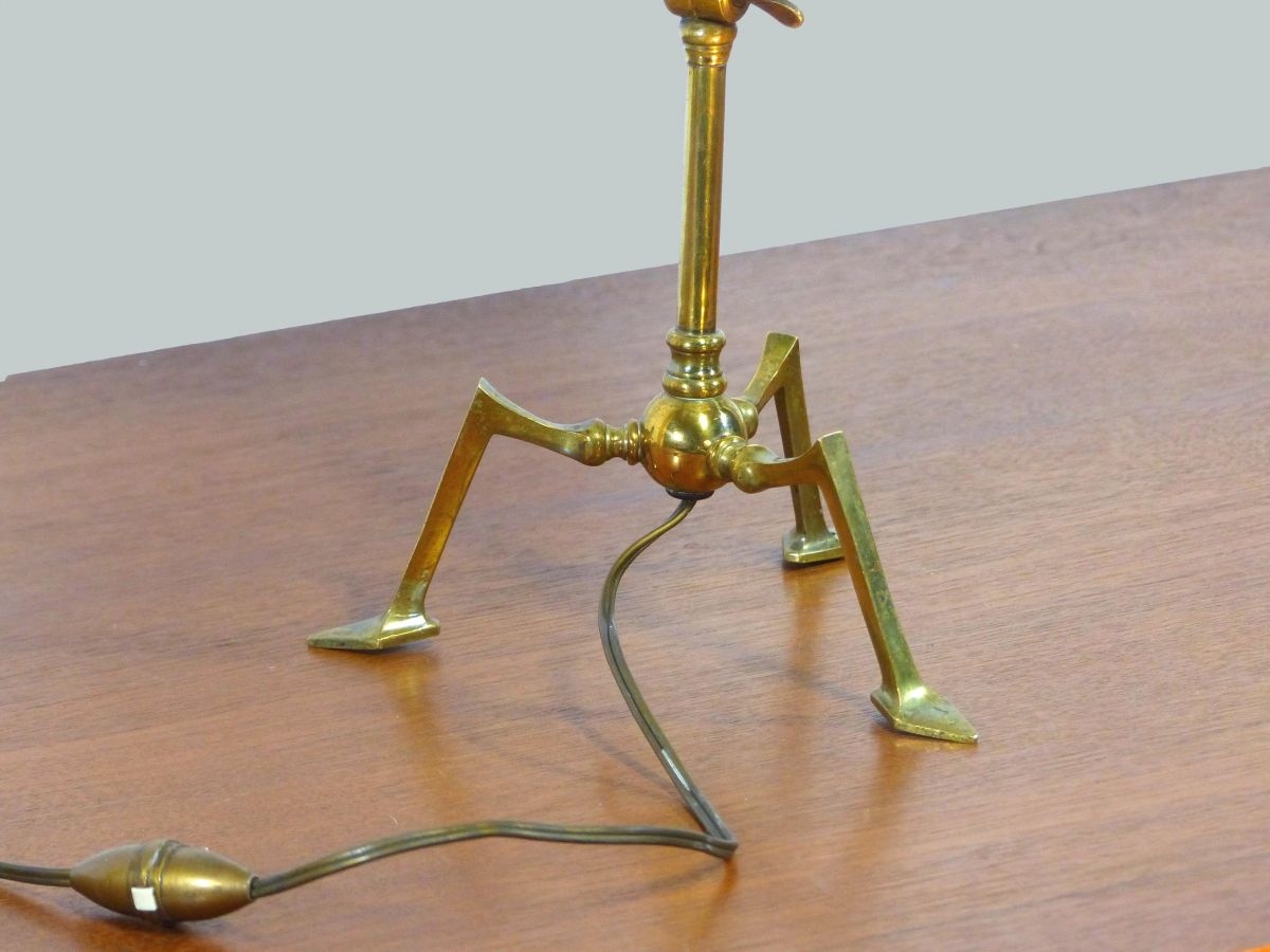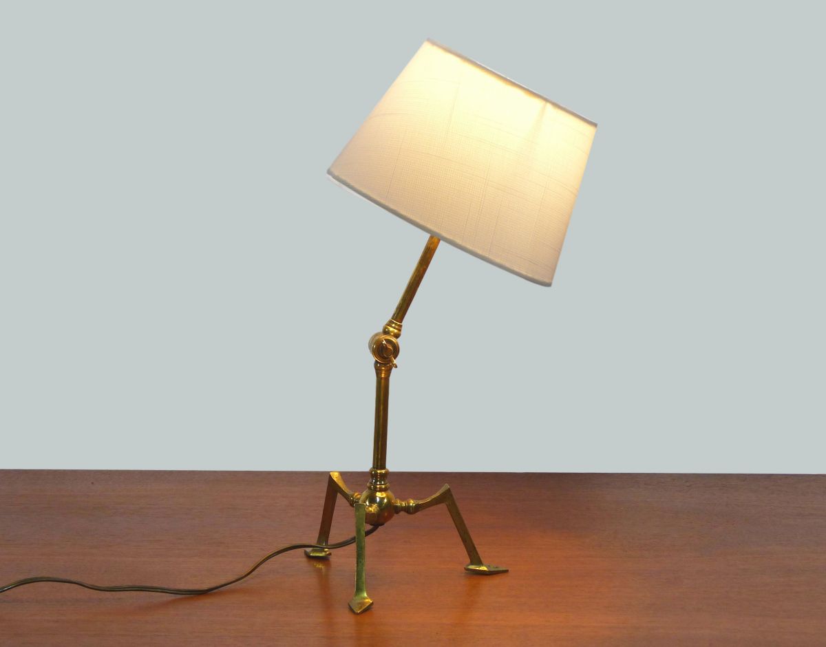 Ingénieuse lampe articulée en laiton avec base tripode, trou sur un des pieds permettant de transformer cette lampe en applique. Modèle créé par W.A.S Benson.
