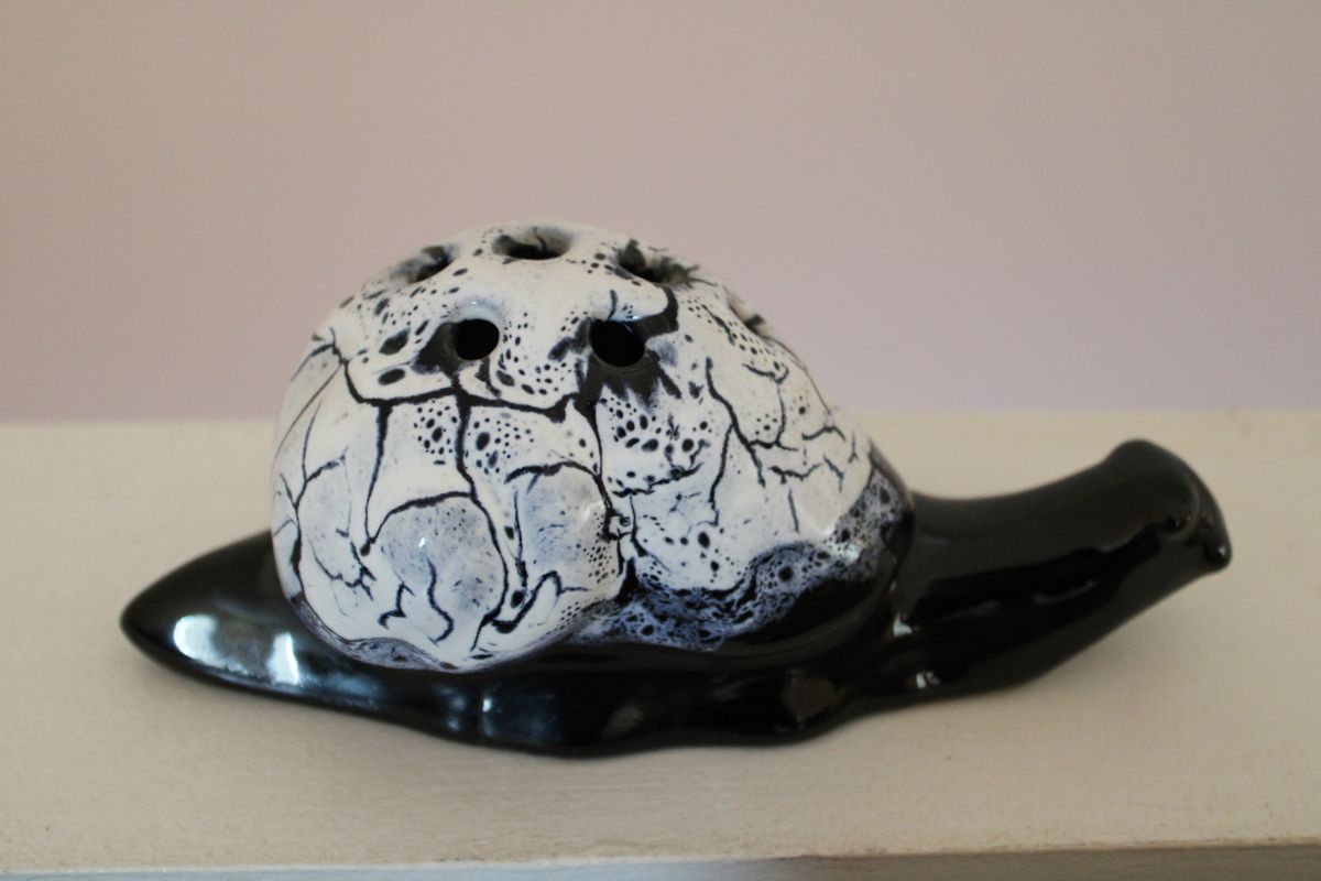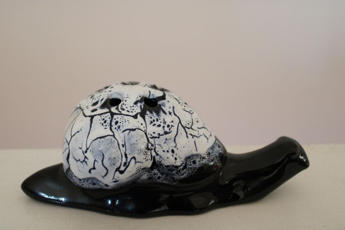 Escargot en céramique émaillée, avec 8 trous pour piques, années 70. Etat impeccable.