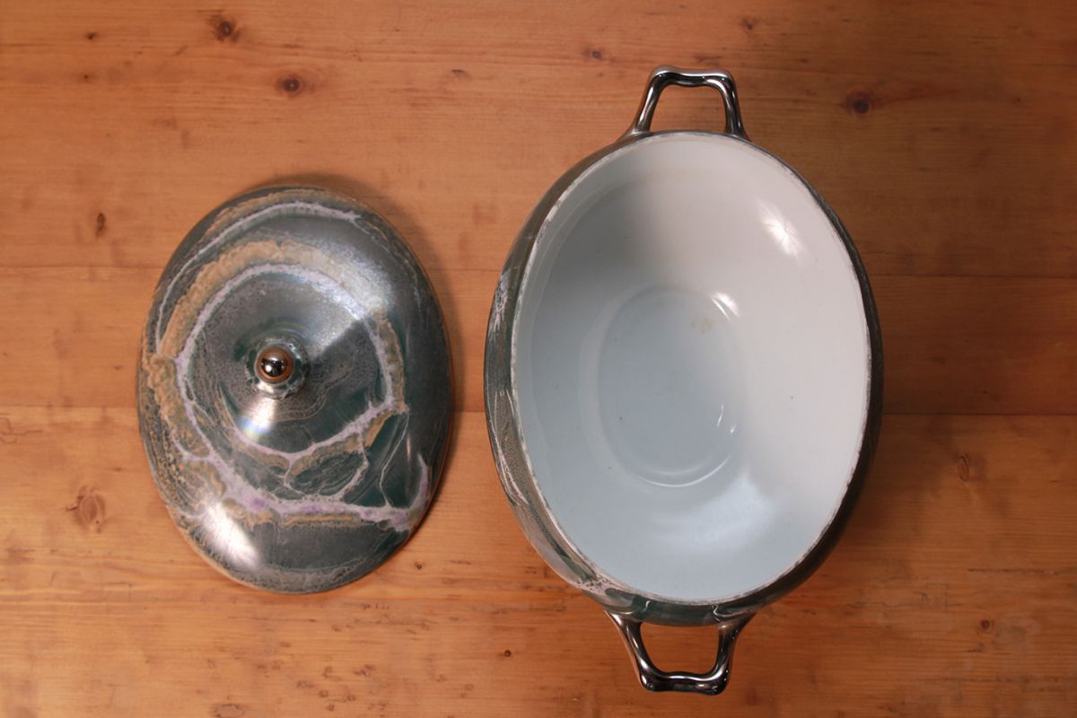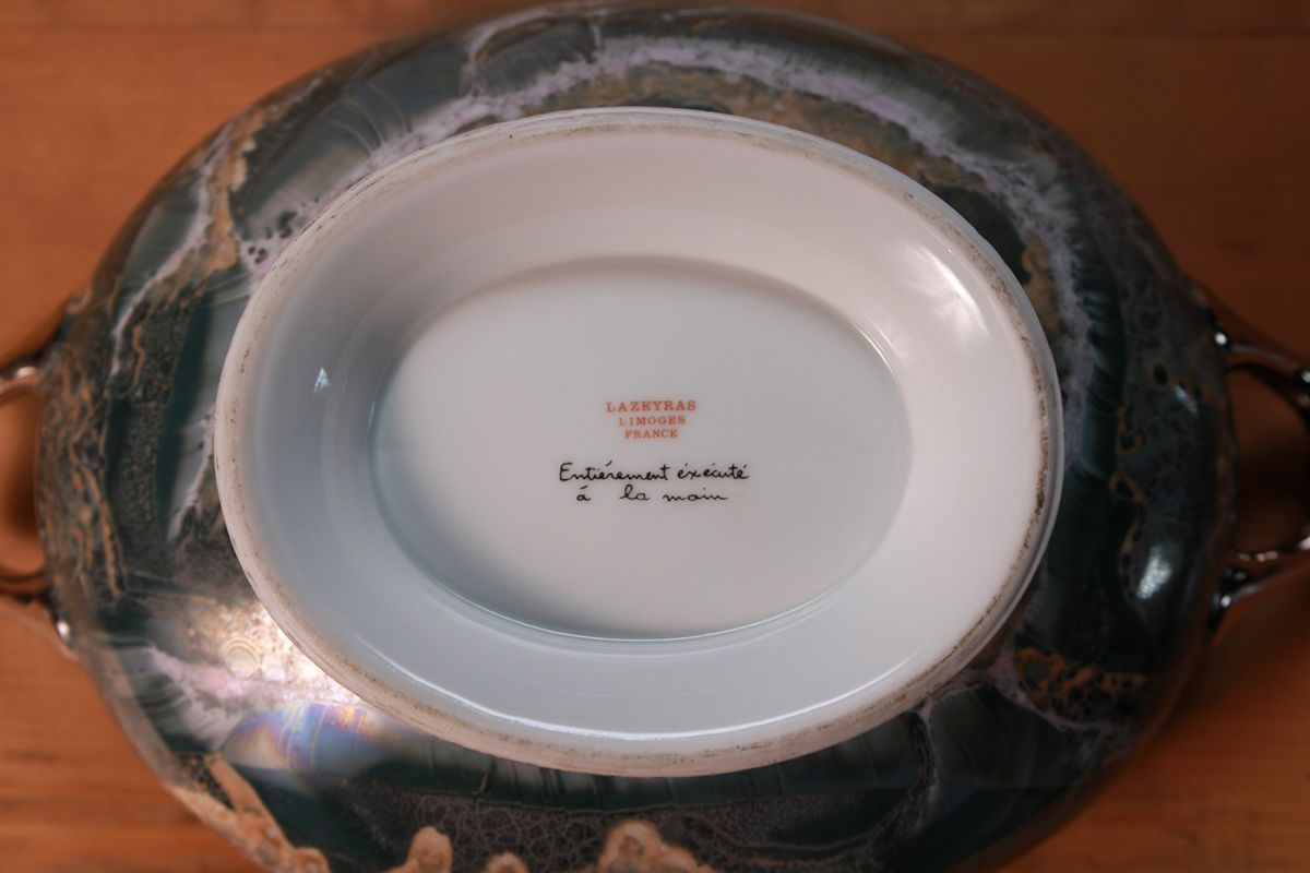 Soupiere en prcelaine de Limoges, Verte marbrée blanc/gris.