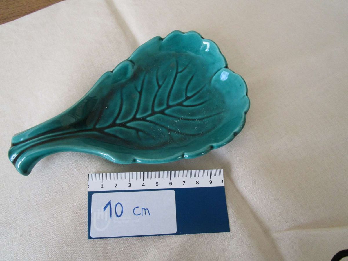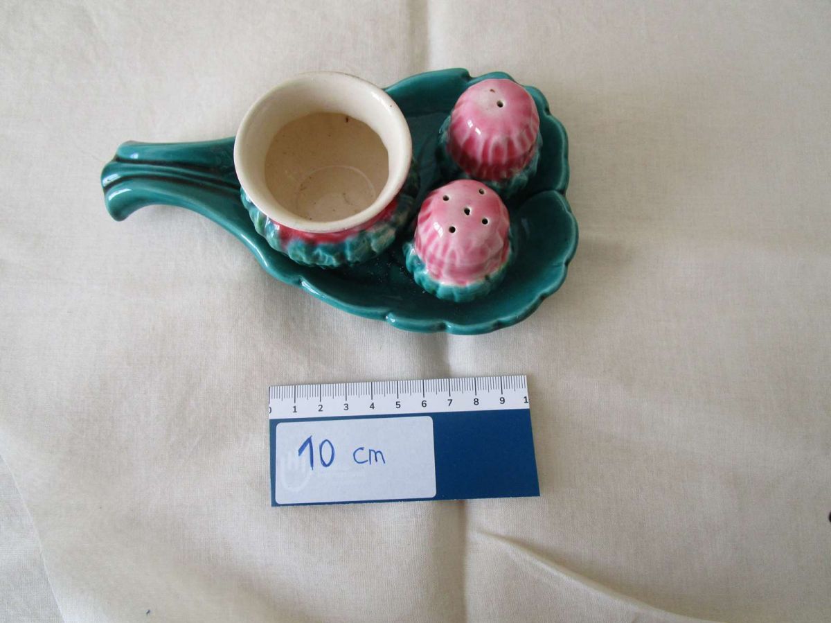 Sur un petit plateau motif feuille, une salière, un poivrier et petit pot à moutarde