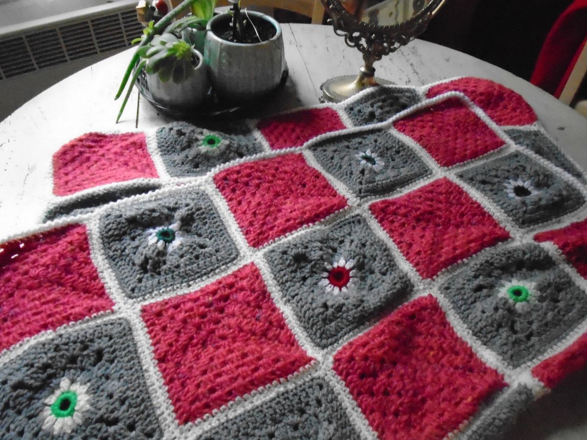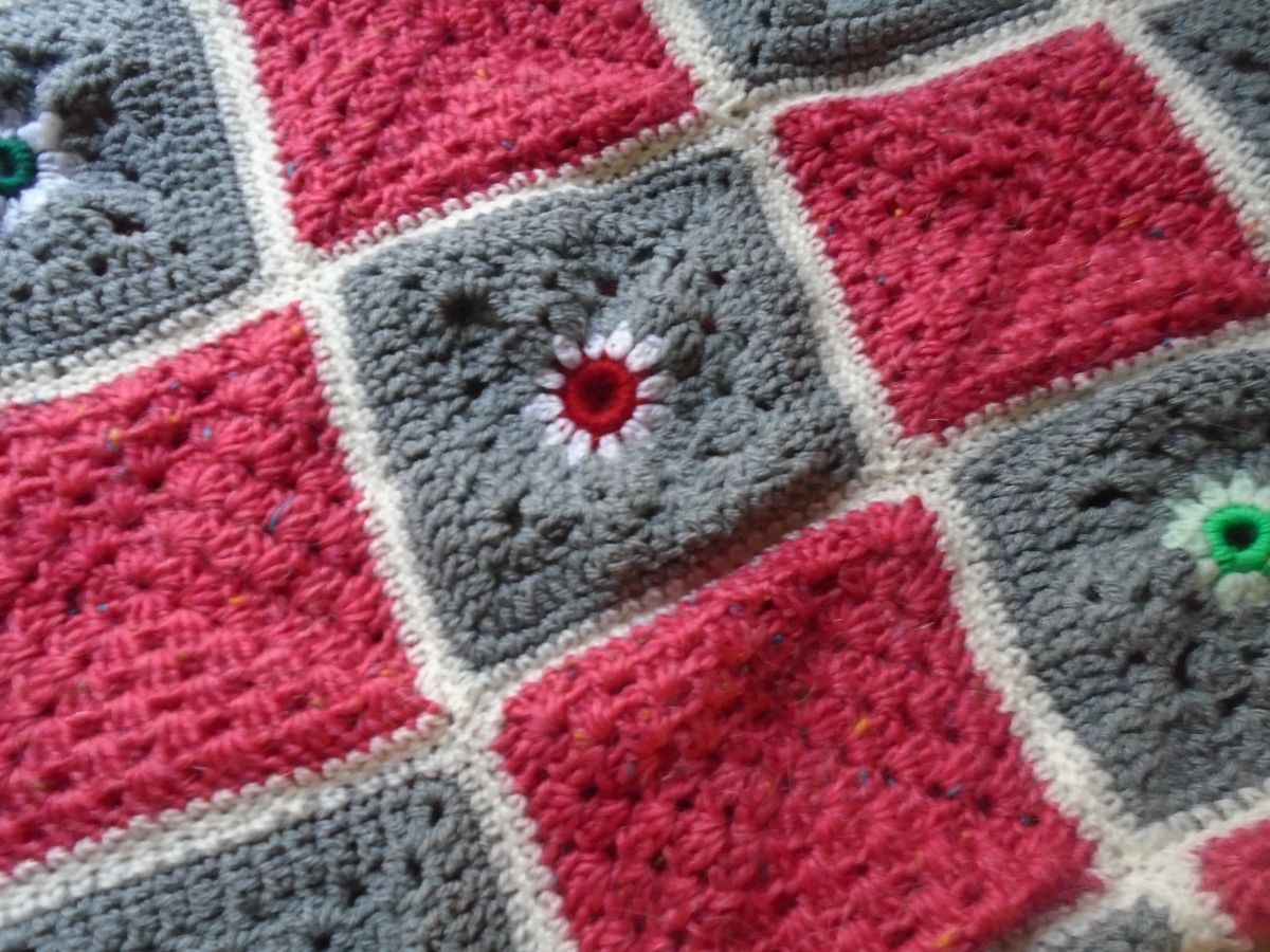 Plaid en crochet, framboise et gris bleu