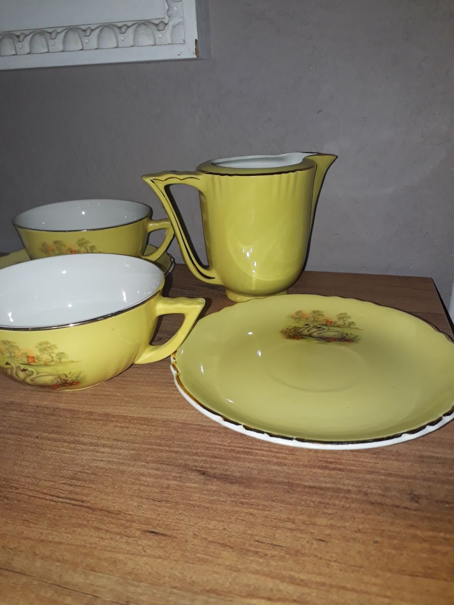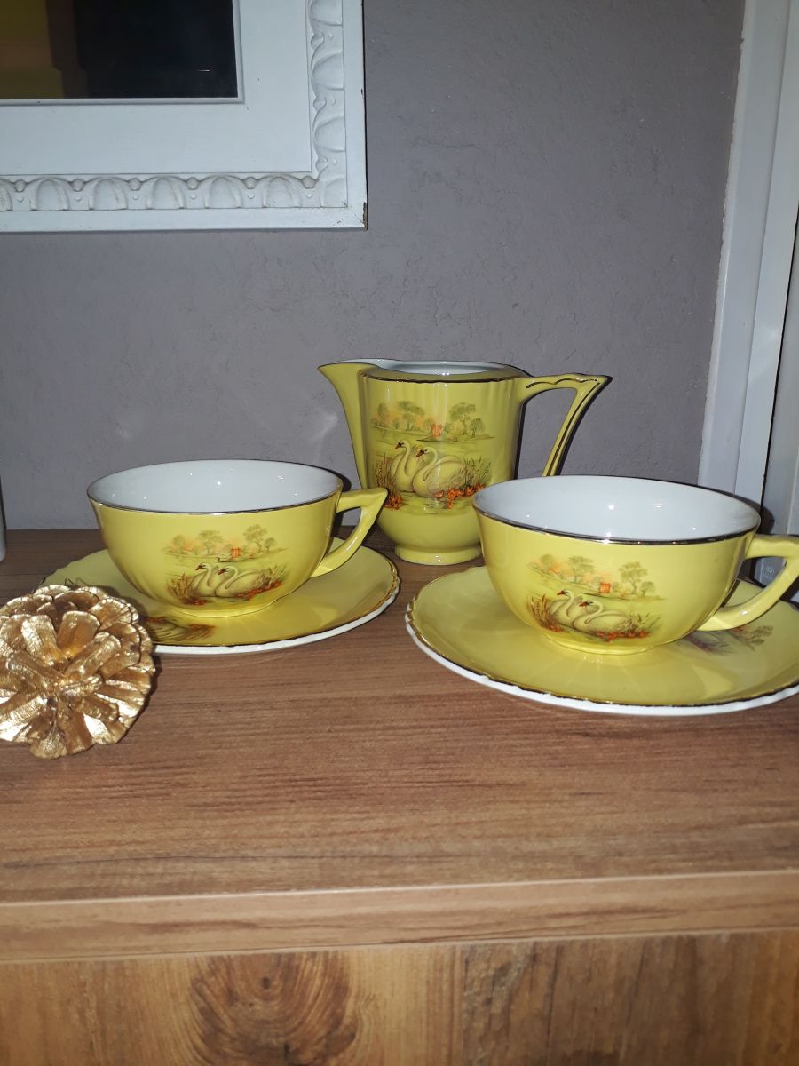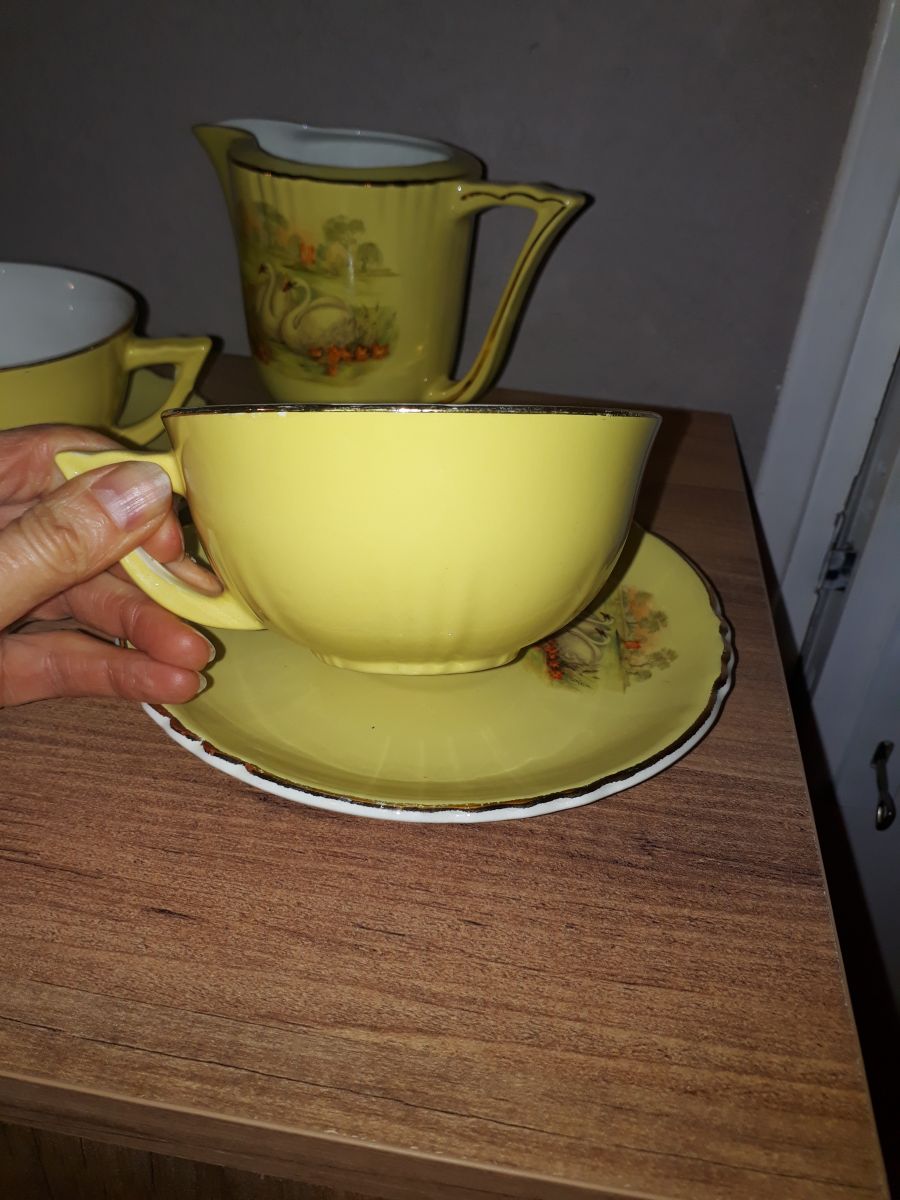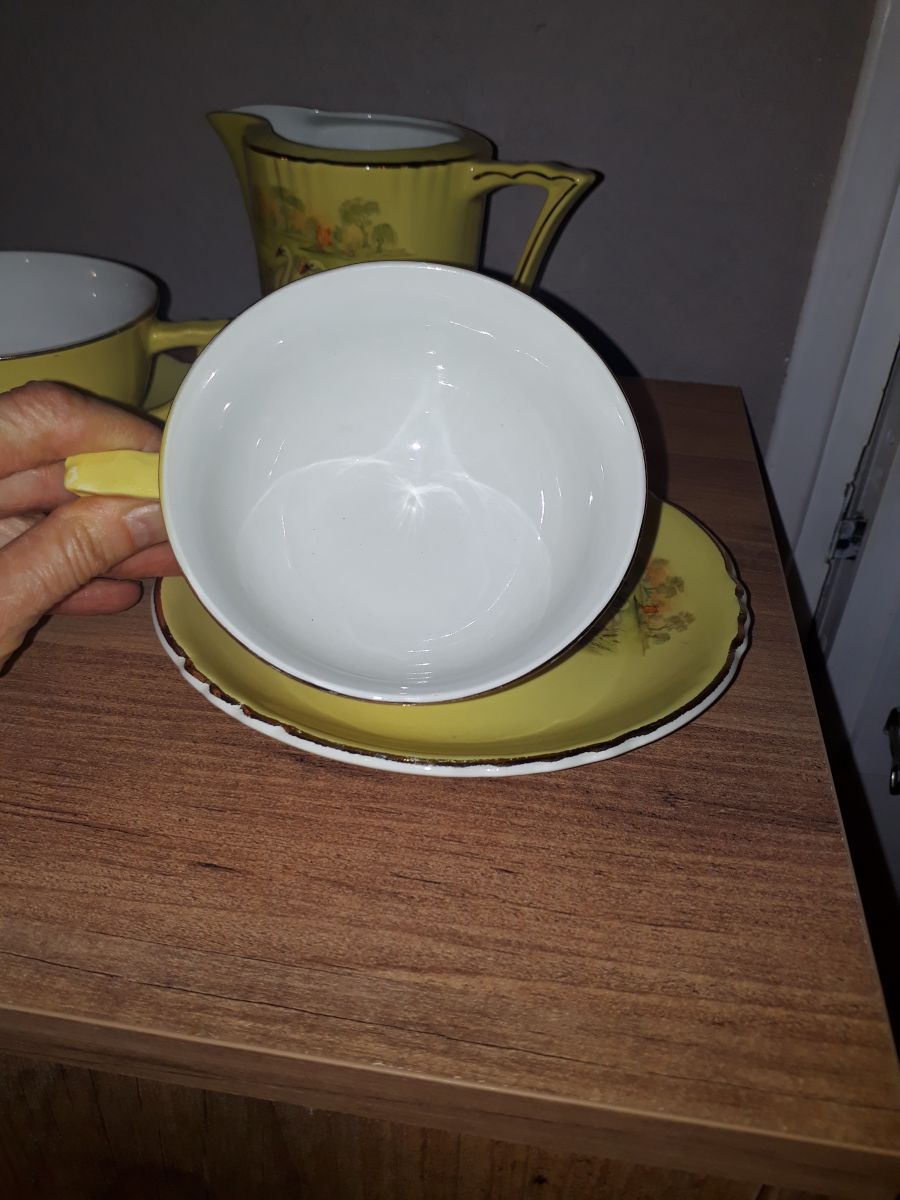 Superbe ensemble petit déjeuner composé de 2 tasses, 2 soucoupes et un pot à lait.