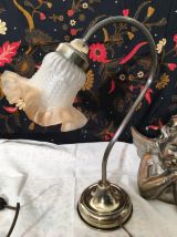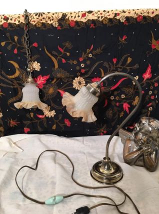 Pour une ambiance Art Déco, cet ensemble lampe à poser et sa suspension en laiton et corolle en verre ton oranger.