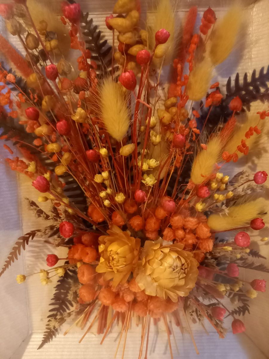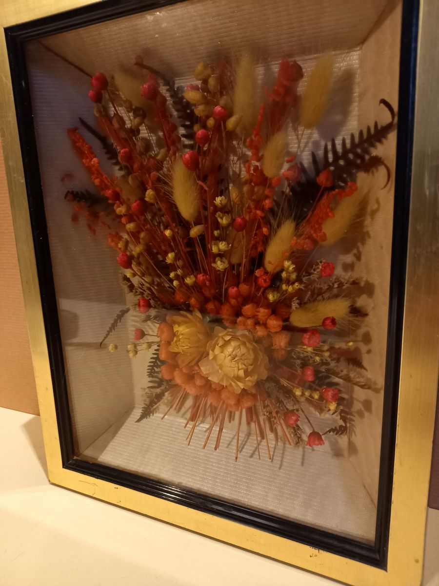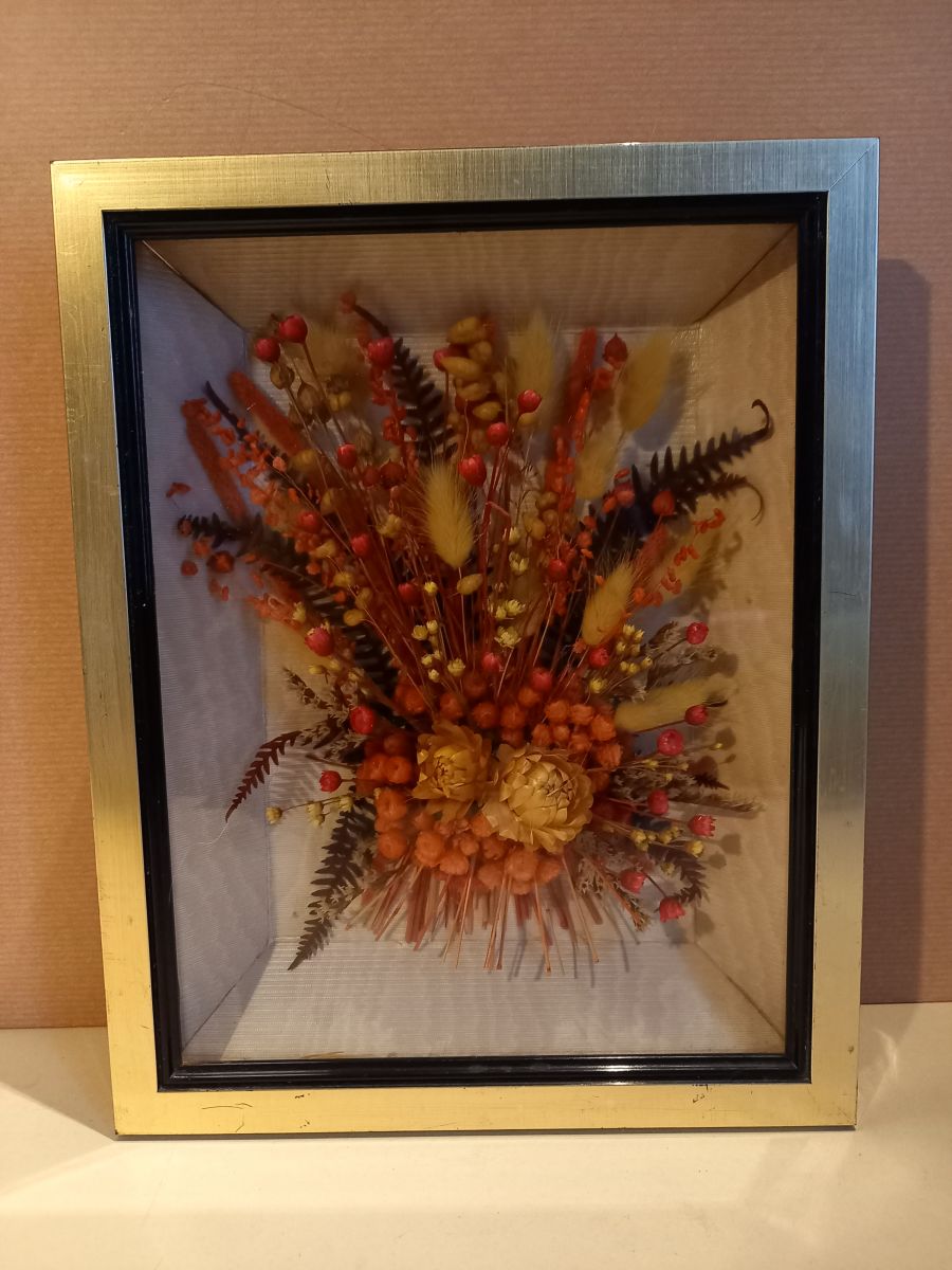 Vitrine intérieur velours crème et bouquet de fleurs séchées..