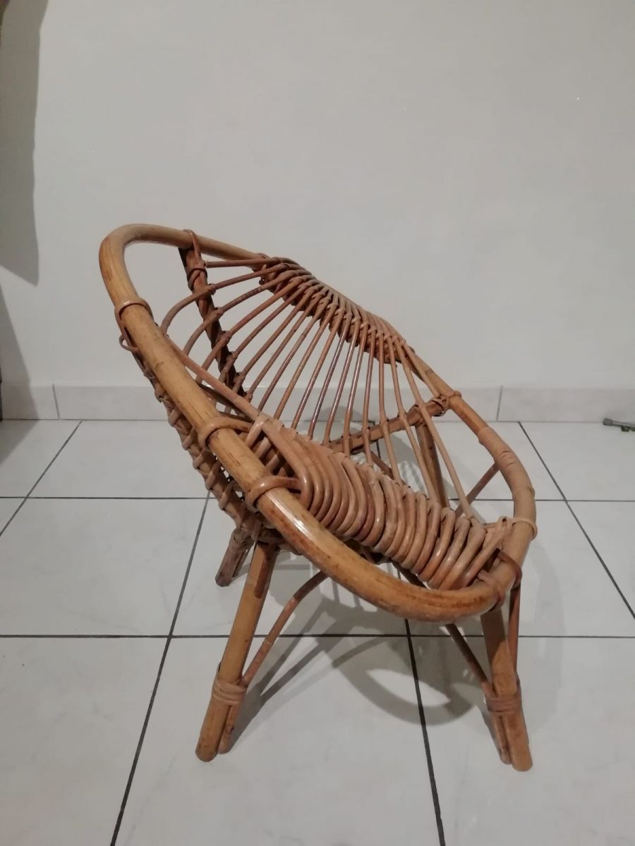 Très joli petit fauteuil enfant en rotin . Superbe forme en citron, bien campée sur ses petits pieds il ravira la chambre de votre bambin .