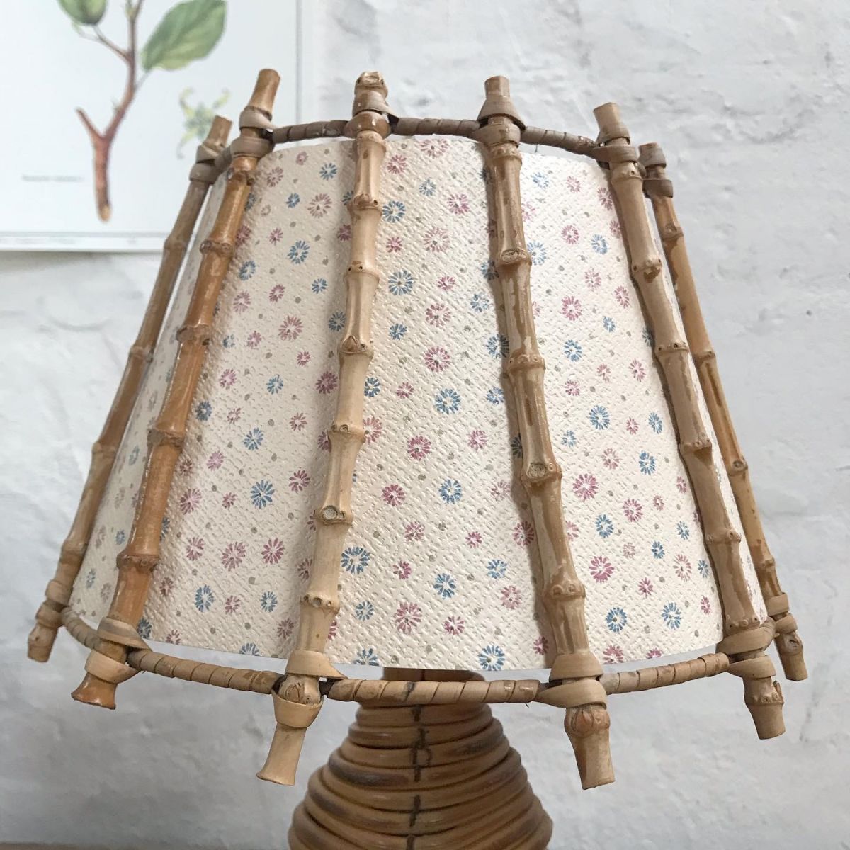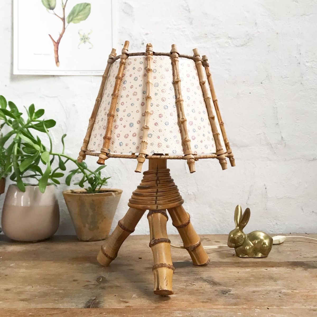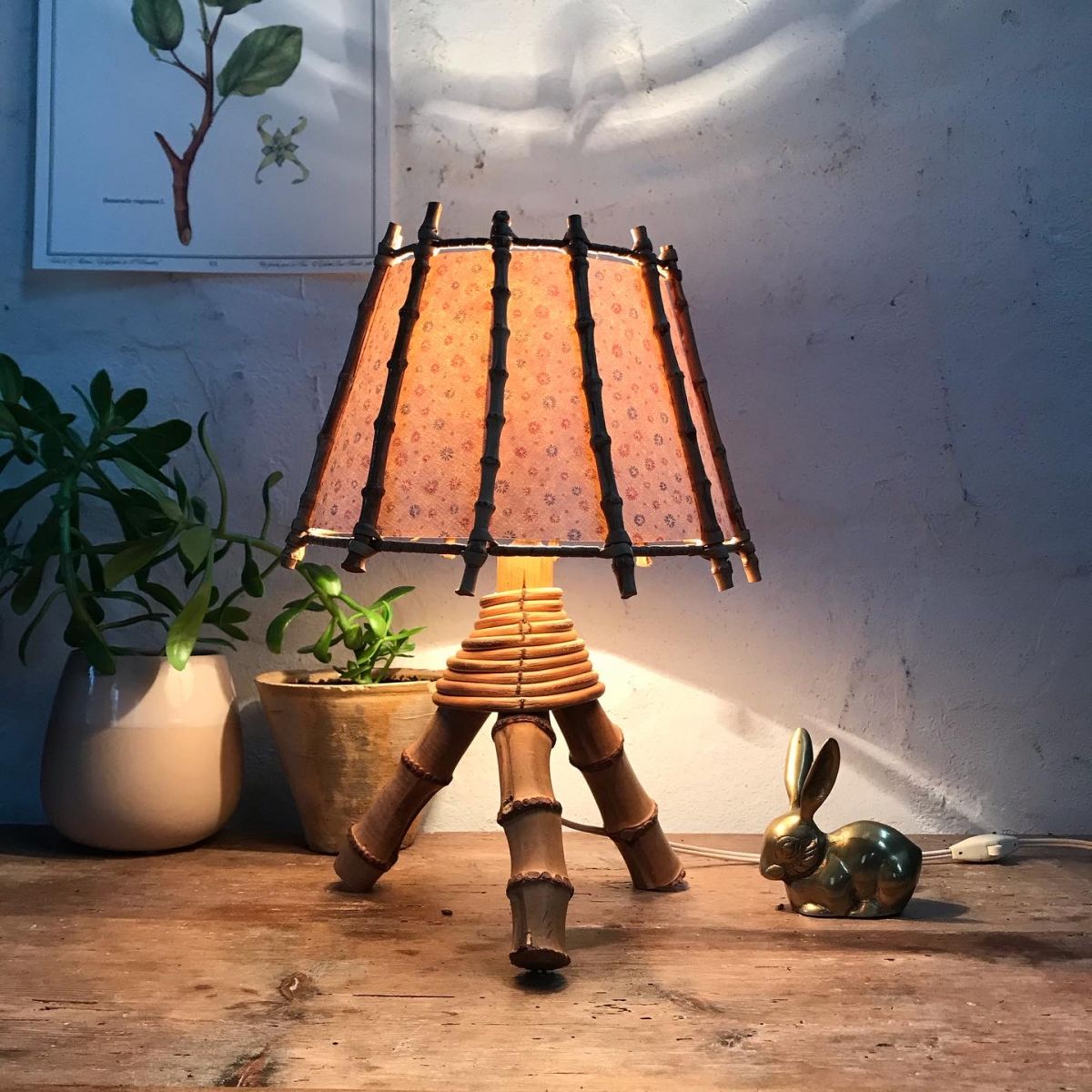 Petite lampe tripode des années 1970 en rotin et bambou, avec un abat jour en papier aux couleurs toutes douces. En lampe de chevet, en lampe d’appoint ou dans une chambre d’enfant...