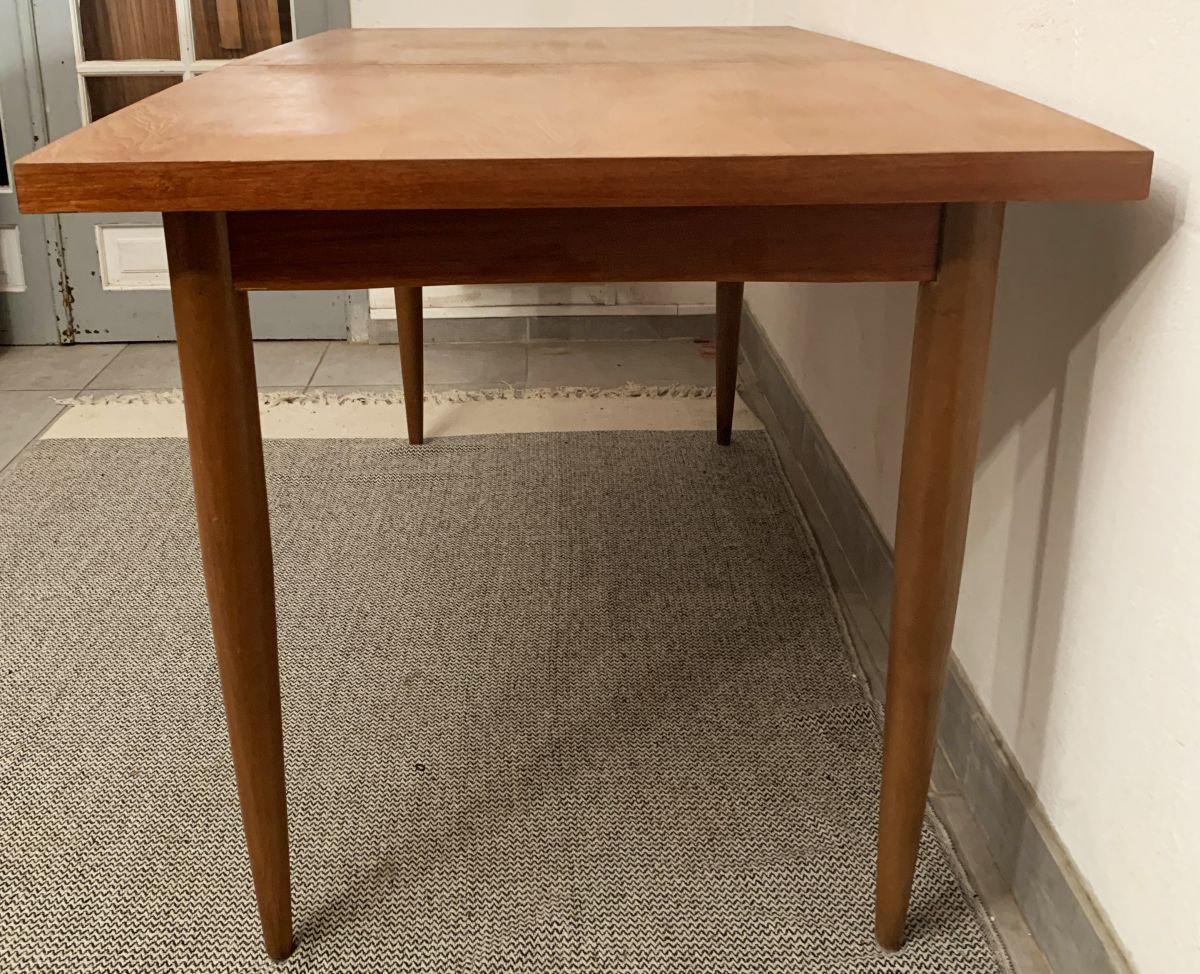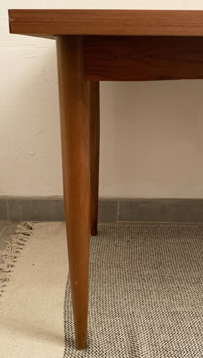 Table de salle à manger vintage danoise en chêne clair 1960 en bois massif. Rallonge manquante. Système d'attache pour d'éventuelles rallonges à rajouter. Très belles lignes épurée. Pieds fuselés. Très belle épaisseur de table. Dimensions: hauteur: 74 cm, longueur: 140 cm, largueur: 83 cm.