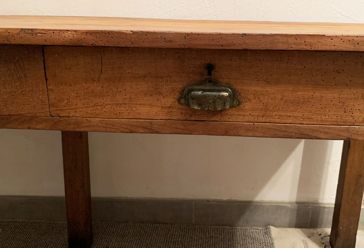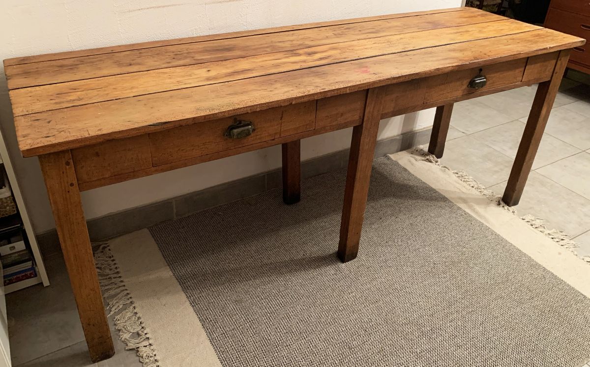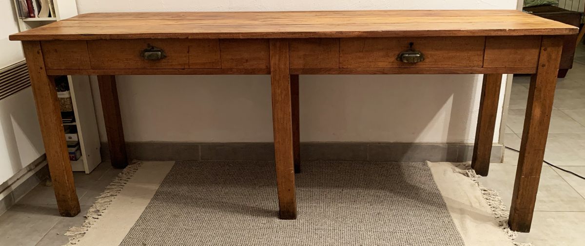 Grande table de ferme vintage ou double bureau. 2 tiroirs intégrés. Peut servir de double bureau, de table de salle à manger, de comptoir de magasin, ou encore de table d'atelier, de peintre ou de couture. Le charme de l'ancien ! Dimensions: longueur: 205 cm, largueur: 63 cm, hauteur: 80 cm.